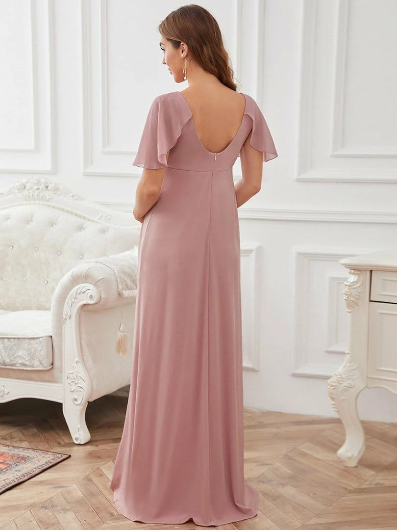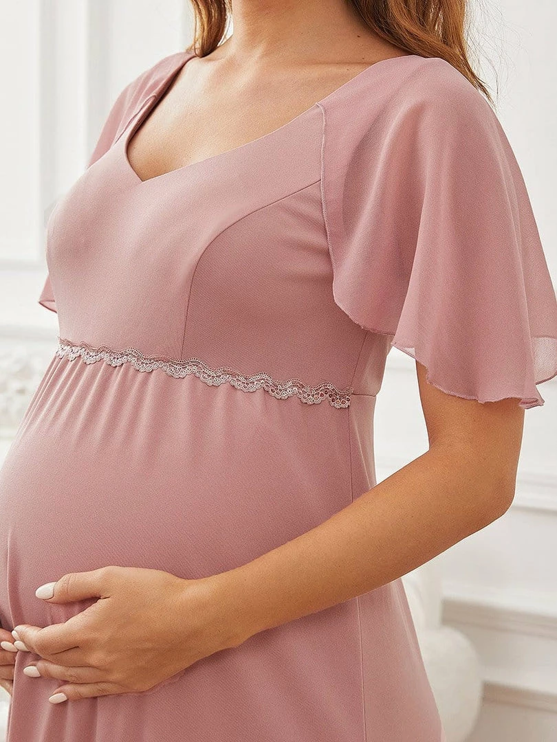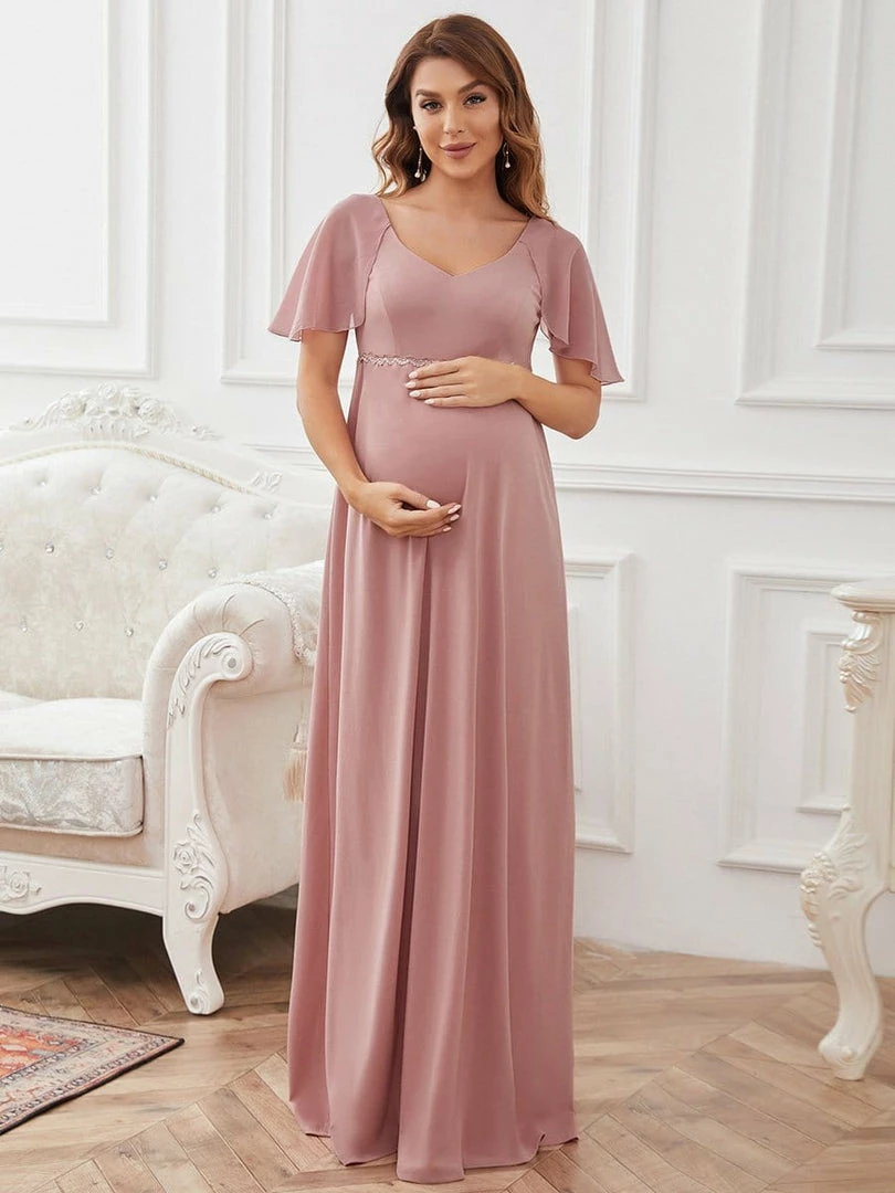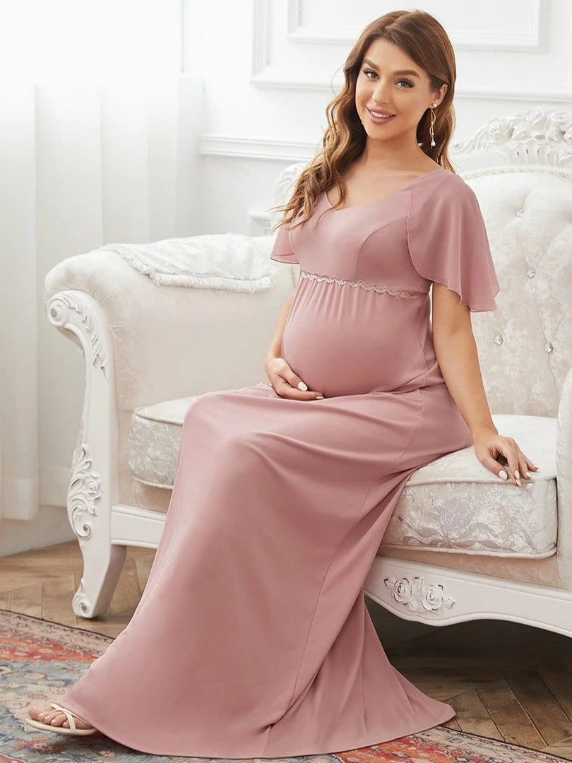 Get ready in sophisticated style for any occasion wearing this floor-length A-line maternity dress. The flutter sleeves and v-neck collar makes this pretty maternity dress suitable year-round, finished with a cinched waist with applique detail that brings attention to your baby bump with a touch of sheer elegance