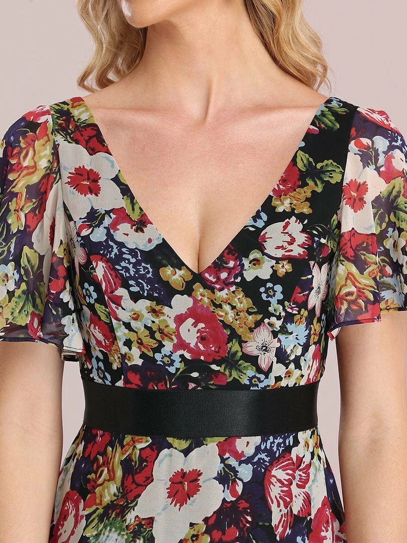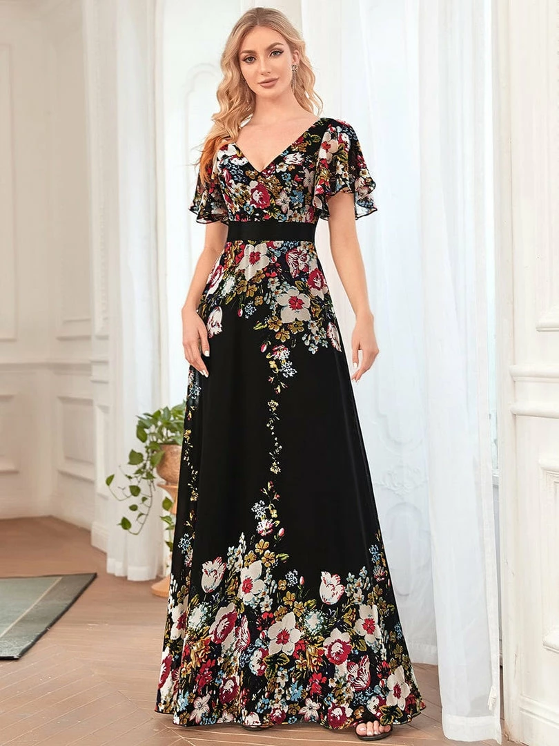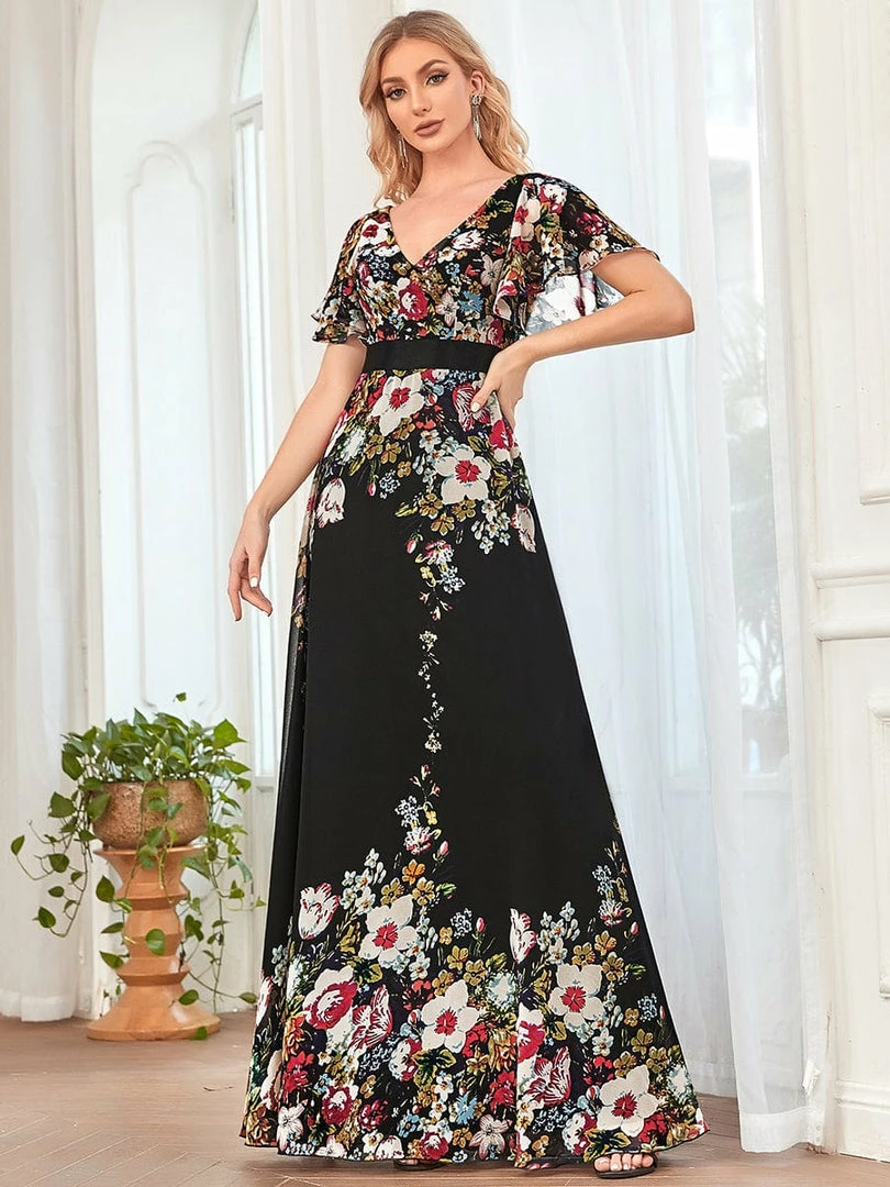 This colorful floral print evening dress gives off summery vibes but is also perfect for year-round wear. The sheer flutter sleeves and v-neck collar give way to a smooth satin ribbon-cinched waist and flowing A-line silhouette, making it versatile and timeless in style. Pair this cute dress with flats, thongs, wedges, or heels, and finish your look with jewelry.