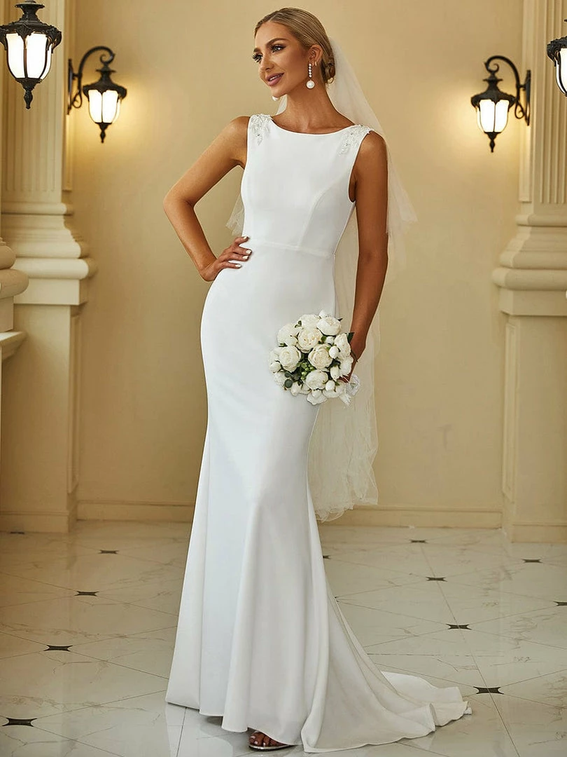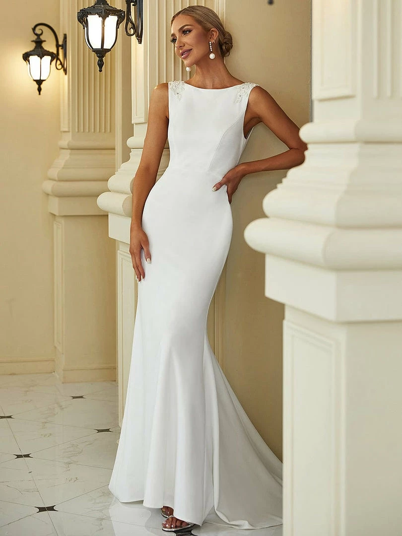 Celebrate your special day with this elegant bodycon wedding dress featuring a sophisticated high neckline and plunging v-backless fit. Darts on the front and cinched waist give way to a dramatic floor-length fishtail silhouette, making it perfect for an indoor or outdoor wedding.