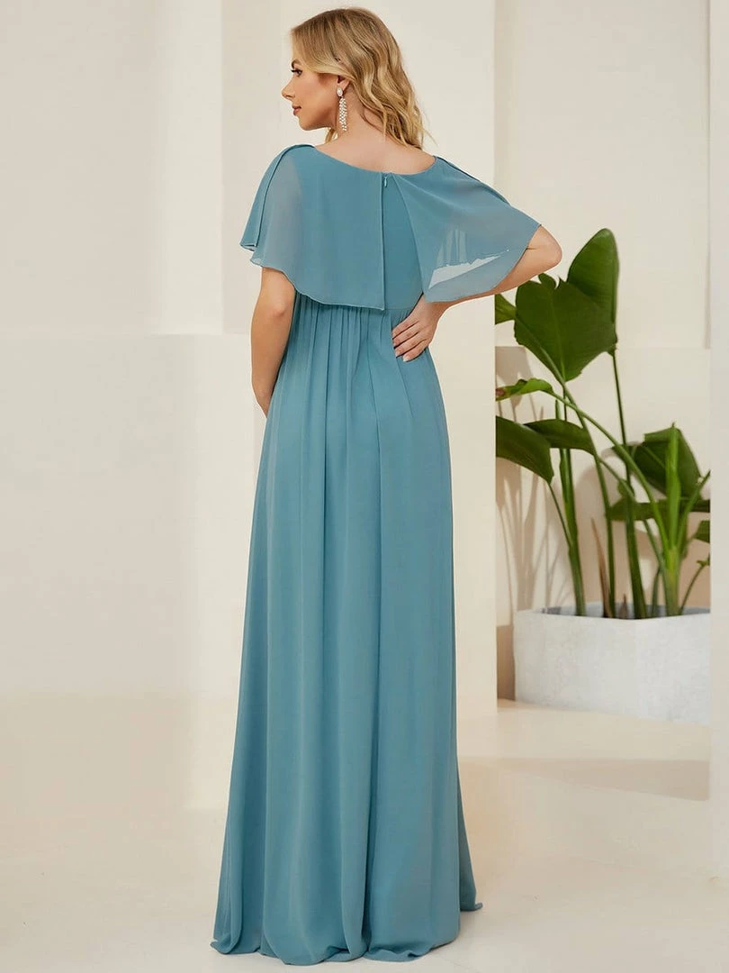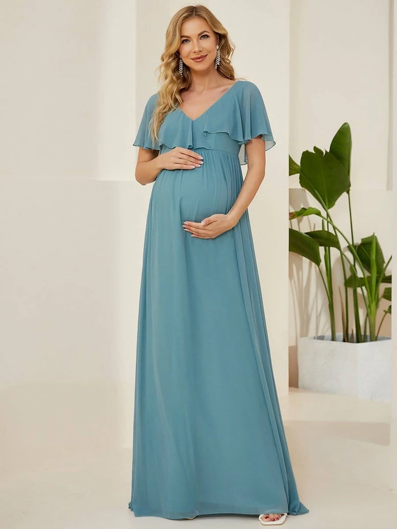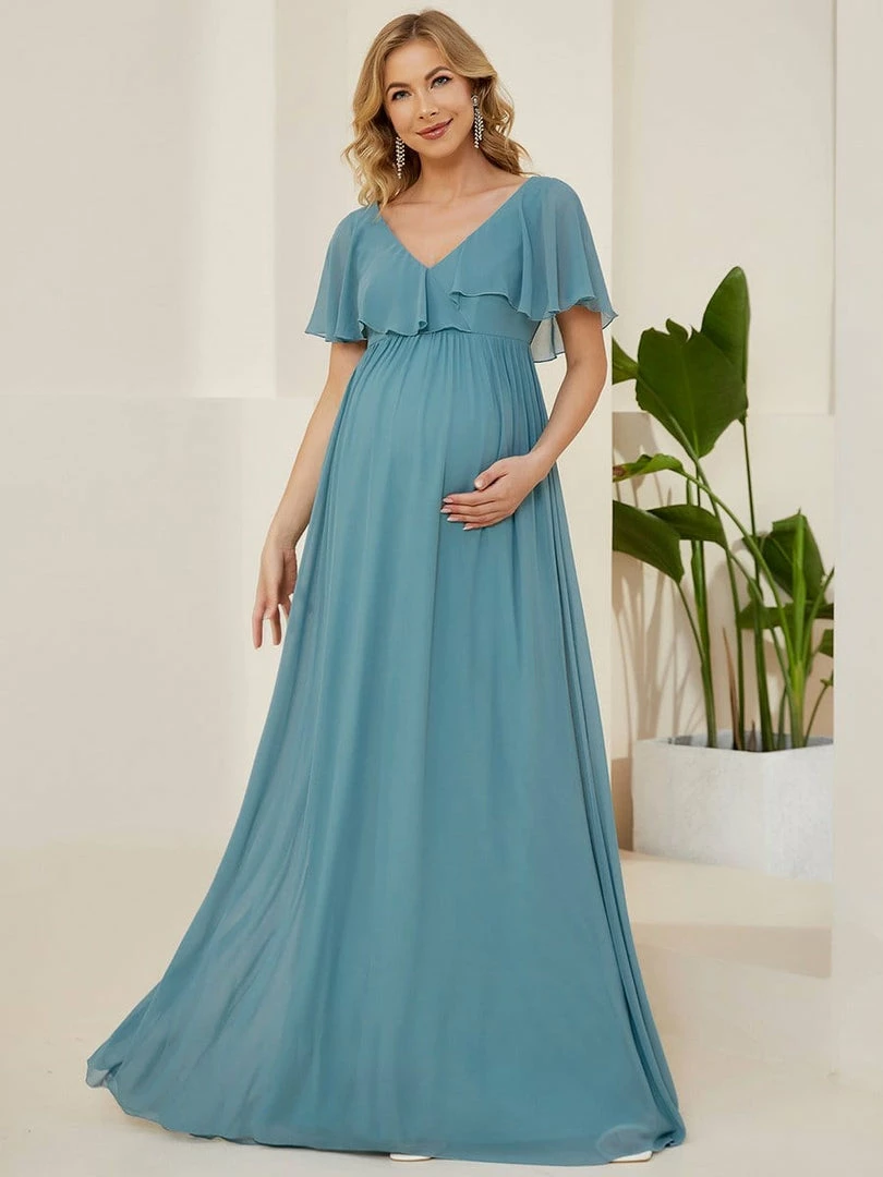 This bump-friendly A-line maternity dress features a feminine ruffled top with a v-neckline and fluttering short sleeves. A comfortable elastic waist and floor-length silhouette show off your heels or flats of choice, perfect for any wedding, banquet, party, dinner, premiere or formal.