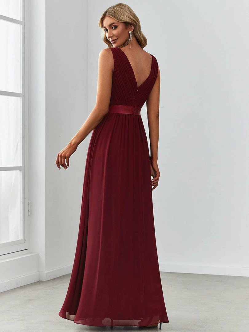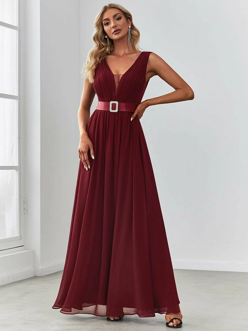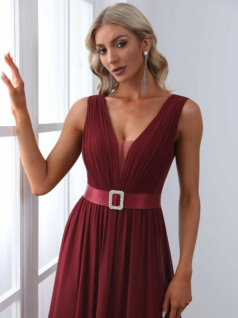 This stunning floor-length evening dress features glamorous all-over pleating, a sleeveless top and pleating all-over. A plunging v-neck with an illusion panel and deep v-back adds elegance; a satin sequin belt cinches the waist with the perfect amount of details for your next special event.