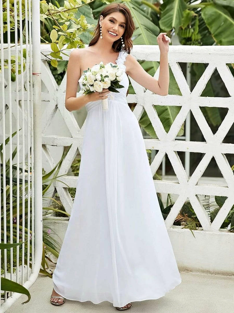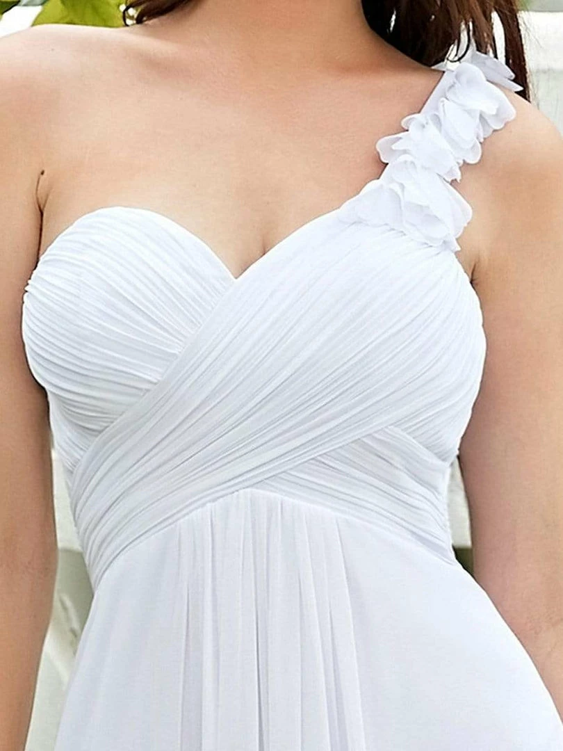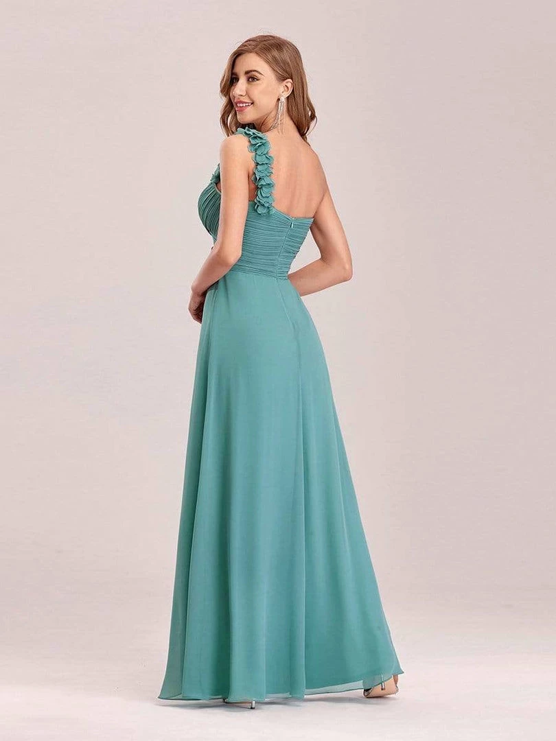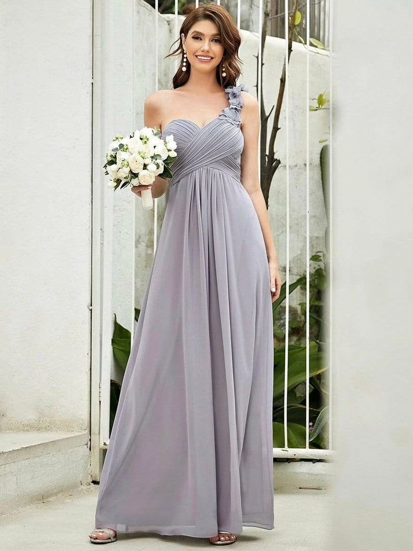This stunning one shoulder bridesmaid dress features a flattering pleated sweetheart neckline with a draping lower design in the lower half of the silhouette. The flower detailing on the single shoulder strap gives the bridesmaid dress a sweet touch. Really perfect for all formal occasions, from evening party, cocktail, weddings to prom, homecoming, and graduation!