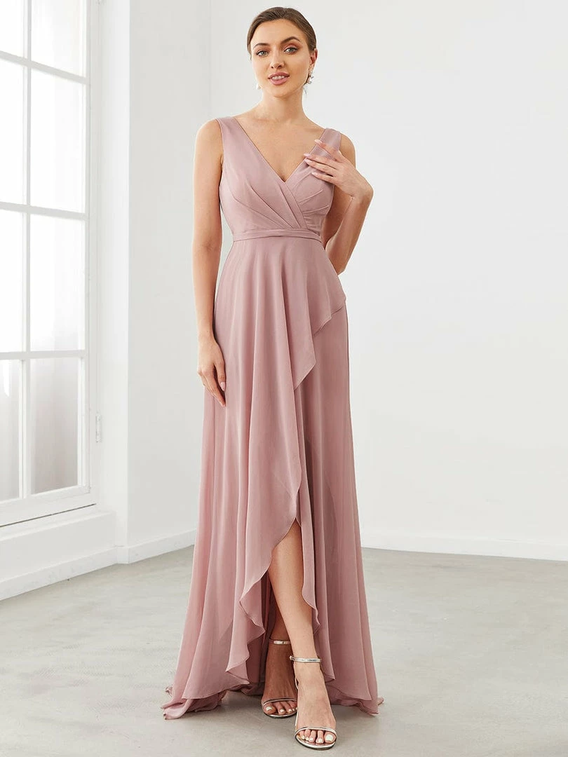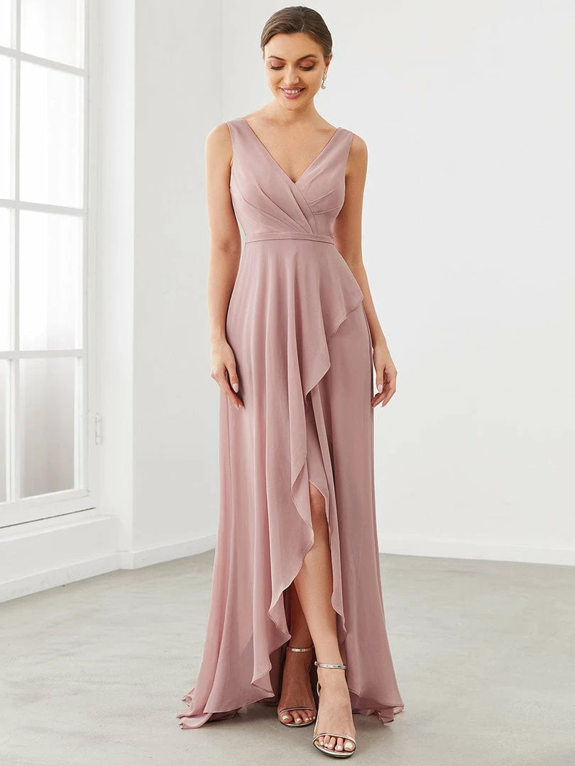 Select this chiffon bridesmaid dress for your wedding day, perfect for all of your bridesmaids. A ruffled, uneven hem and front slit make this sleeveless bridesmaid dress suitable for an indoor or outdoor wedding. A cinched waist and gentle pleating on the v-neckline add comfort and elegance.