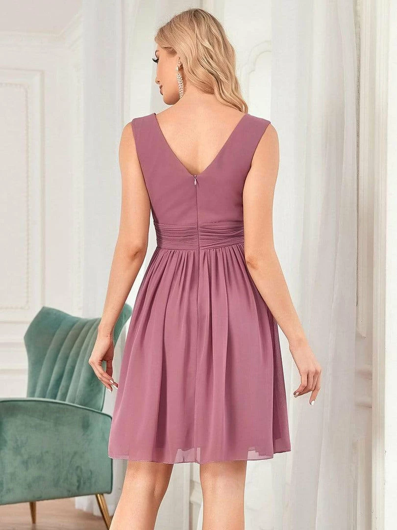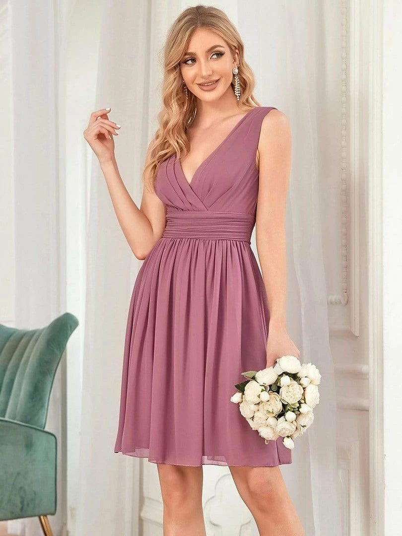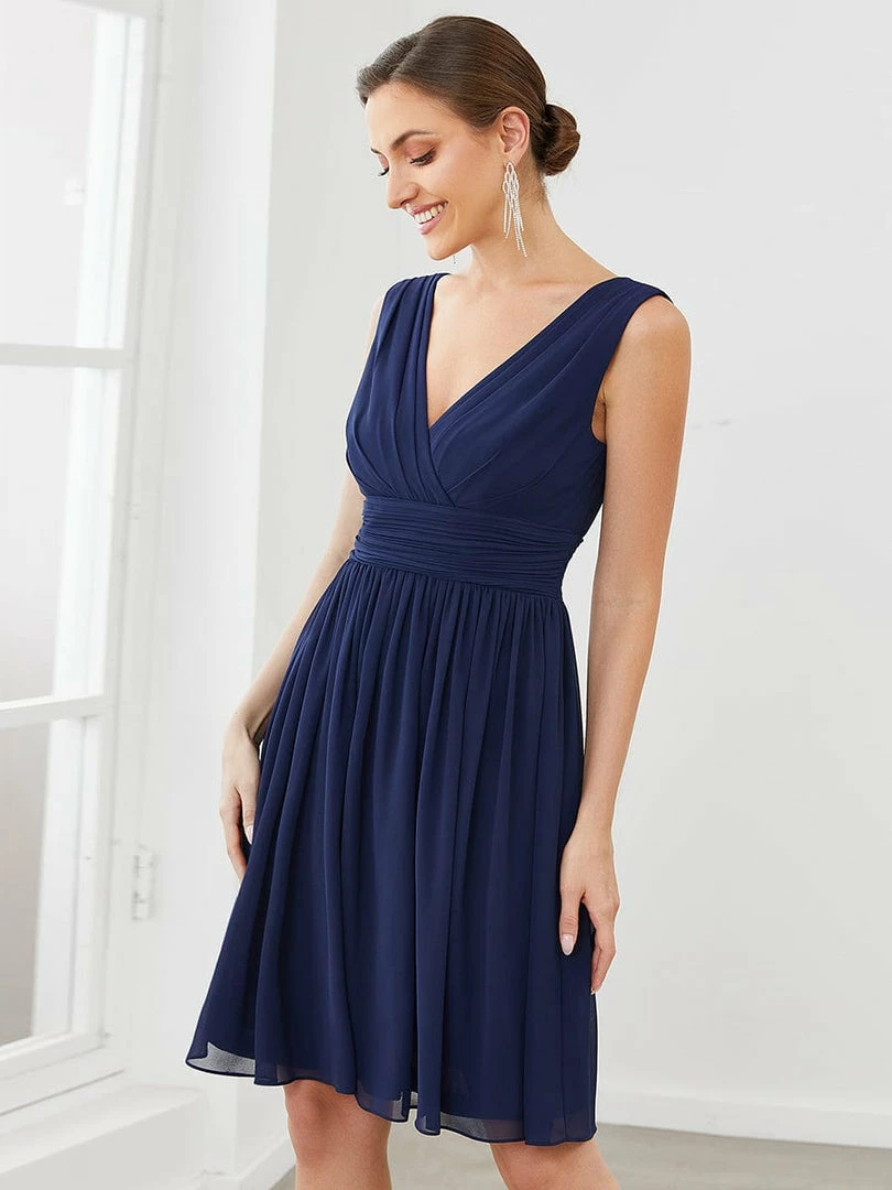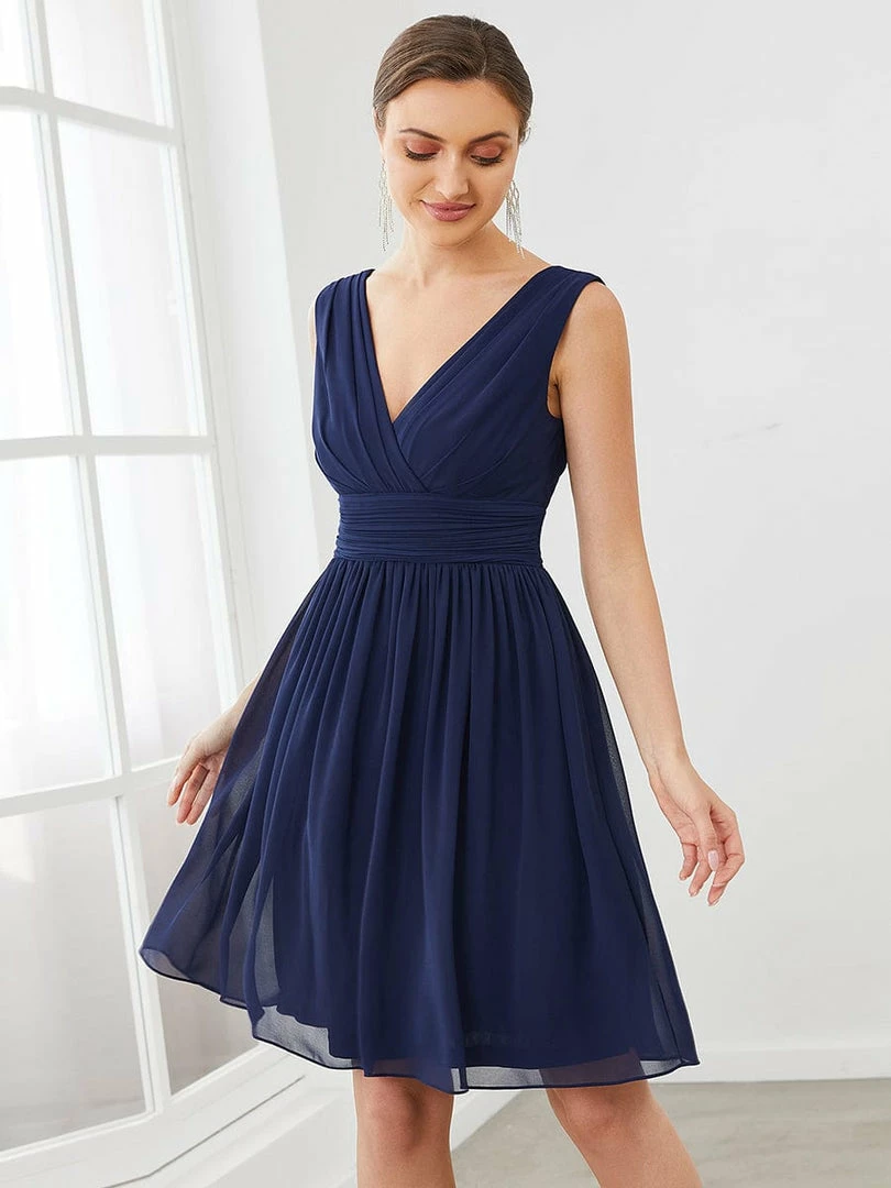 This short v neck bridesmaid dress features a sleeveless design and above knee length. It is perfect for any petite girl. The chiffon fabric makes this short bridesmaid dress very flowy and very comfortable to wear. This women’s short v neck maid of honor dress is perfect for Christmas parties, and for all formal occasions, from evening parties, cocktails, weddings to prom, homecoming, and graduation!