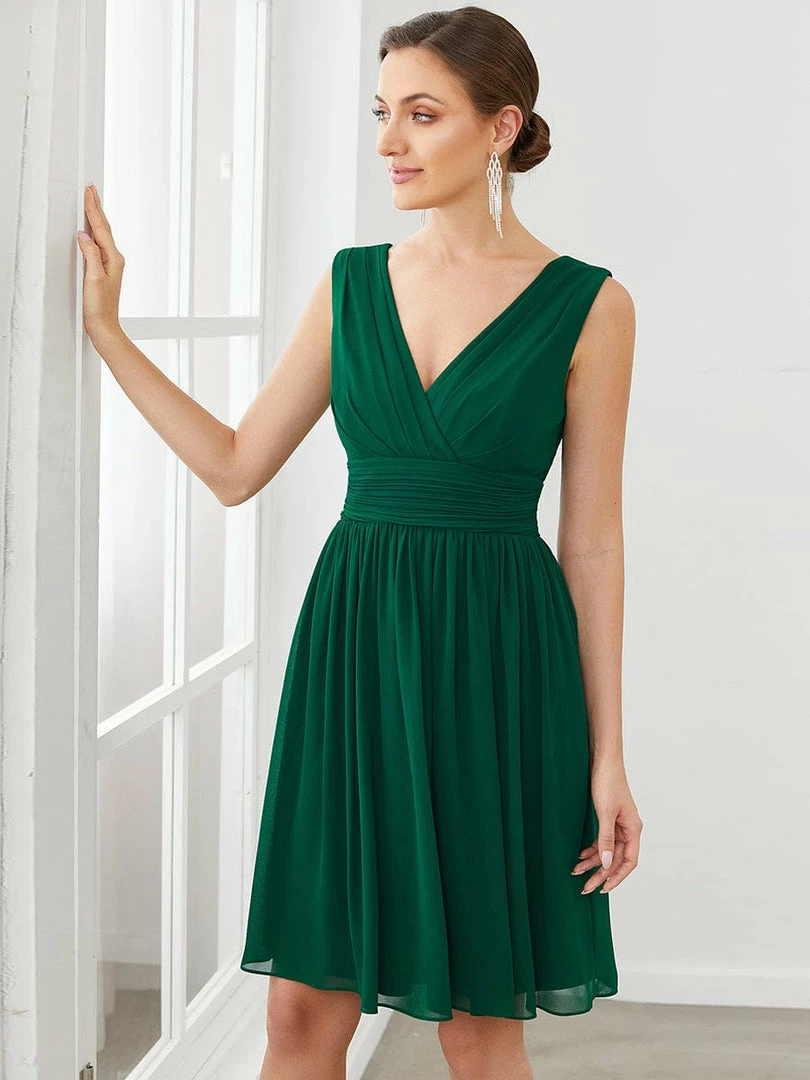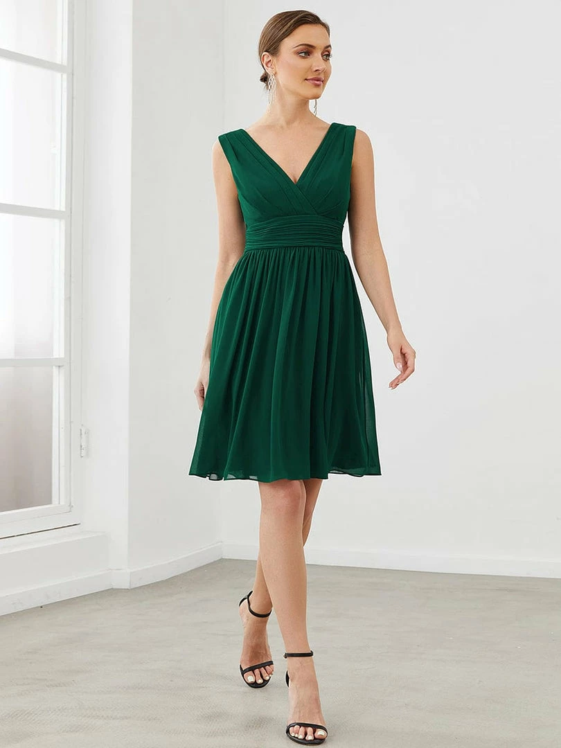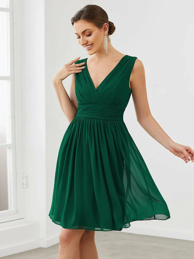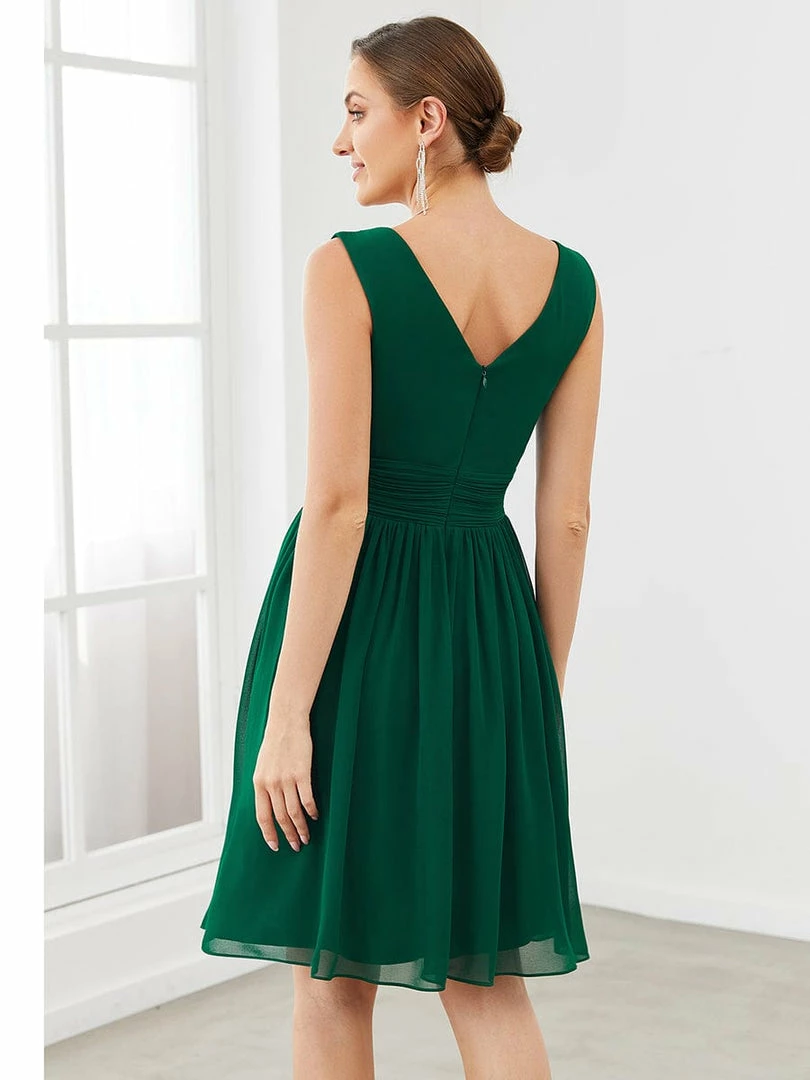 This short v neck bridesmaid dress features a sleeveless design and above knee length. It is perfect for any petite girl. The chiffon fabric makes this short bridesmaid dress very flowy and very comfortable to wear. This women’s short v neck maid of honor dress is perfect for Christmas parties, and for all formal occasions, from evening parties, cocktails, weddings to prom, homecoming, and graduation!