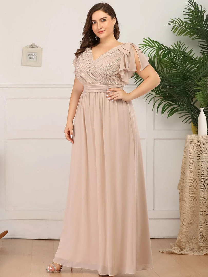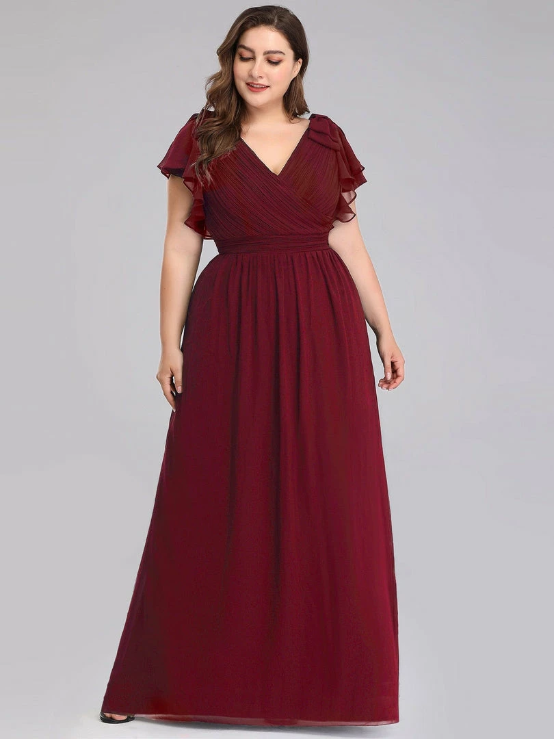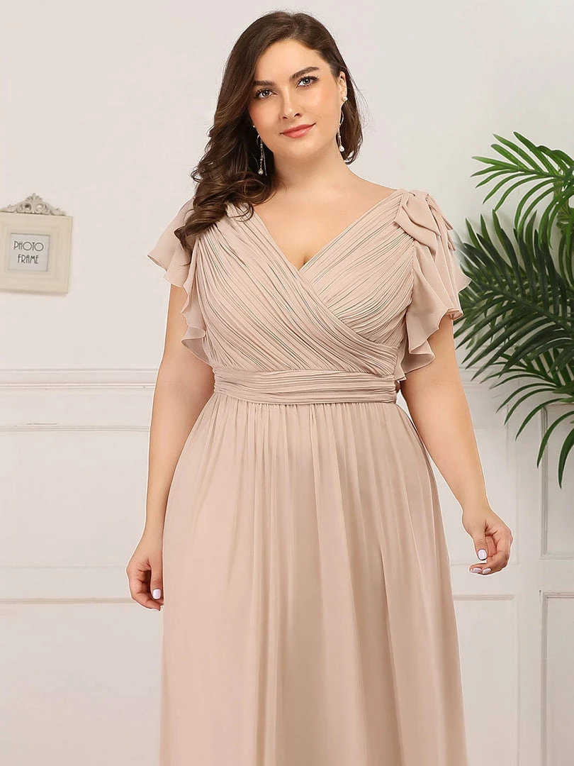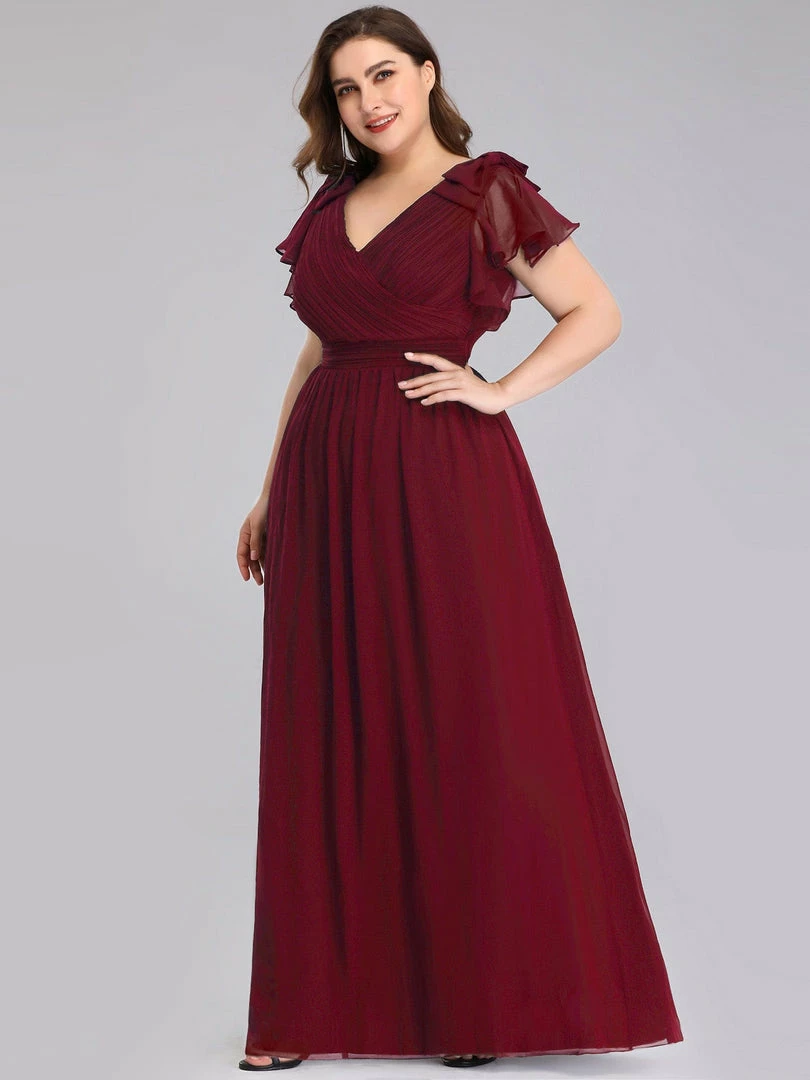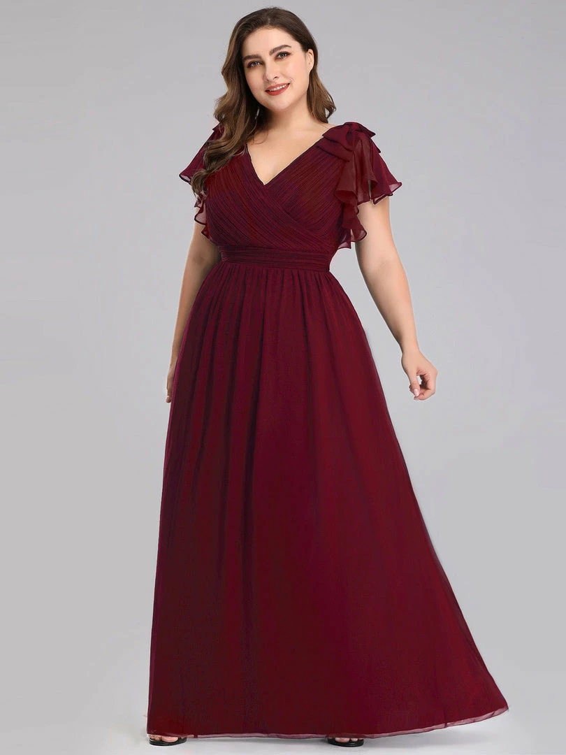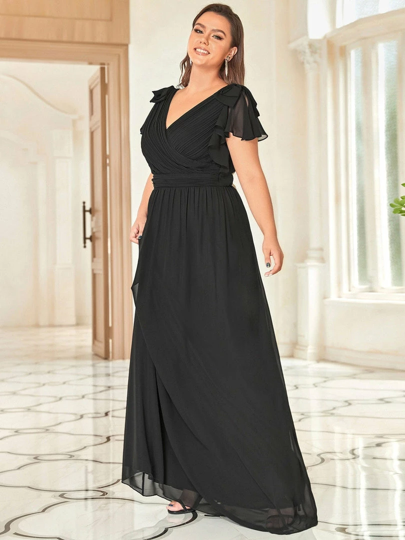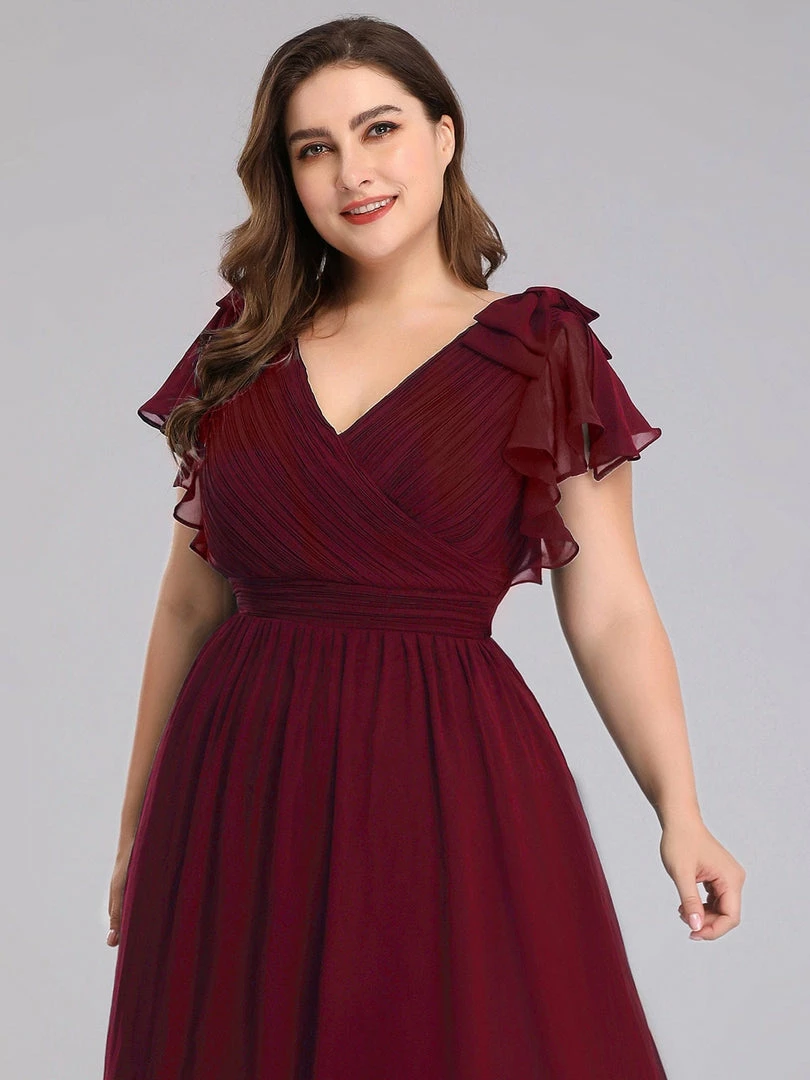 Elegant floor length chiffon evening dress with ruffle sleeves and a deep V neckline. Delicate ruching in the bust and waist creates a figure-flattering silhouette. We think this gorgeous chiffon ruffle evening dress with long sleeves is perfect for evening party,cocktail,prom,homecoming,graduation,weddings,and any other formal affair!