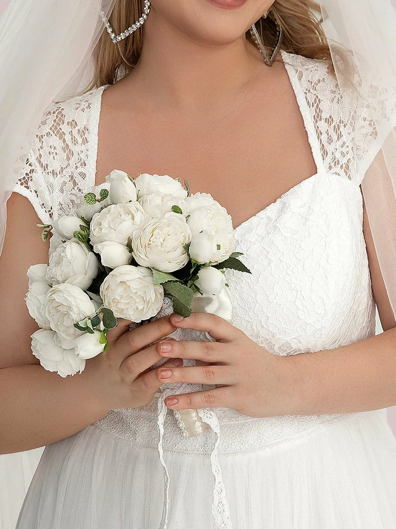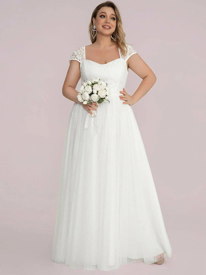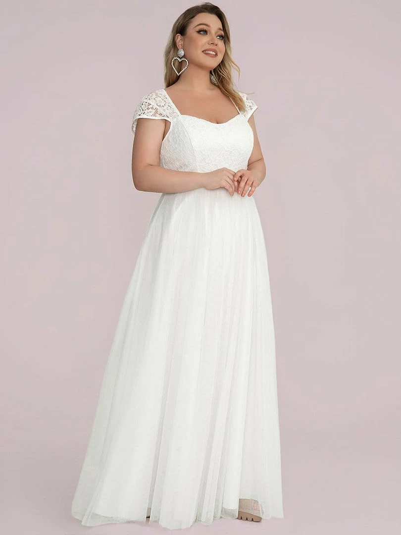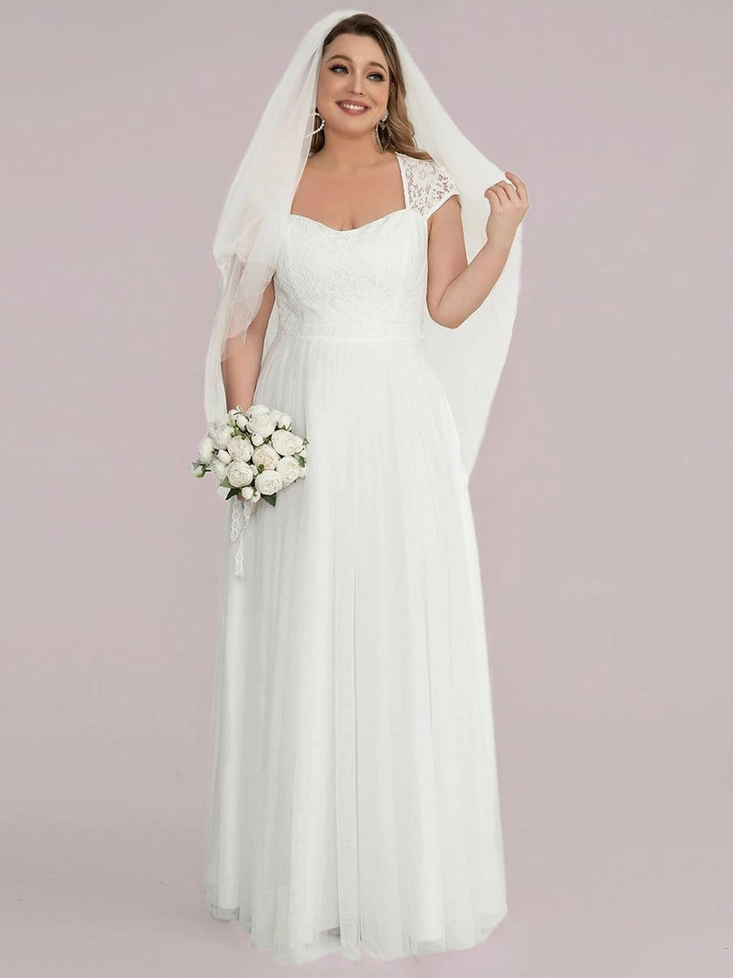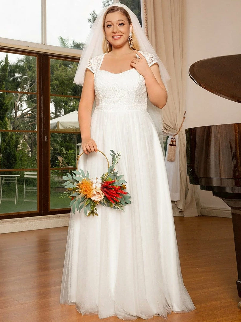 Honor your love commitment wearing this stunning lace capped sleeve wedding dress featuring a flowing layered skirt, cinched waist, and square neckline, perfect for your dream wedding.