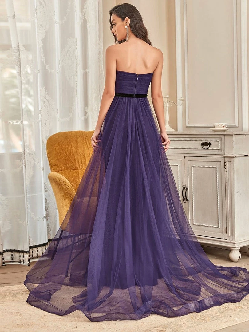 This floor-length A-line evening dress exudes an 80s vibe, perfect for those who love retro. The strapless ruched top and unique ribbon tie waist complement the sheer skirt with a front slit. Wear this evening dress to the prom, a wedding, as a bridesmaid, or other formal event and get noticed every time.