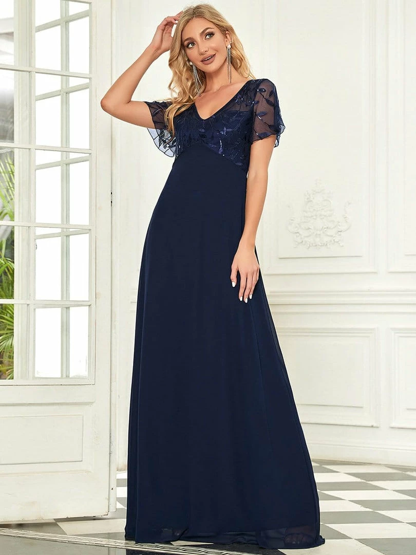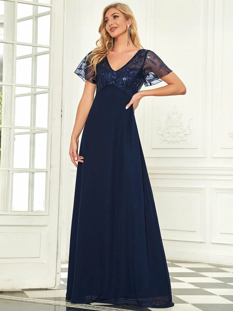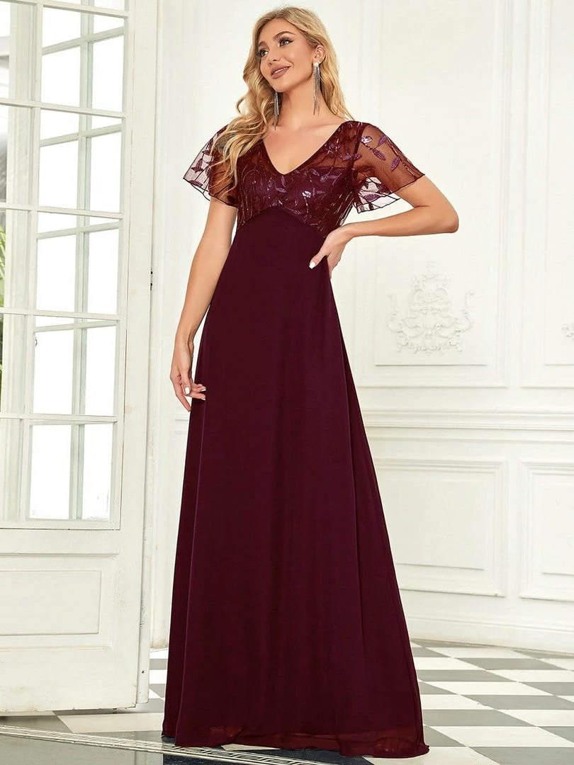Featuring a sexy deep V neckline, ruffle sleeves and a floor-length flowy tulle skirt, this stunning short sleeves evening dress is a perfect choice for people who are looking for an elegant and sexy look. It oozes romance with the shimmery leave design on the top which add just enough flair to show your taste. We think this gorgeous evening dress is perfect for parties, cocktail, prom, homecoming, graduation, weddings, and any other formal affair!Â