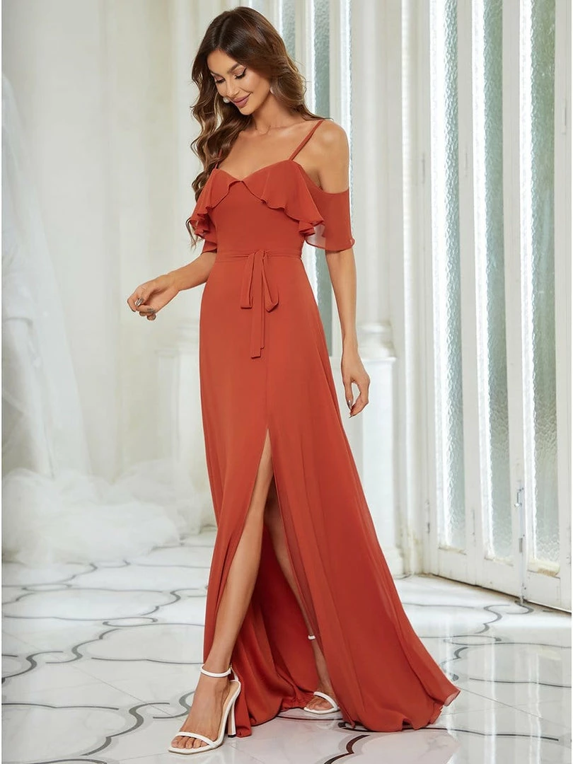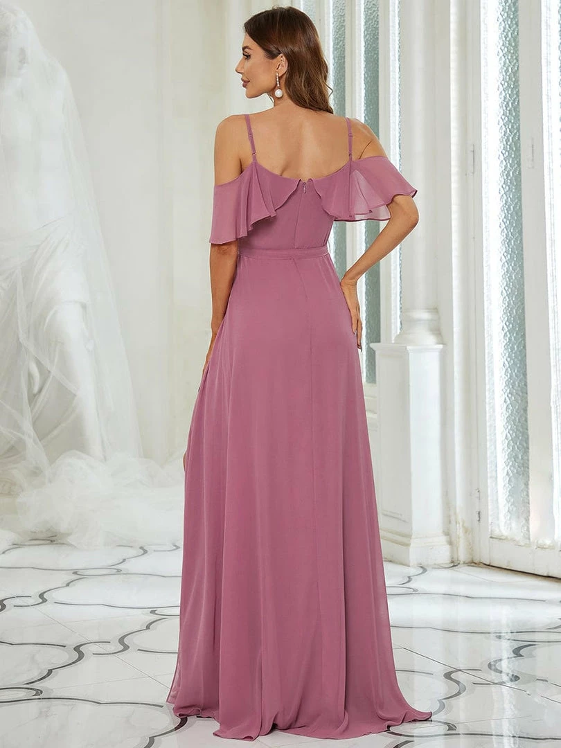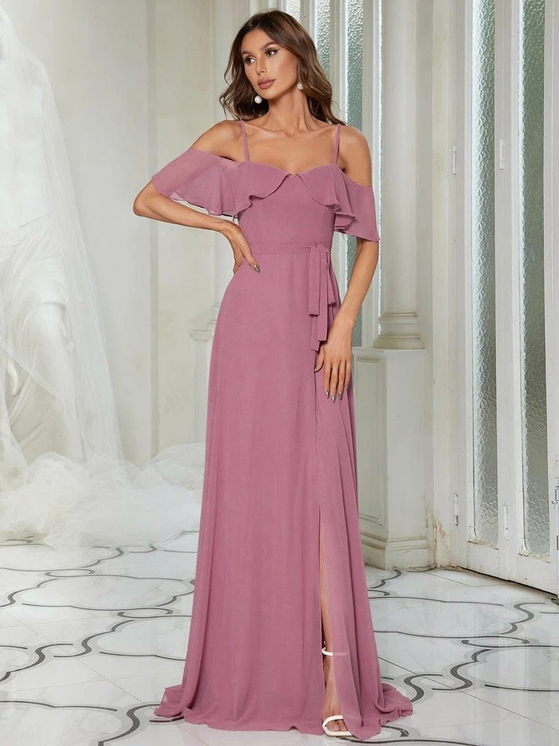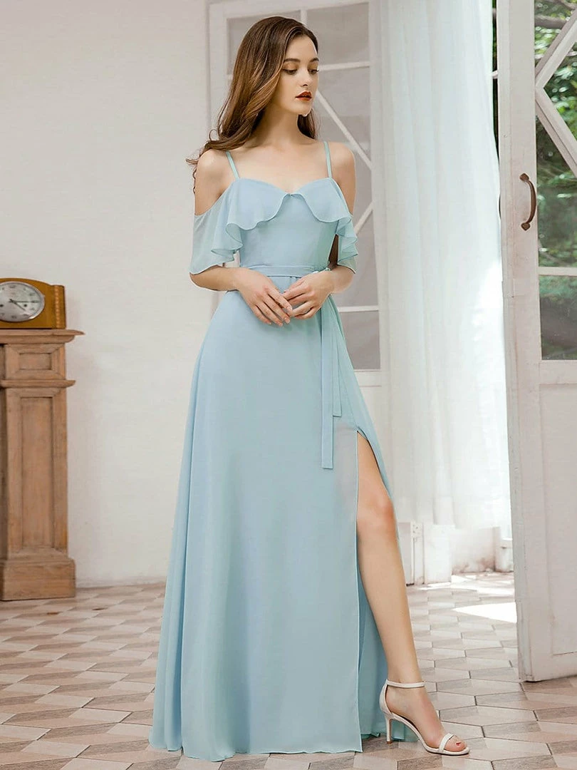 This simple yet amazing bridesmaid dress will take you in a fairy tale world as it will make you look fabulous. The bridesmaid dress features short ruffles sleeves, spaghetti straps and deep V-neck. The sky blue bridesmaid dress has A-line silhouette which accentuates the body shape. The bow knot at the front looks really cute and stylish.