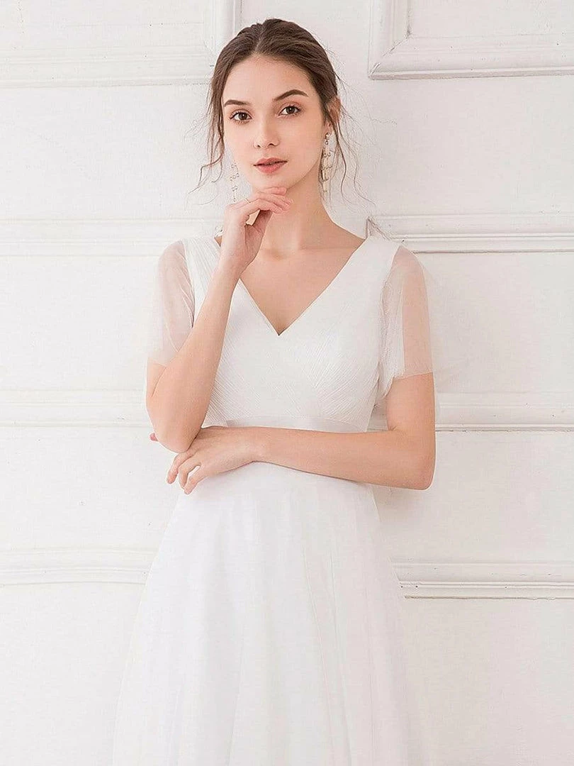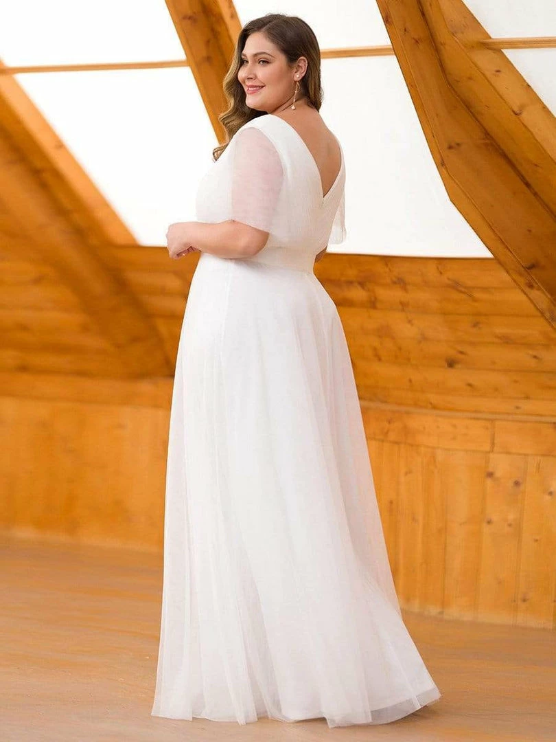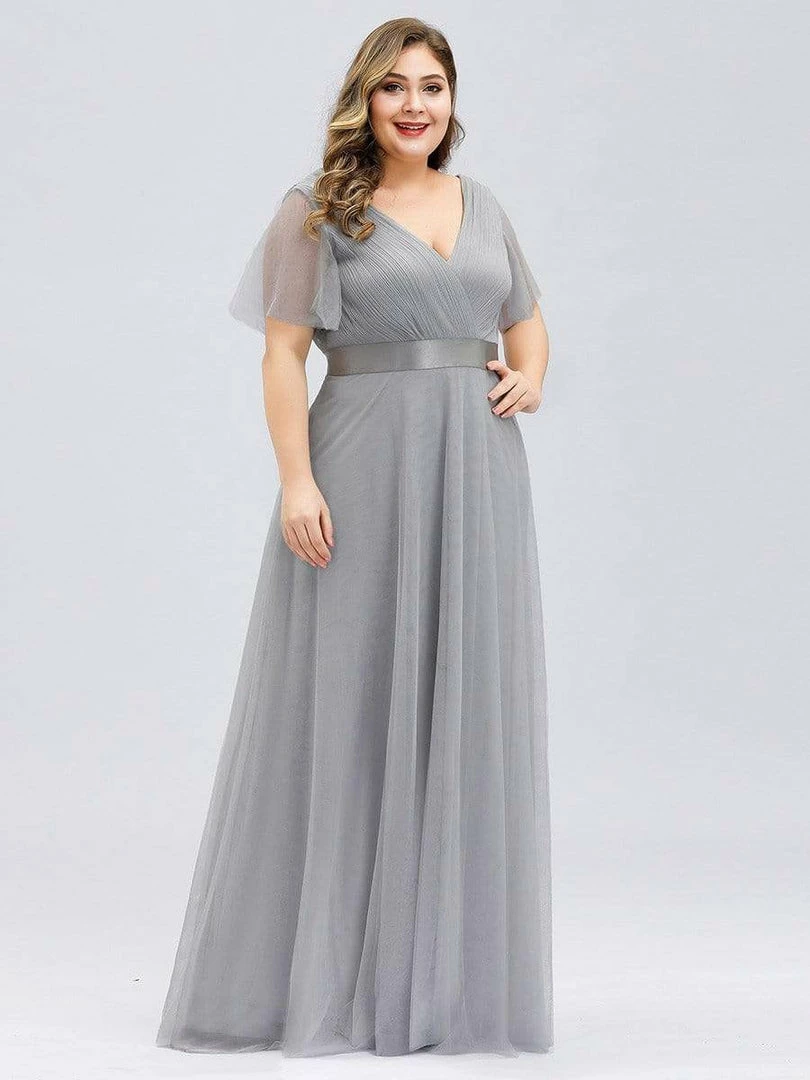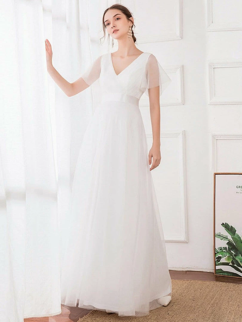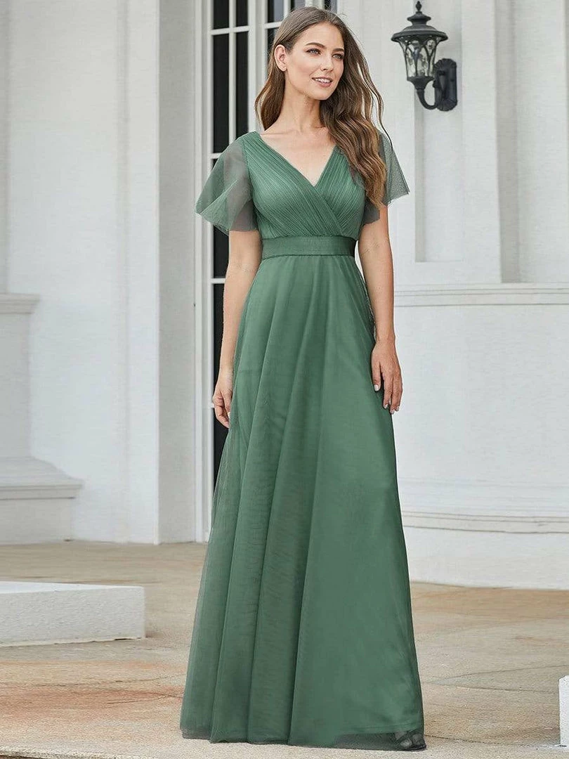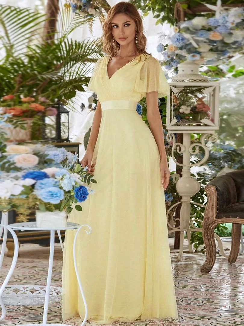 This romantic short sleeves bridesmaid dress features a deep V neckline, empire waist, flutter sleeves, and subtle tulle hemline. It is friendly to most body types. If you want to have an flowy tulle bridesmaid dress with short sleeve, then this maxi tulle bridesmaid dress with sleeves is perfect for you. We think this elegant short sleeve bridesmaid dress is perfect for all formal occasions, from evening party, cocktail, weddings to prom, homecoming and graduation!