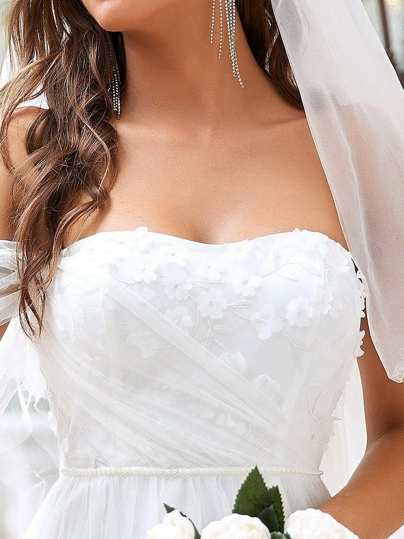 This gorgeous sweetheart a-line floor wedding dress features beautiful decorative detail around the cinched waist and floral applique and draped material overlay. Sheer draped sleeves and a long skirt give this stunning floor-length wedding dress a show-stopping style that is uniquely sophisticated.