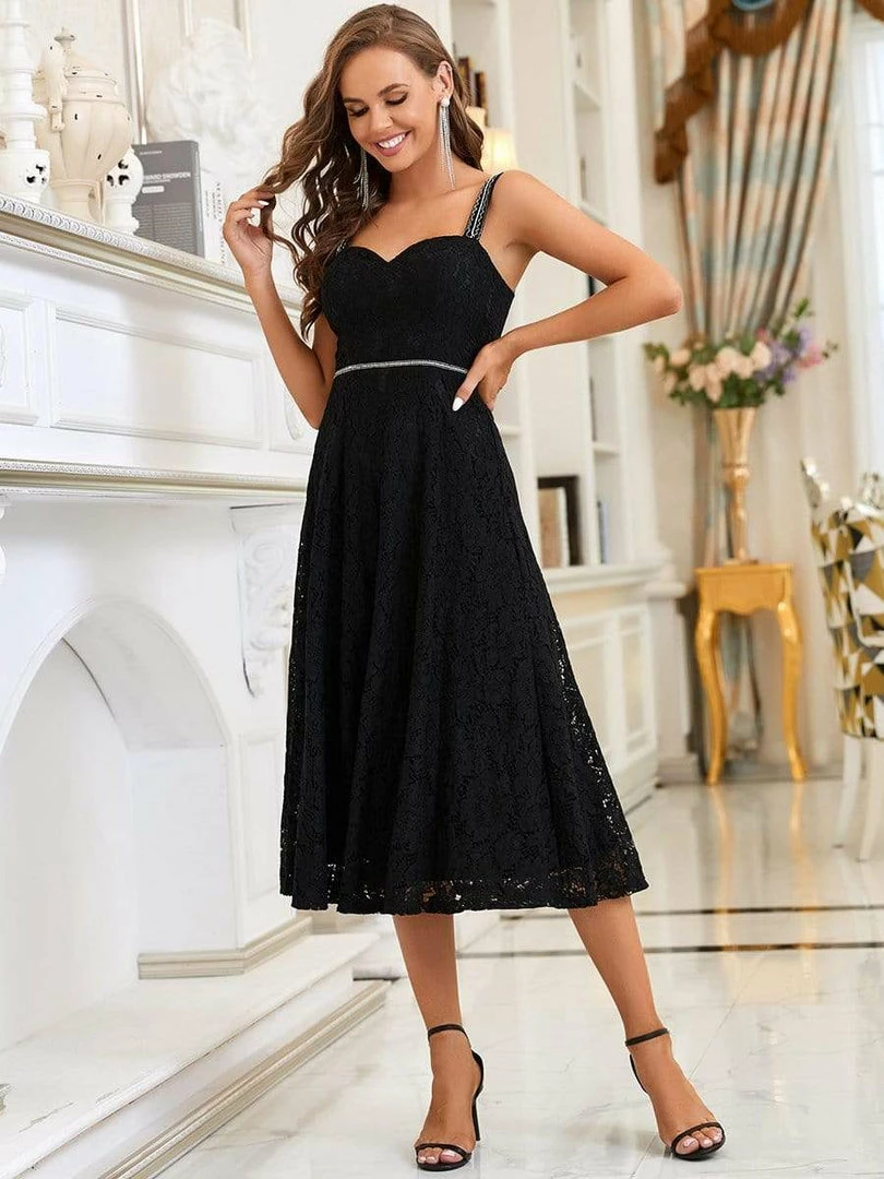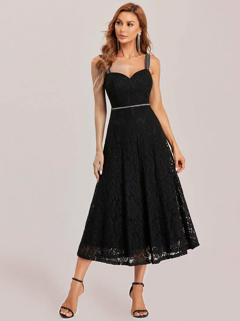 Look sophisticated yet modern in this midi lace evening dress with beaded spaghetti straps. The sweetheart bodice imbues a romantic delicate look along with the ankle-length skirt. This lace evening dress shows off your feminine style and excellent good taste being perfect for prom, wedding-guest party or homecoming.