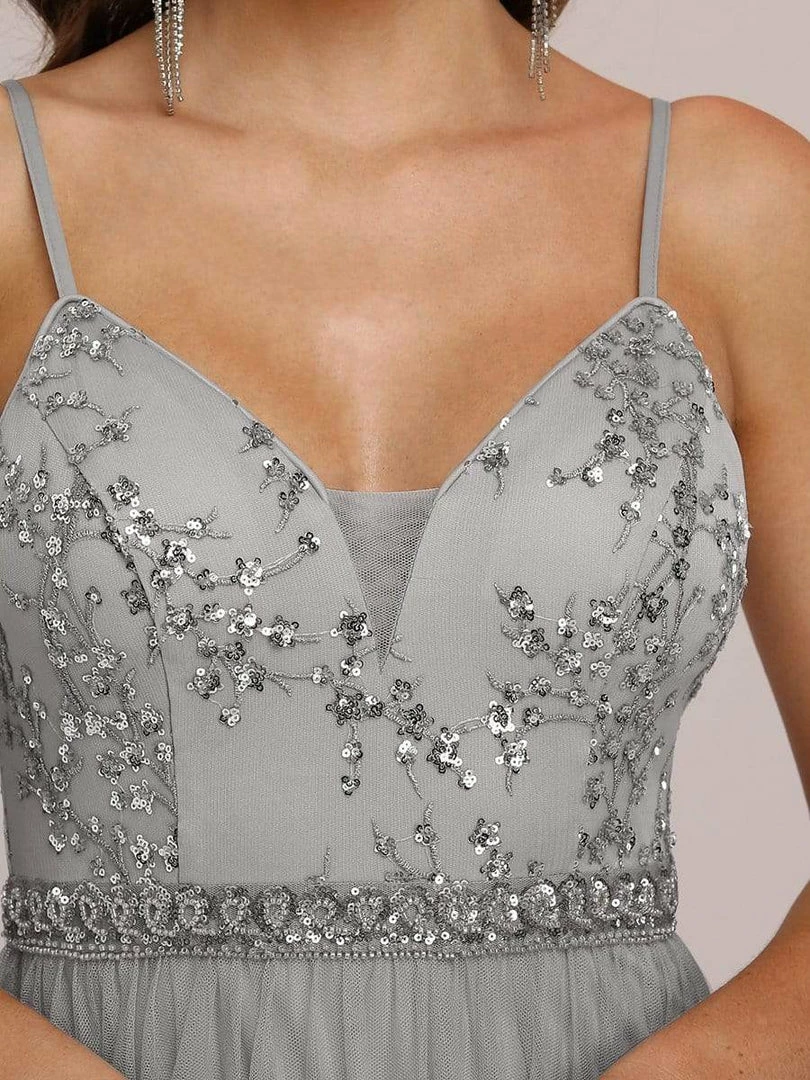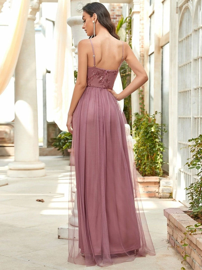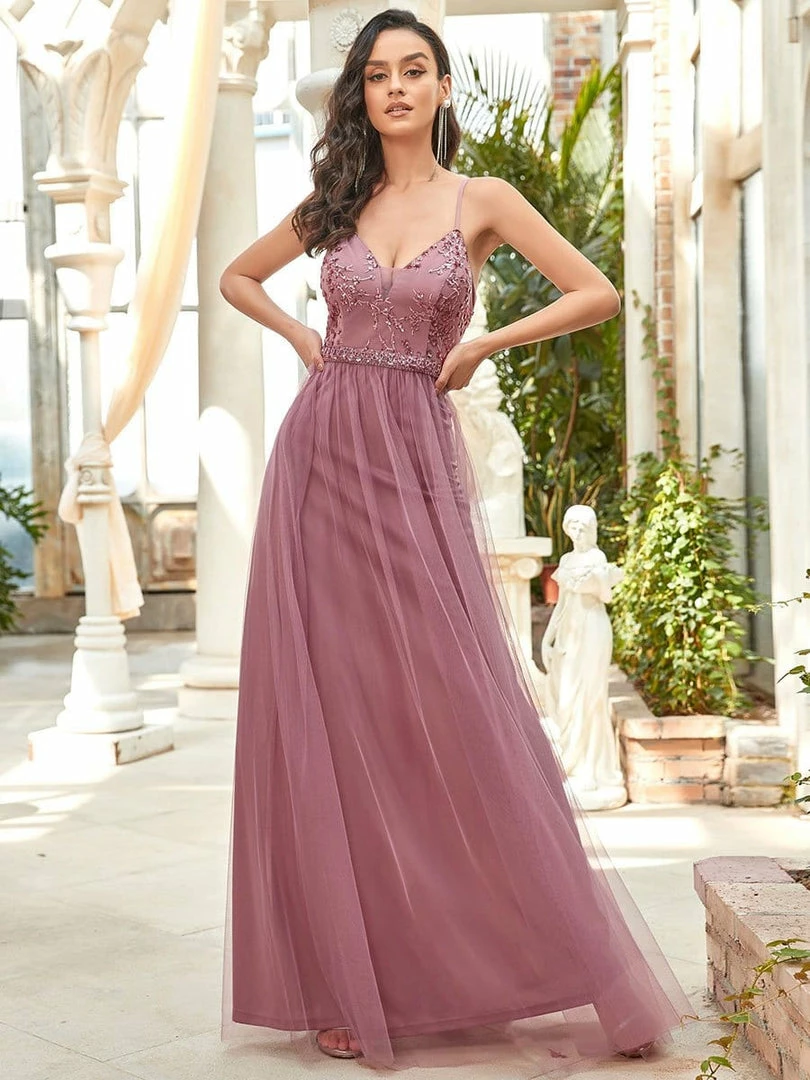 Elegant evening long dress with v-neckline and sleeveless is a perfect wear for any event. Wearing this stunning spaghetti strap evening dress makes you look very elegant and beautiful. Our classic v-neckline with beaded embroidery chiffon gown is the best choice for you! Grace yourself in a beautiful evening dress on any occasion you want.