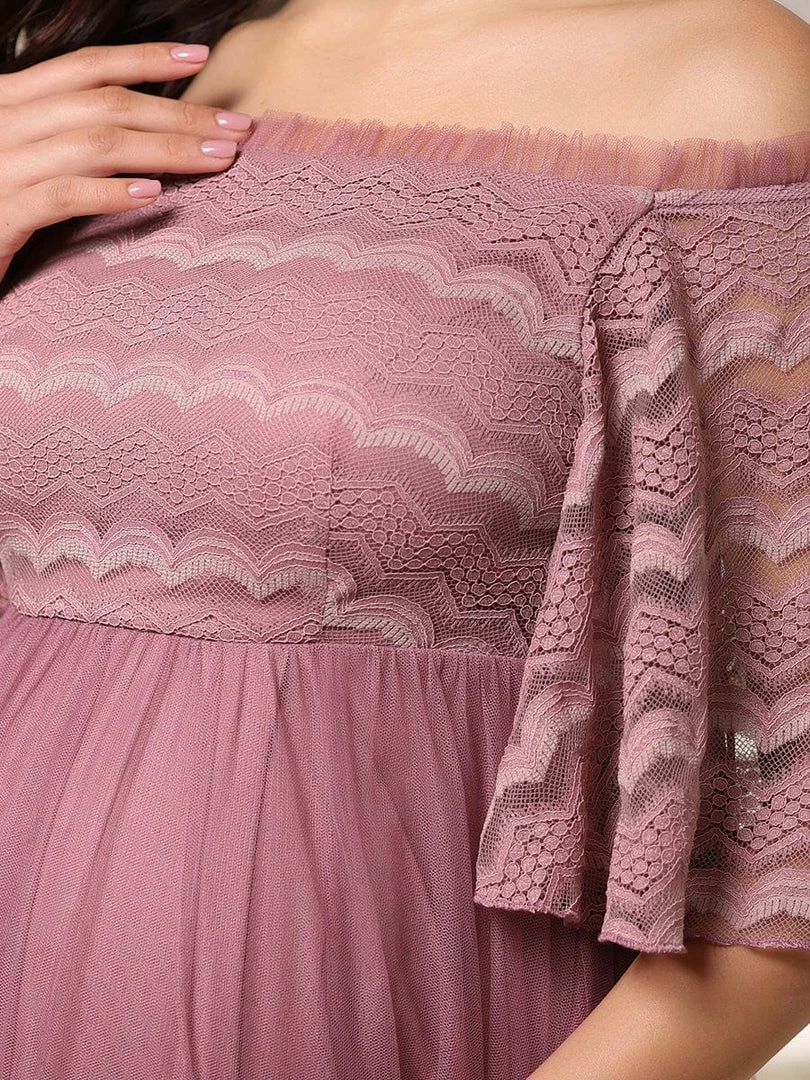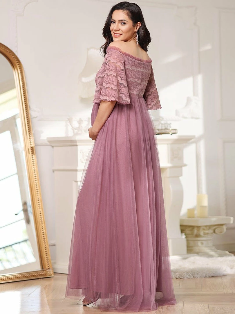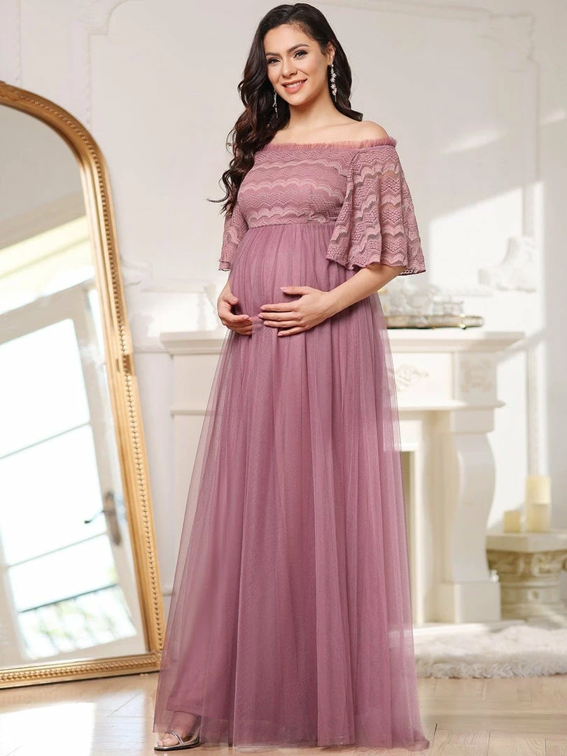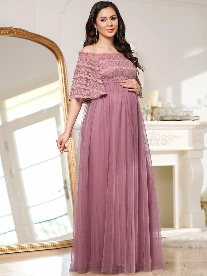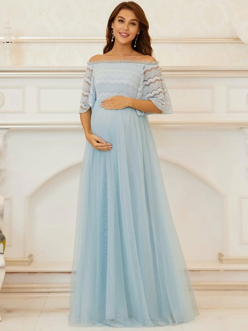 This elegant, off-shoulder maternity dress features a beautiful top covered in an elegant pattern and flare sleeves. This A-line maternity dress is finished with a multi-layered flowing bottom, providing the perfect combination of contemporary style and timeless sophistication for any black-tie event.