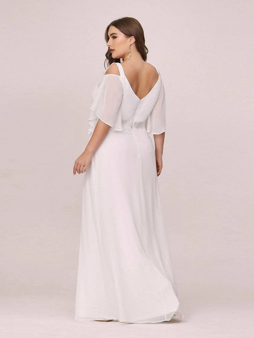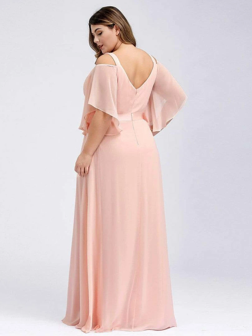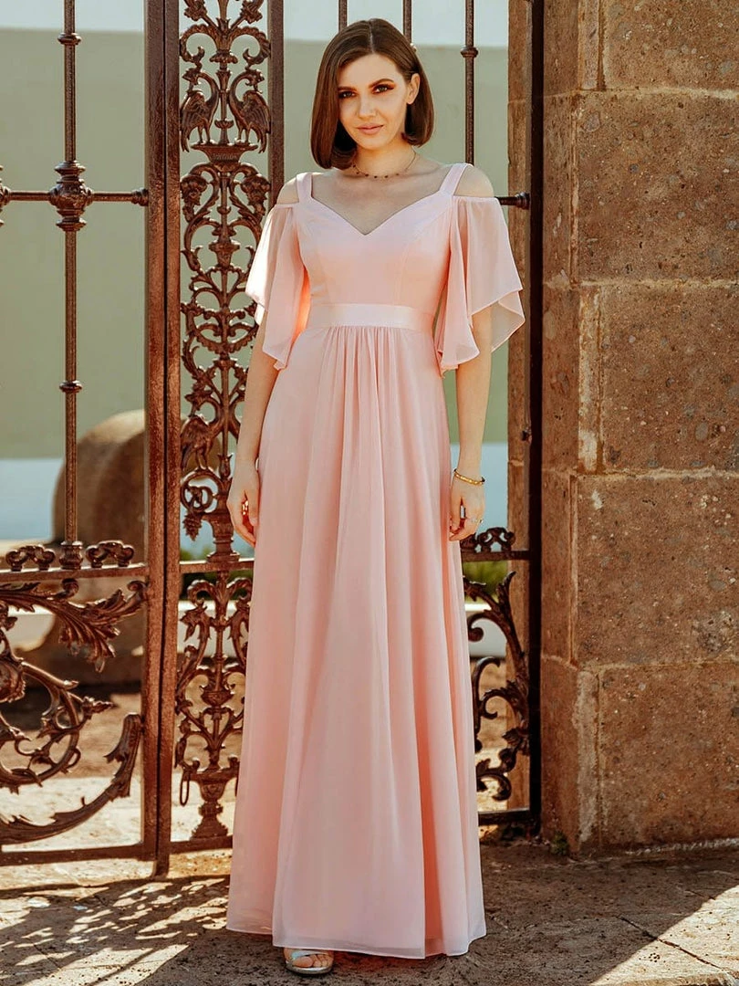 This romantic long flowy bridesmaid dress features a sexy cold shoulder neckline, empire waist, flutter sleeves, and belt design. The shoulder straps are unadjustable. You can wear this cold shoulder bridesmaid dress with flutter sleeves for summer or any outdoor weddings. Of course, this long flowy bridesmaid dress is suitable for evening party, cocktail, prom, homecoming, graduation, weddings, and any other formal affair!Prices will vary as certain colors of this style is on sale.