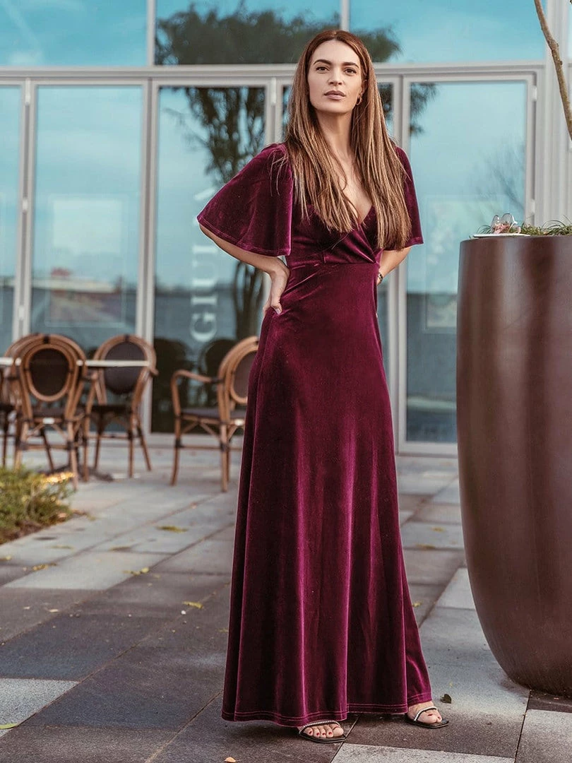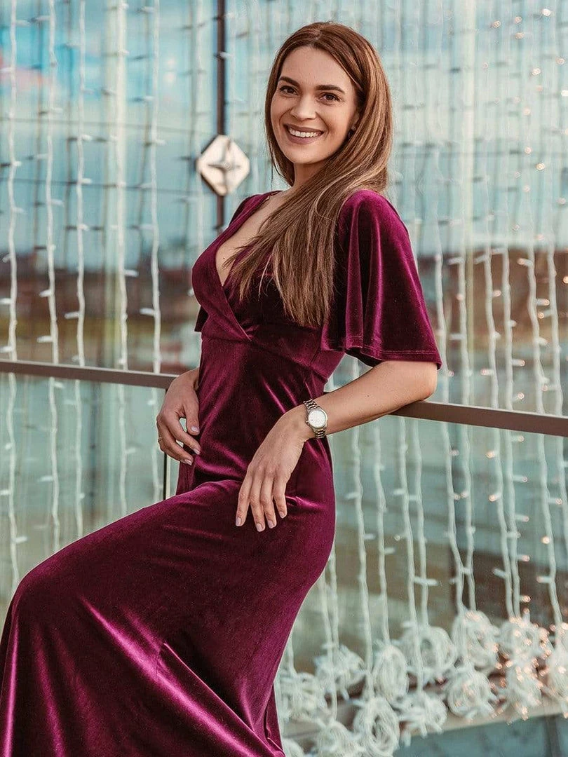 Featuring a double V neckline and ruffles sleeves, this brick-red velvet party dress is your perfect choice for the first event in Fall and Winter! This long velvet v neck party dress with sleeves will show off your timeless elegance. Winter velvet party dress, together with timeless elegance, you will surely feel your best. Brick red velvet party dress is one of the most popular styles for any events this winter. Select yours and be the center of the events.