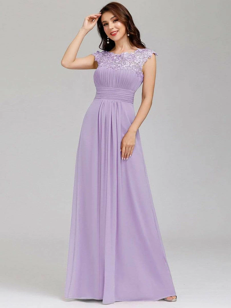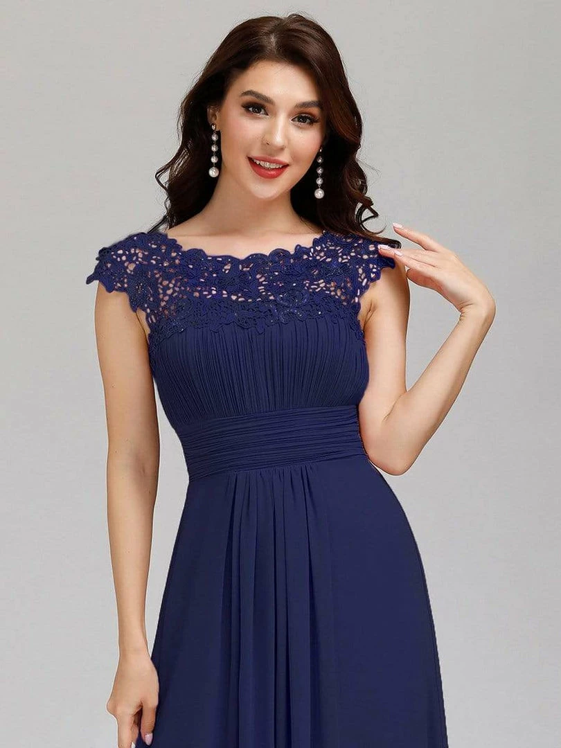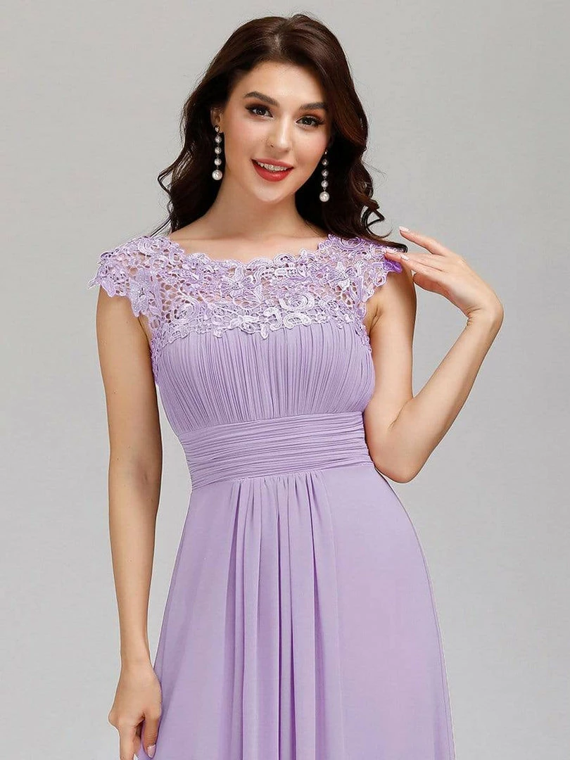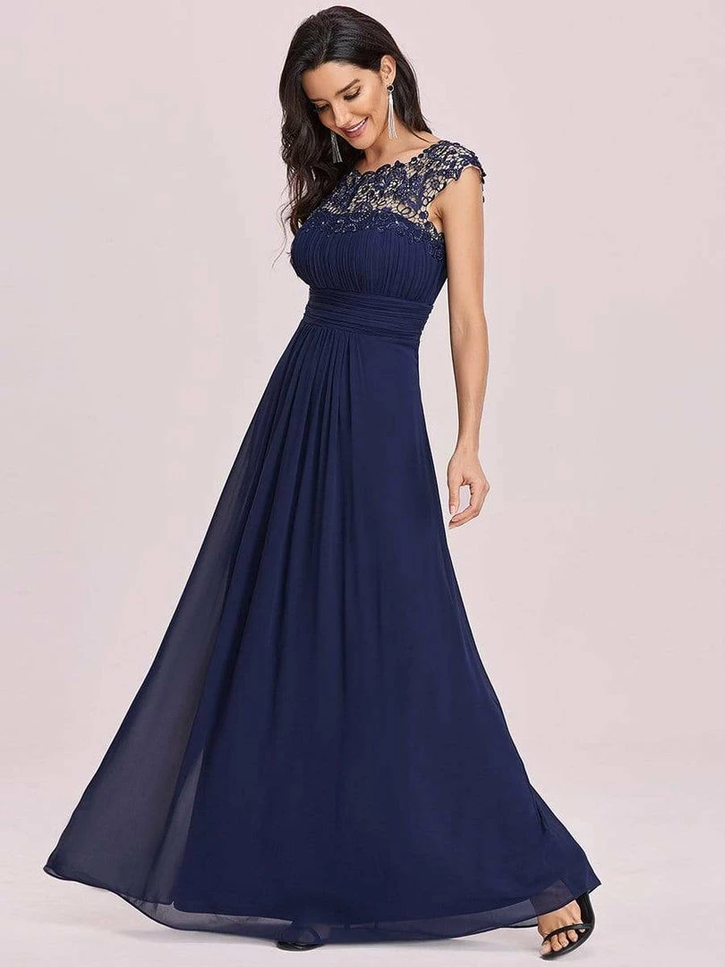 This is long flowy bridesmaid dress with lacey cap sleeves. Delicate lace and rhinestones decorate the neckline while the ruching in the bust and waist creates a figure flattering silhouette. This emerald green bridesmaid dresses is perfect for evening party, cocktail, prom, homecoming, graduation, weddings, and any other formal affair!Prices will vary as certain colors of this style is on sale.