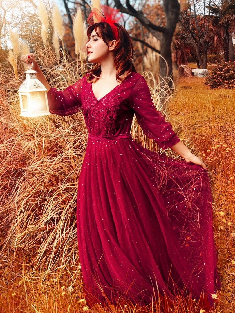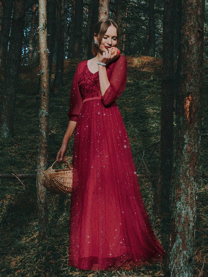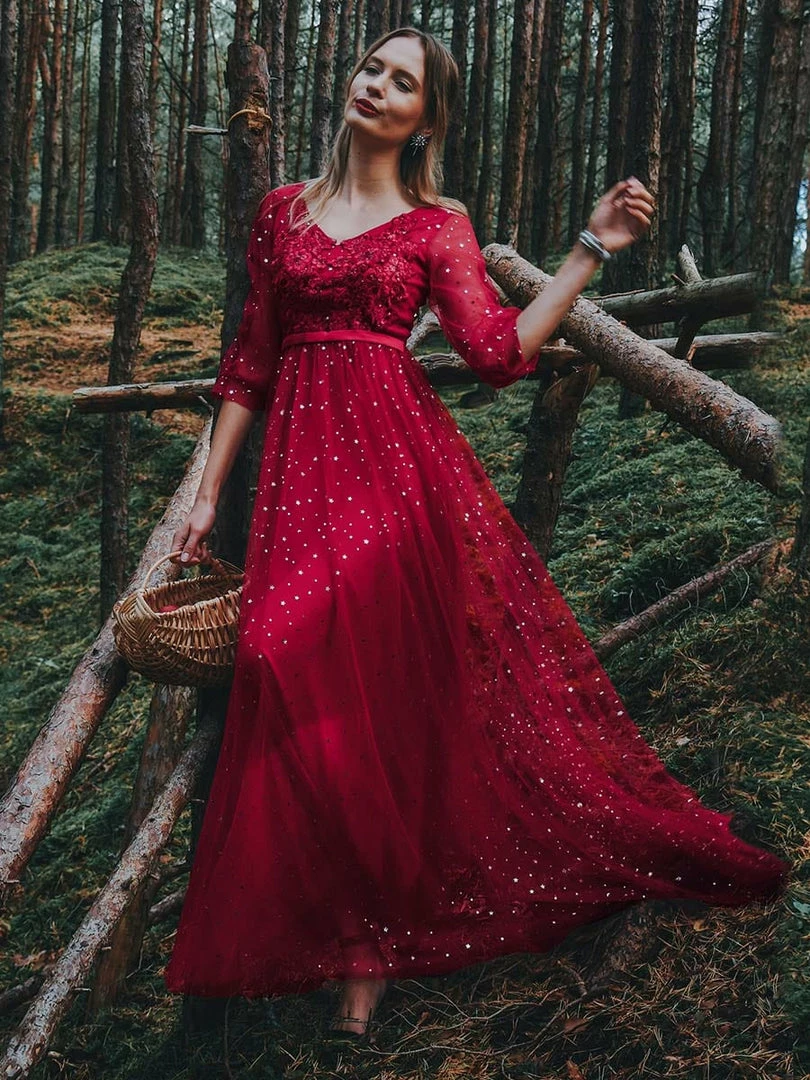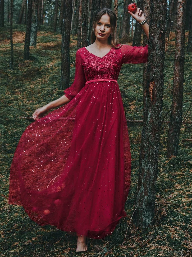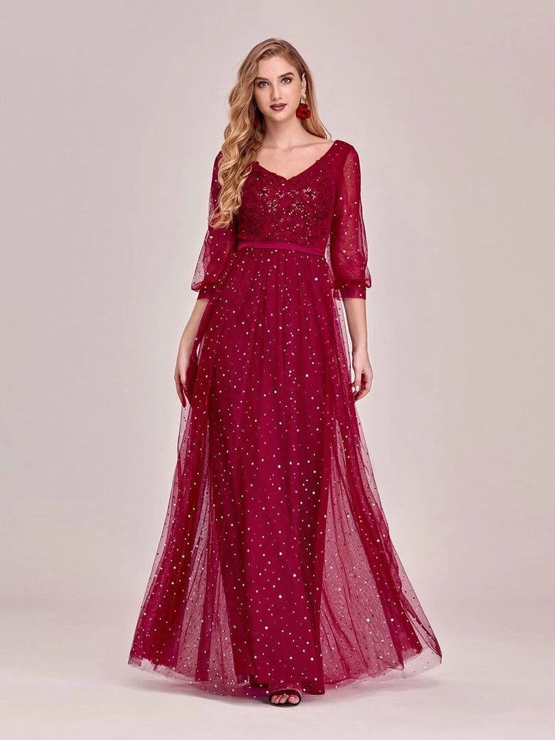 This beautiful and elegant evening dress has everything you ever wanted in a dress. Featuring a double V-neck, this evening dress has mid-length lantern sleeves which looks alluring. The front is decorated with appliques. The applique designing and waistbelt also make the dress look great. It also features an A-line silhouette which helps to accentuate the waistline. We think this gorgeous dress is perfect for all formal occasions, from evening party, cocktail, weddings to prom, homecoming and graduation!