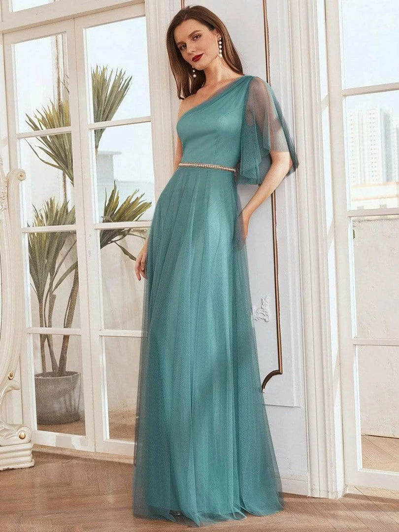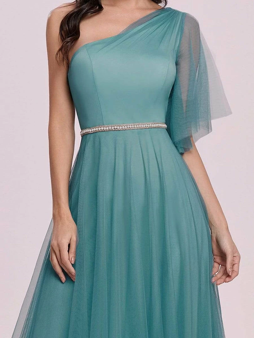 This beautiful maxi tulle bridesmaid dress is the kind of dress that you will reach for again and again, no matter what the occasion is. This asymmetrical single ruffle sleeve and the oblique neckline make it all time hit to give it a unique and stunning look. The bodice with bead-decor waist line and the tulle train will make you super gorgeous as you step in to any wedding, party, prom, cocktail etc.