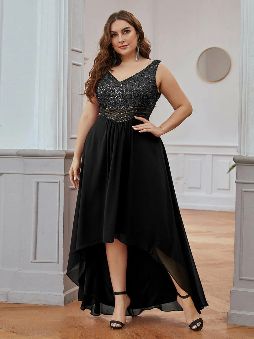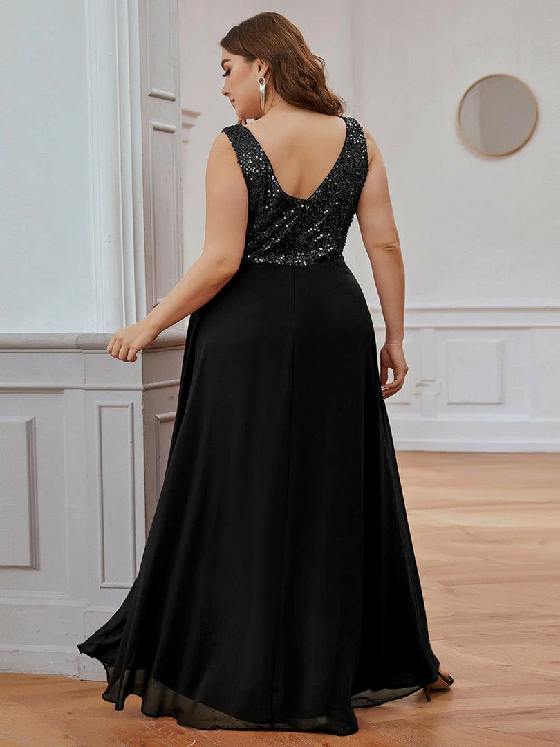Hold your hearts because this stunning evening dress would make you look like a princess. This plus size evening dress for mature woman features a deep V-neck and is sleeveless. The A-line silhouette of the dress makes it look high-end and fabulous. The paillette designing on the upper body looks stunning as well. This gorgeous dress is perfect for all formal occasions, from evening party, cocktail, weddings to prom, homecoming and graduation!