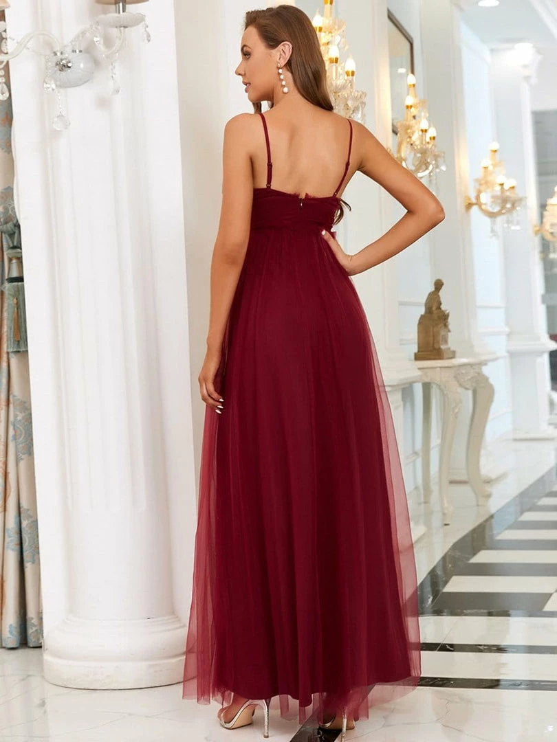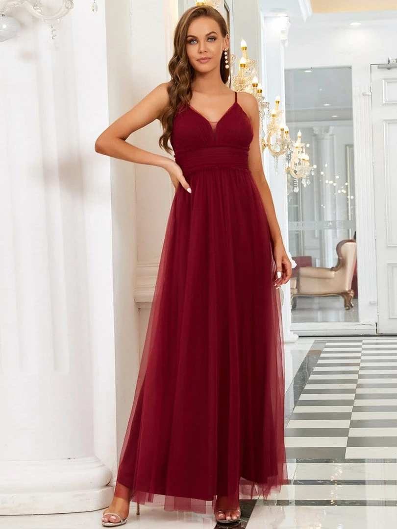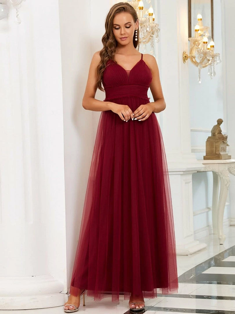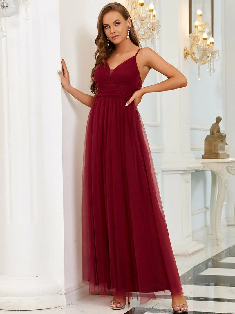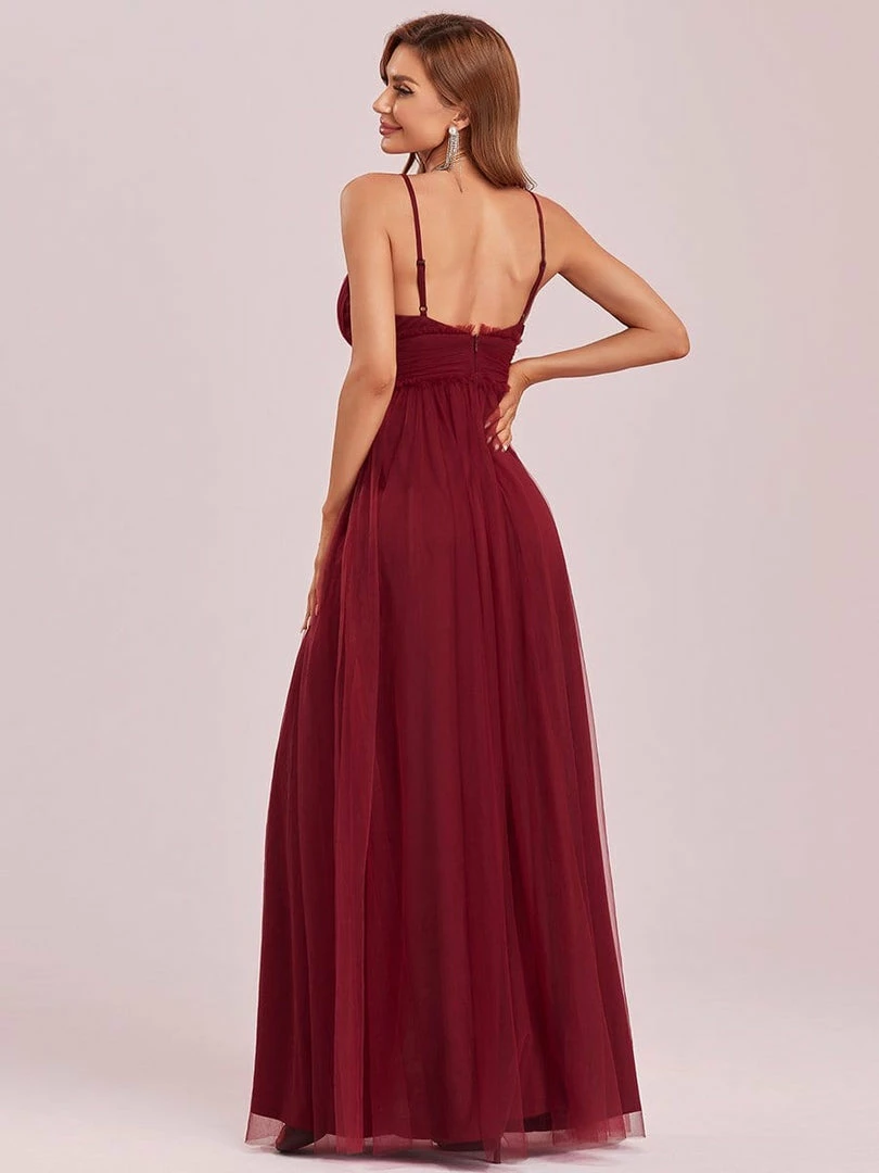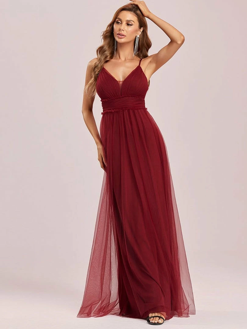 This beautiful plunging V-neck spaghetti strap evening dress is perfect for your next formal occasion, ideal for prom, a bridesmaid selection, a wedding party, or other dressy functions. The gathered waist and pleated floor-length skirt give this beautiful dress elegant vibes, finished with a flattering backless style.