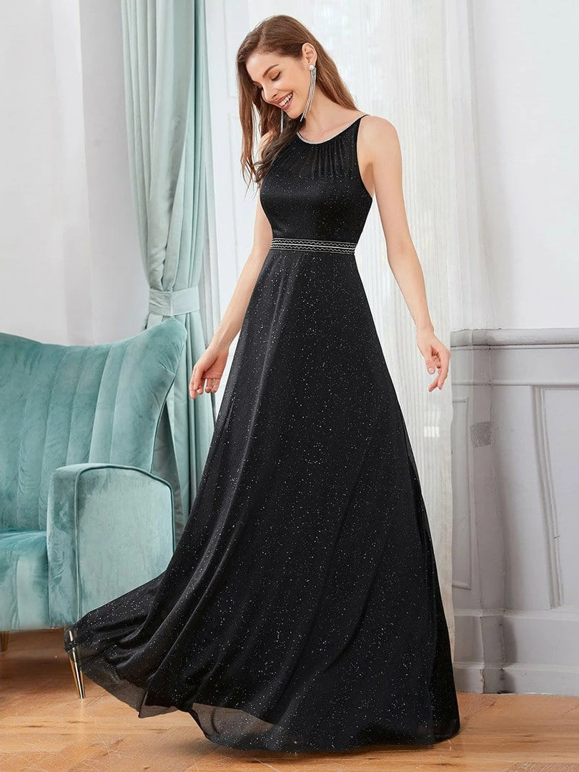 Look flattering and amazing by wearing this shimmery and sexy evening dress! Featuring a classic round neckline and a flowy A-line skirt, this sleeveless dress is friendly to most body shape. The sparkling rhinestone on the neckline adds enough details to show you taste while the belt design also helps to define your sexy waistline. A perfect choice for formal weddings and evening parties, cocktail, prom, homecoming, graduation, and any other formal affair!