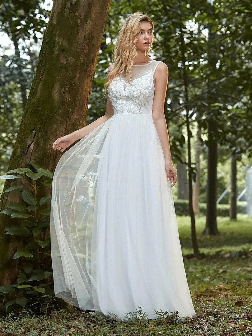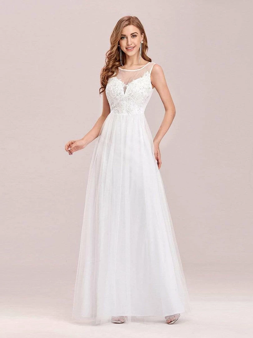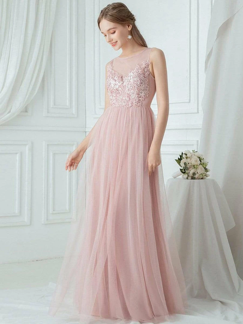 Featuring a classic sheer round neckline and a flowy tulle skirt, this romantic tulle bridesmaid dress is perfect for any wedding in spring and summer. The delicate applique in the bust also gives a feminine and elegant vibe. This applique tulle bridesmaid dress is available in pink and white colors. Select pink or white bridesmaid dresses based on your wedding theme now.