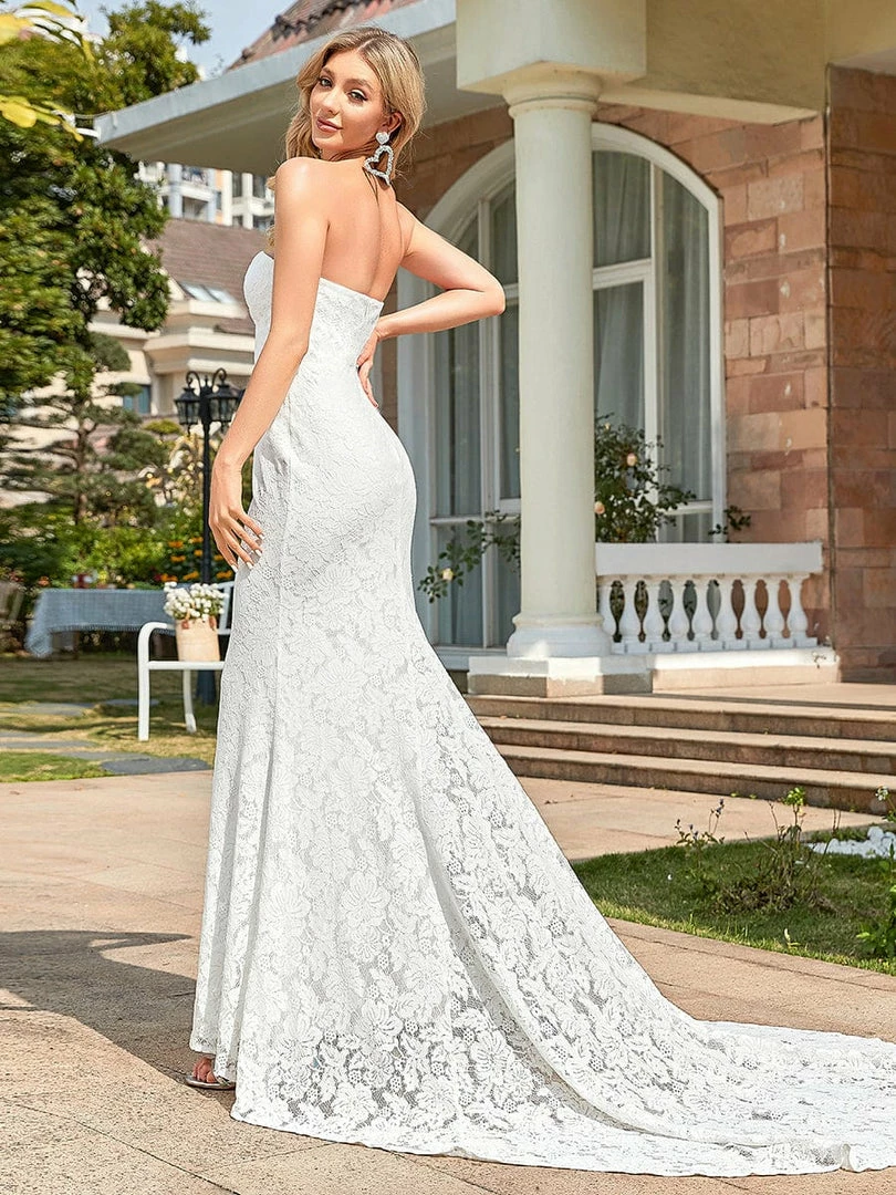 This romantic bodycon strapless wedding dress features a classic silhouette covered with floral lace. A plunging sweetheart neckline with an illusion panel and strapless fit gives way to a gorgeous fishtail floor-length style, perfect for wearing year-round, indoors or outdoors.