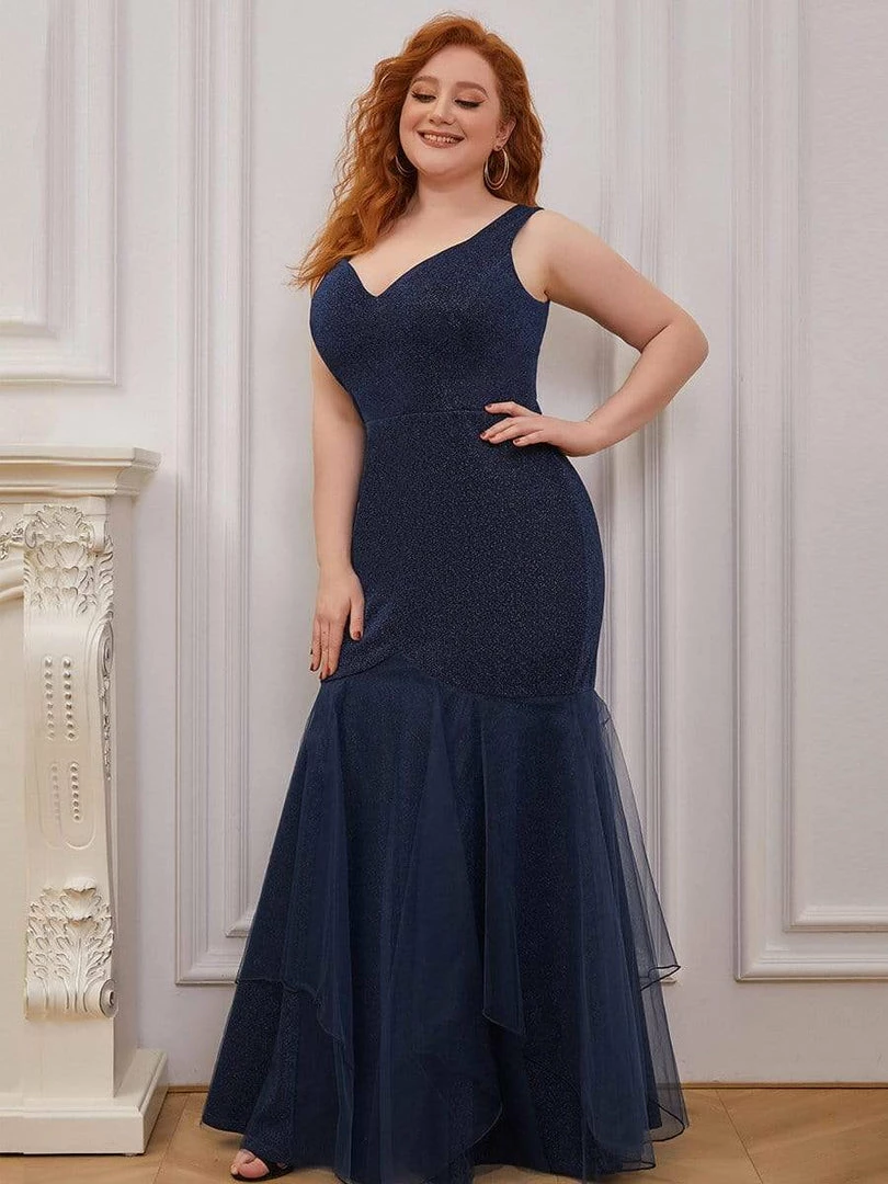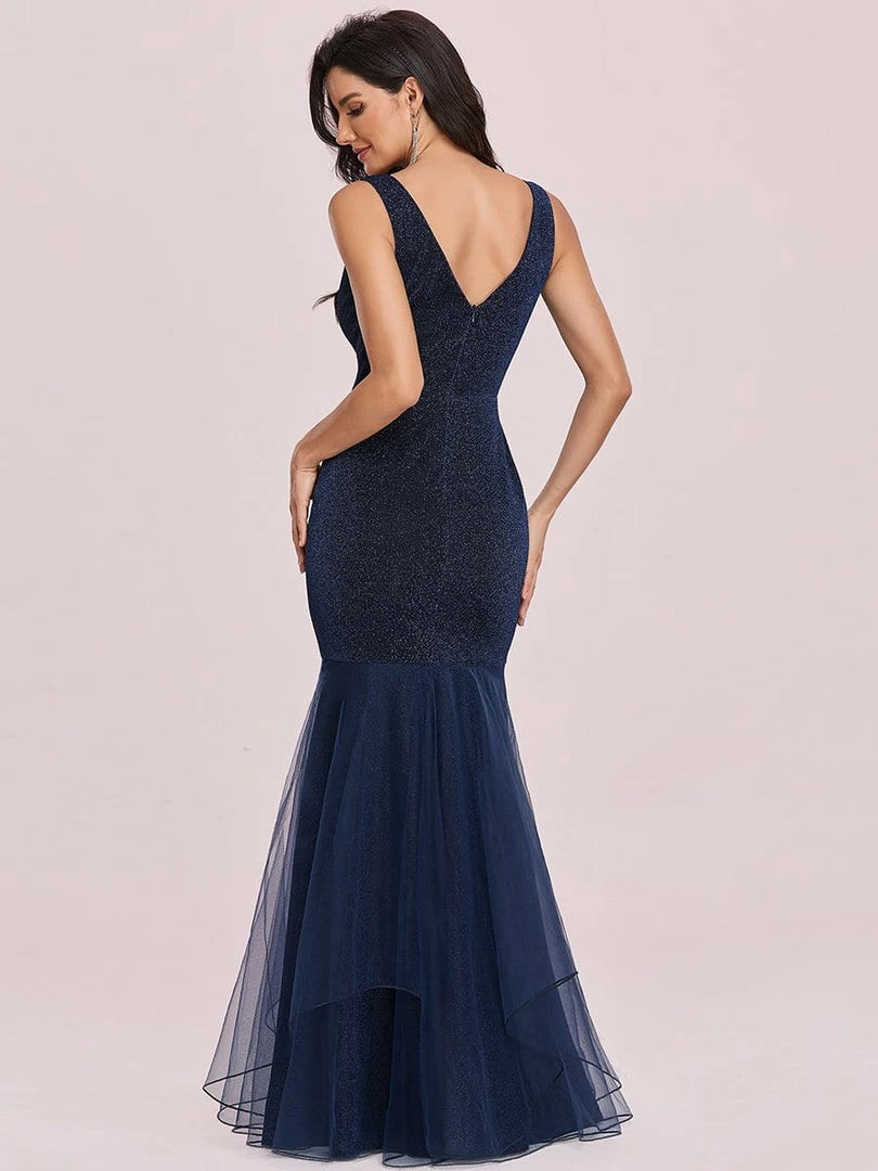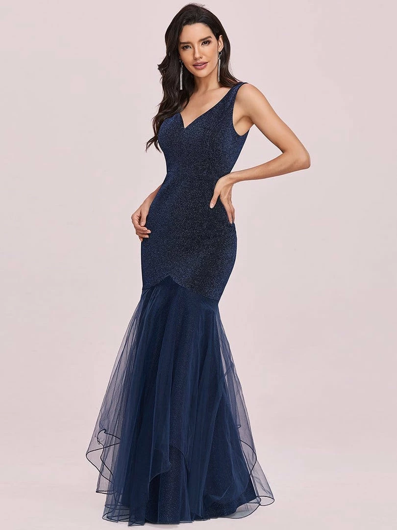 This mermaid long evening dress with shimmery look will make you look charming like a mermaid in fables. Delicate straps, the slimming waist and the shimmery texture fabric will flaunt your sexy figure pretty well. The finished look imbues multi layers of airy tulle to give off the mermaids tail like appearance to add up romance and elegance. Pair up this chic with stylish jewelry and a cool pair of shoes to be a bold beauty.