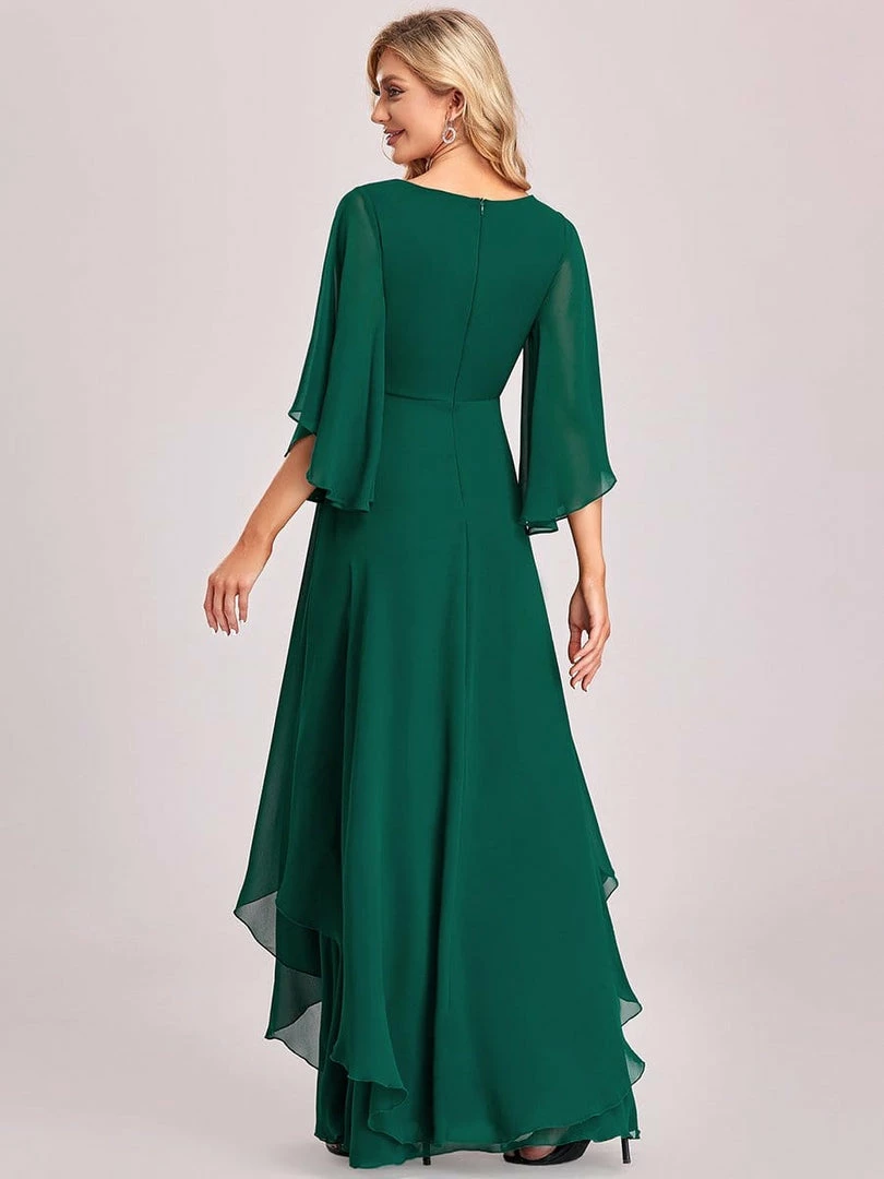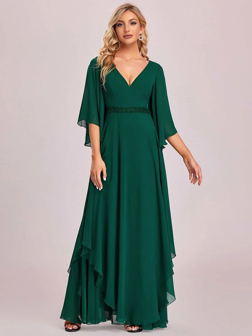 Celebrate one of your most momentous lifetime events wearing this ruffled uneven hem mother of the bride dress, featuring a gorgeous sparkling sequin embellished waist and plunging v-neck.