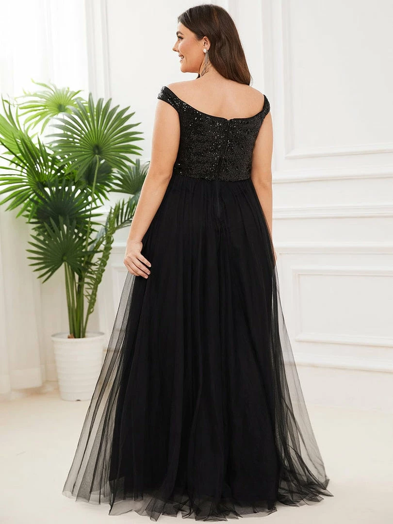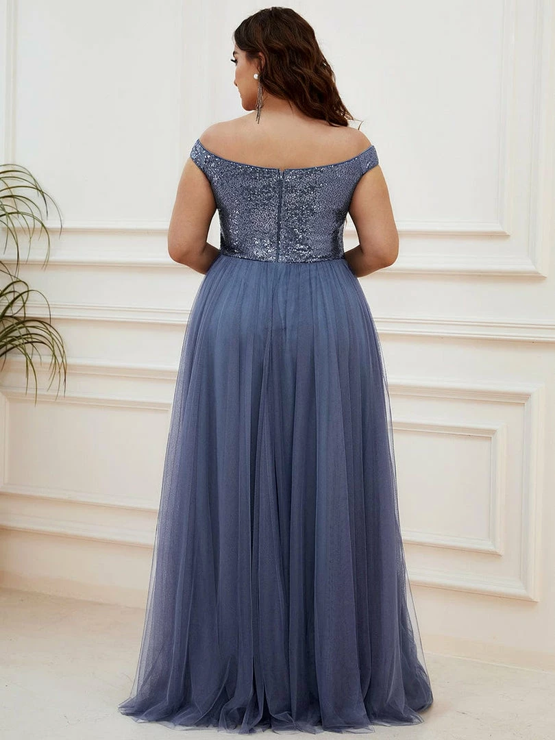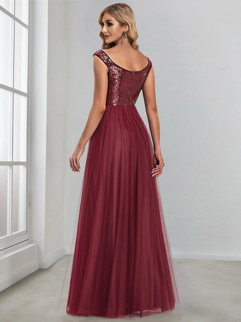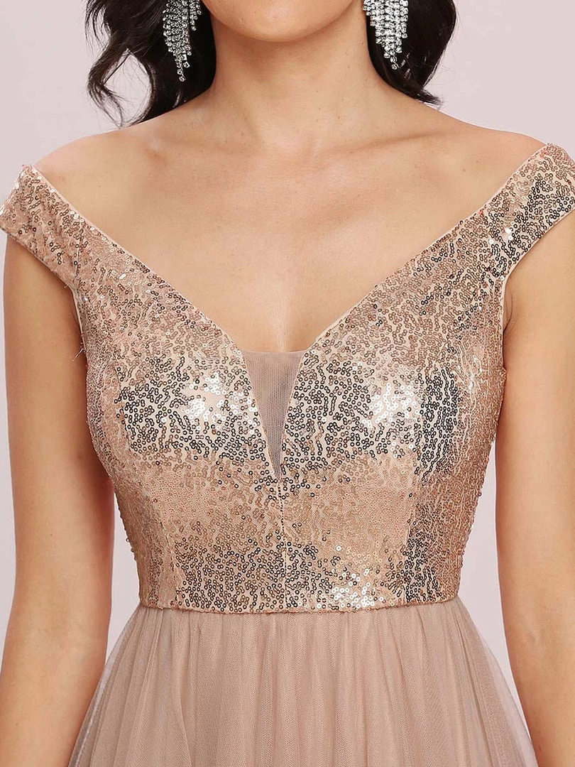 Look like a fairy in this shimmery fairytale off shoulder evening dress style. This off the shoulder sequin maxi evening dress with sequins bodice will give you sophisticated fancy look. Its off-shoulder sleeves with deep V-neckline and the airy tulle full length skirt will make you a captivating and charming personality in any wedding or party.