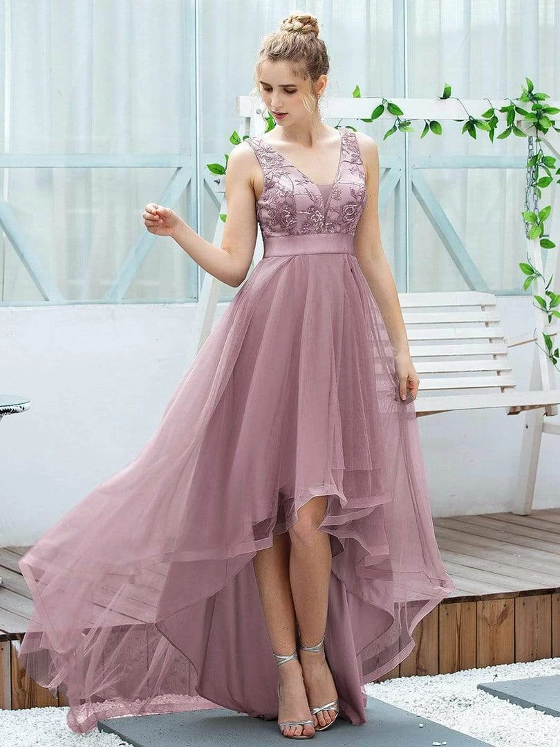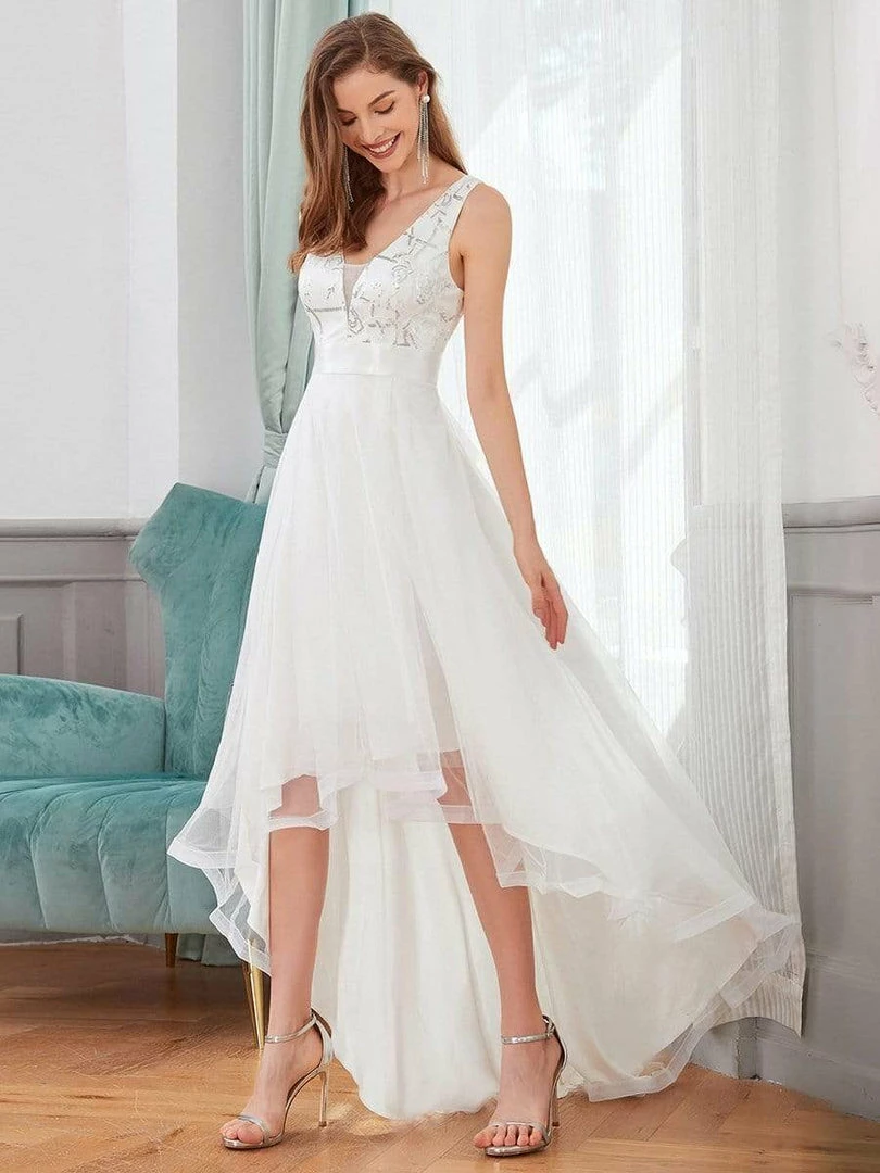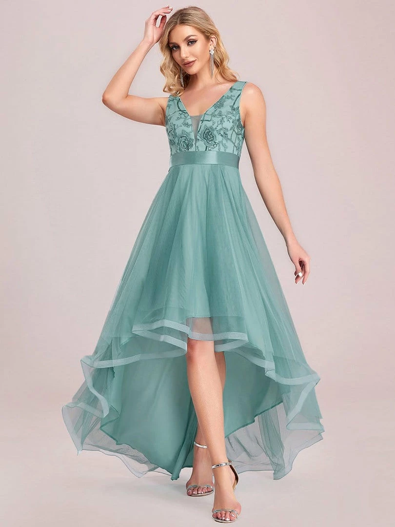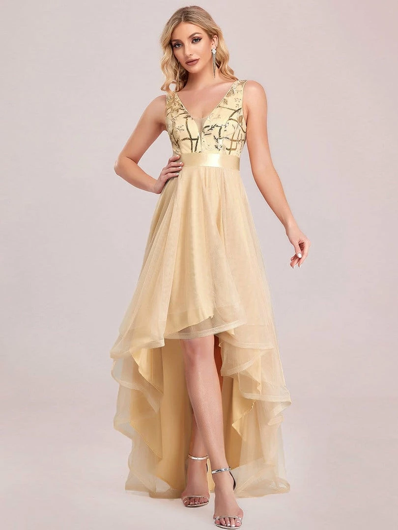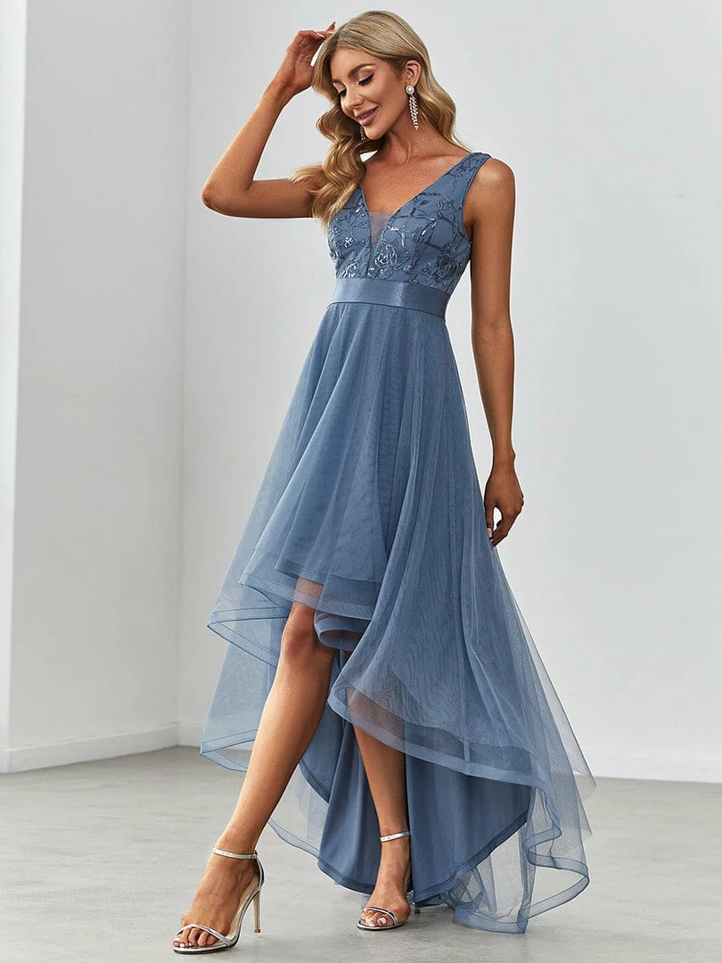 A true customer favorite! This gorgeous evening dress features a sexy double deep V neckline, a sequins lace bust and long high low silhouette which allows you to walk and dance all night long without tripping over your hem. This stunning evening dress is perfect for evening party, cocktail, prom, homecoming, graduation, weddings, and any other formal affair!Prices will vary as certain colors of this style is on sale.