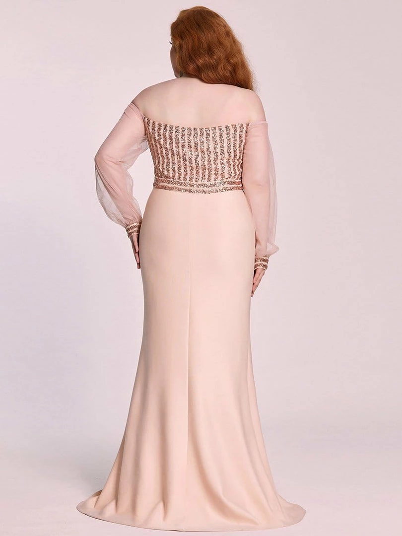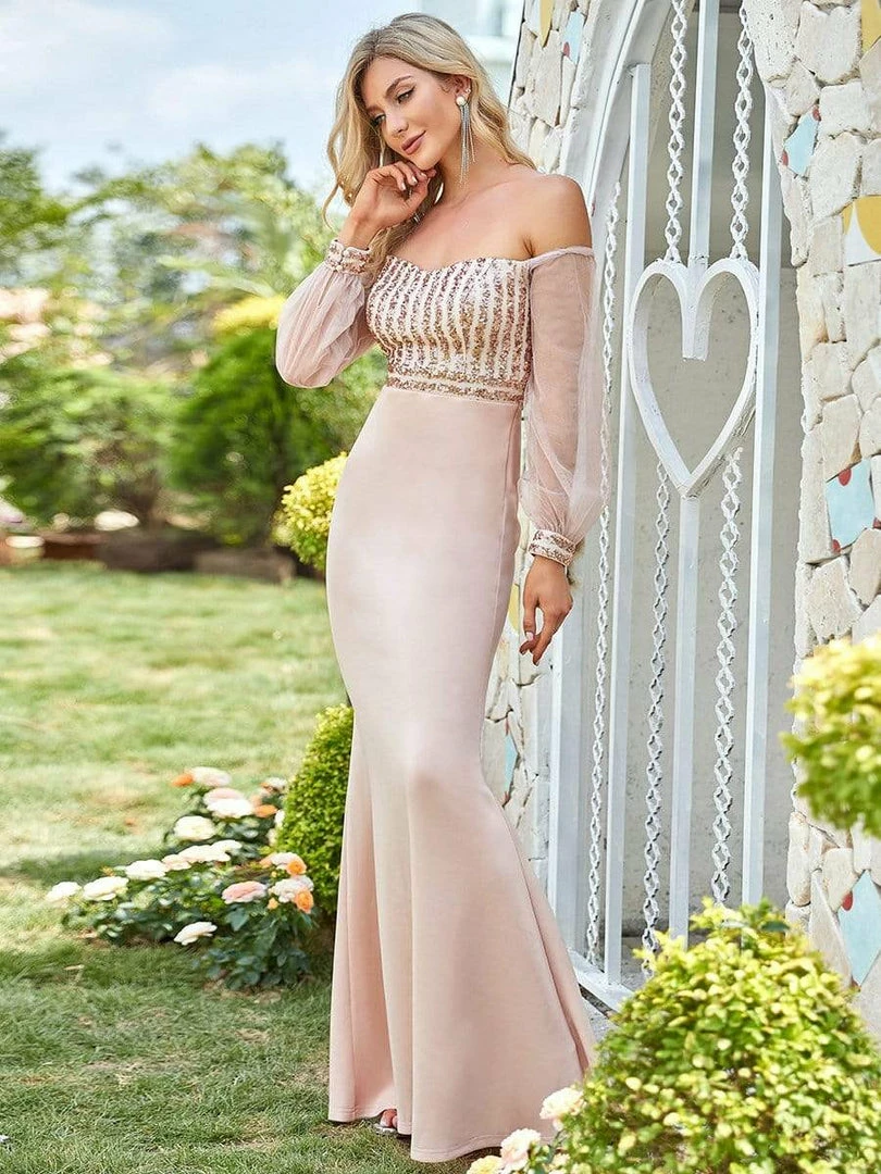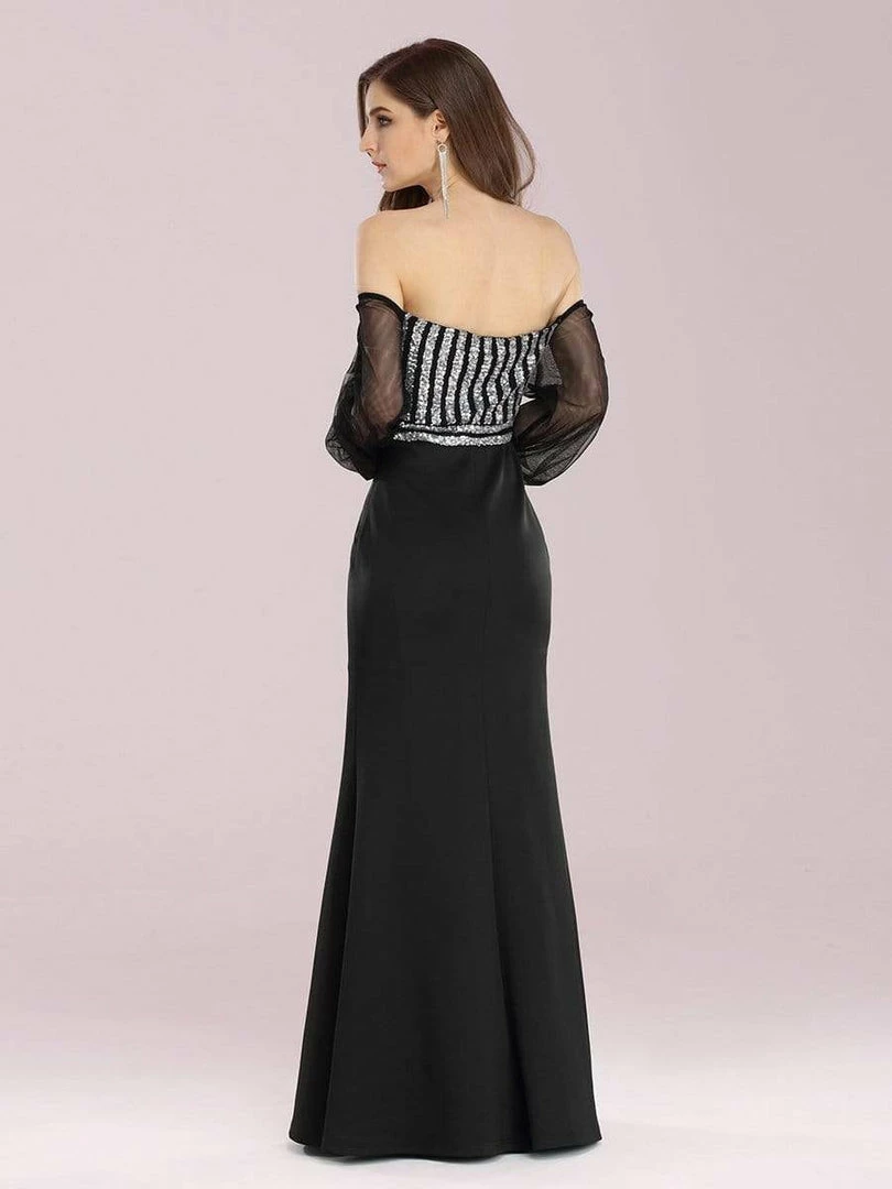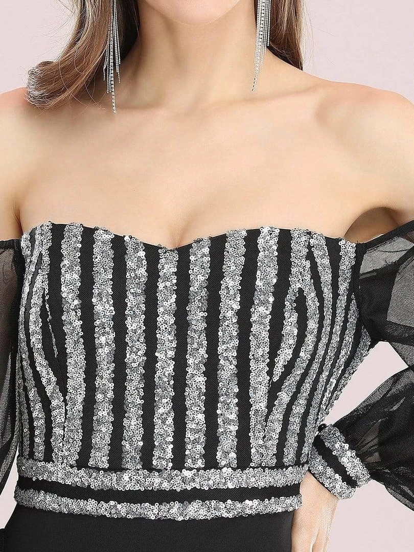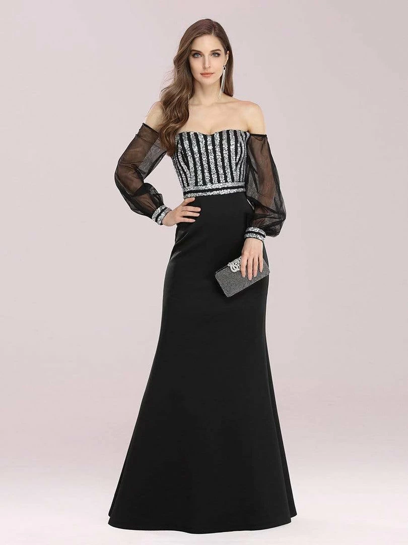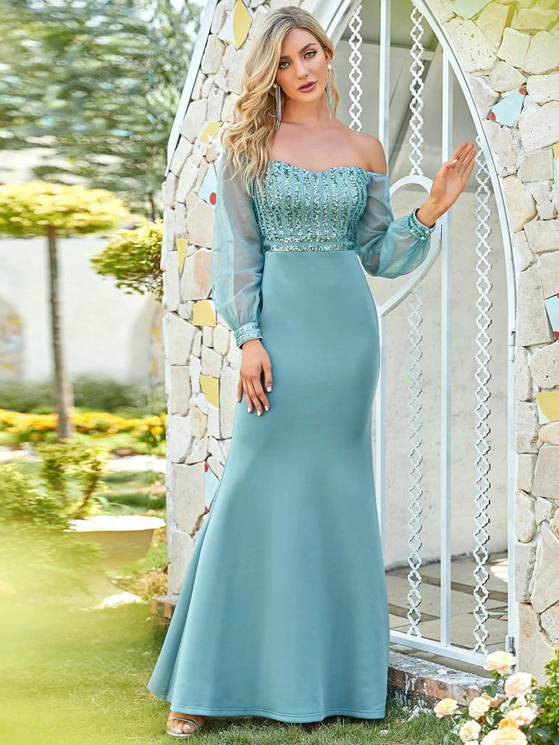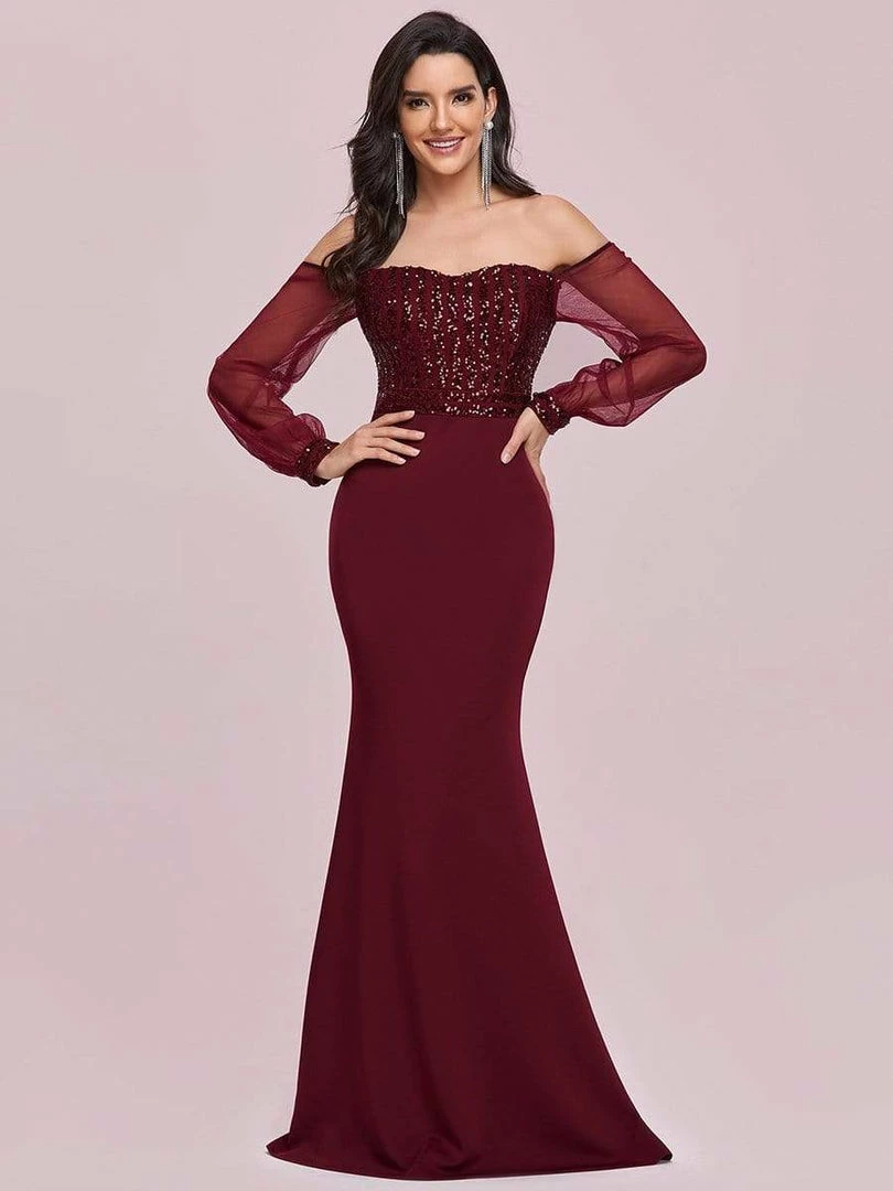 This sexy off the shoulder evening dress features a sequins top, sheer puff sleeves and a fishtail skirt which is designed to hug your curves and flare out at the hem. It is a perfect choice for any formal occasion, such as evening, party, cocktail, prom, homecoming, graduation, weddings!