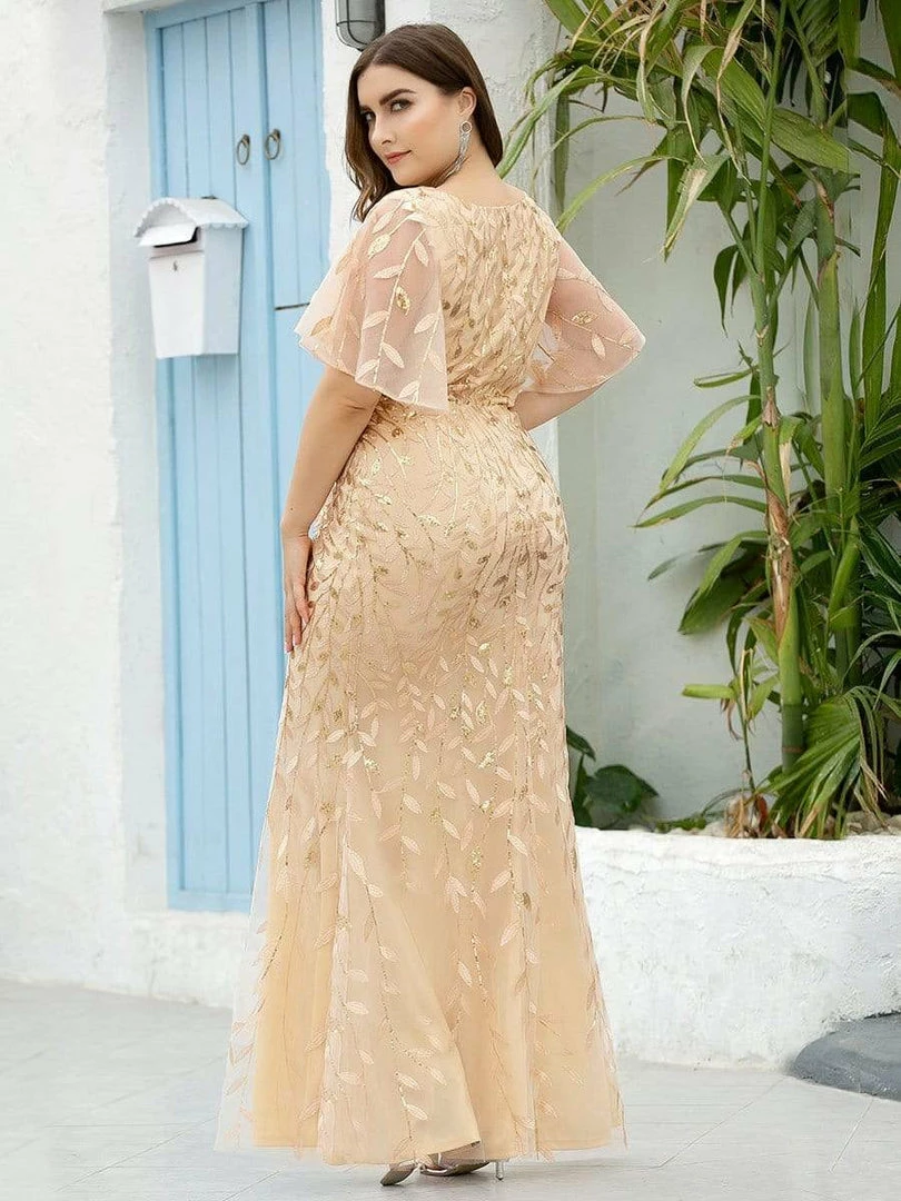 Want to look like a princess from a fairy tale? If yes, then this plus size dress would surely make you look like one. It has a fishtail silhouette and beautiful ruffles sleeves. This dress features a plunging v-neckline and a belt for the waistline. Wear this dress and make every woman jealous. We think this gorgeous evening dress is perfect for all formal occasions, from evening party, cocktail, weddings to prom, homecoming and graduation!