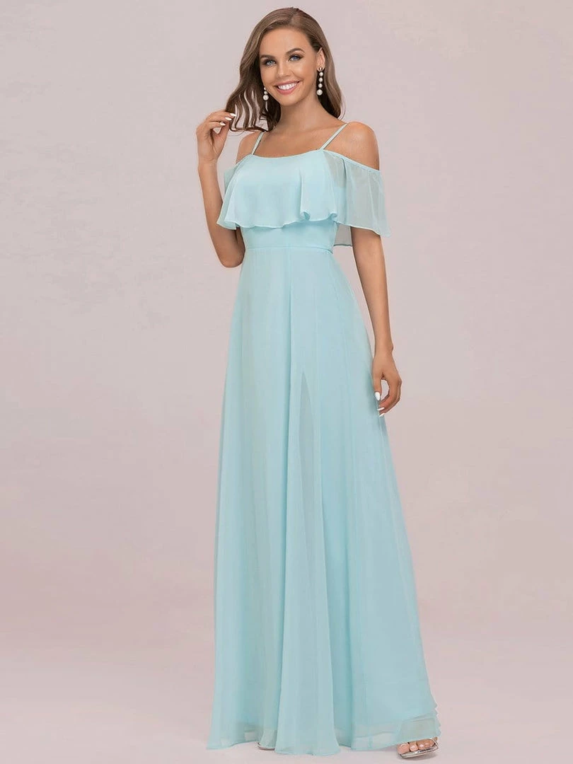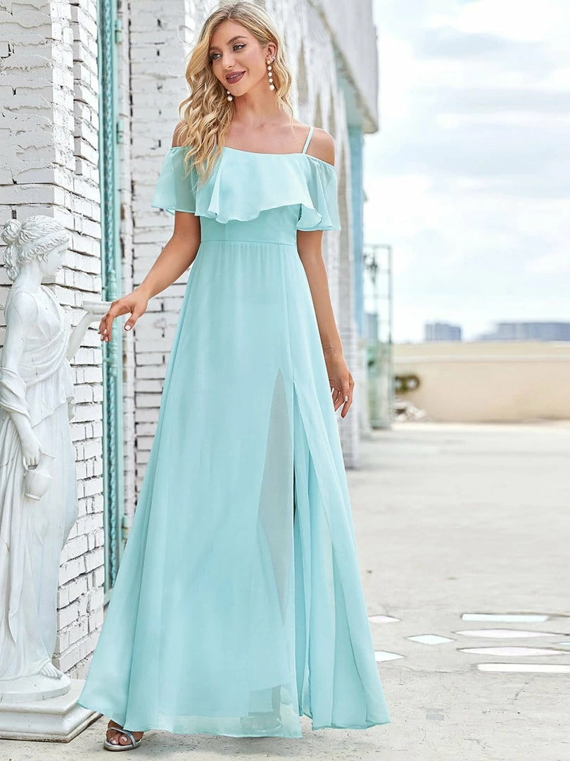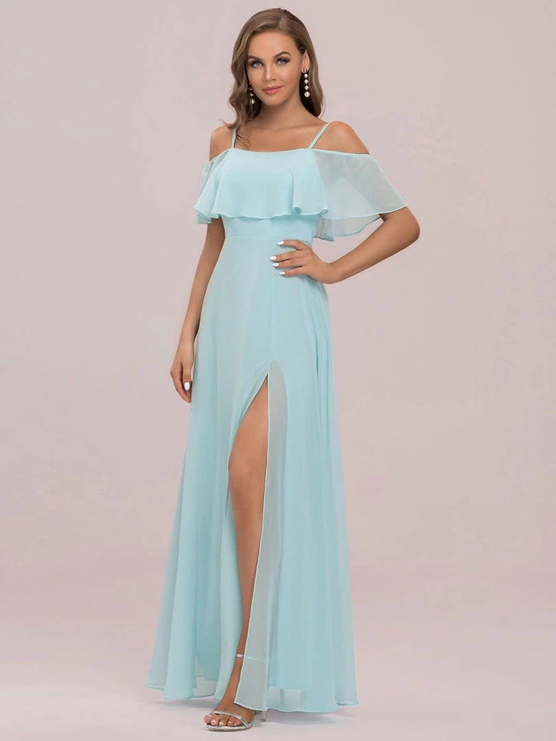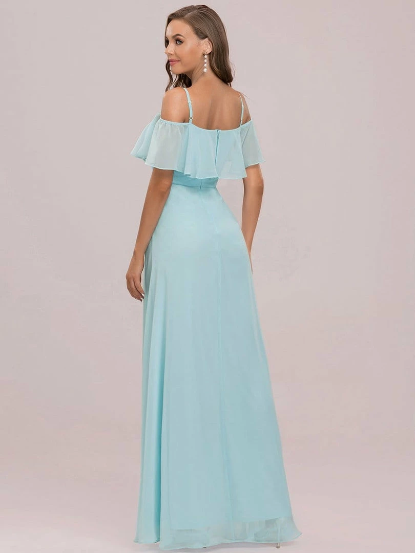 This flattering chiffon bridesmaid dress features lotus leaf, and the waist-skimming design can better highlight your figure. The chiffon skirt gives this beautiful bridesmaid dress flattering vibes, perfect for any wedding theme. Wear this flattering bridesmaid dress for a wedding, formal event, banquet, or other special occasions.