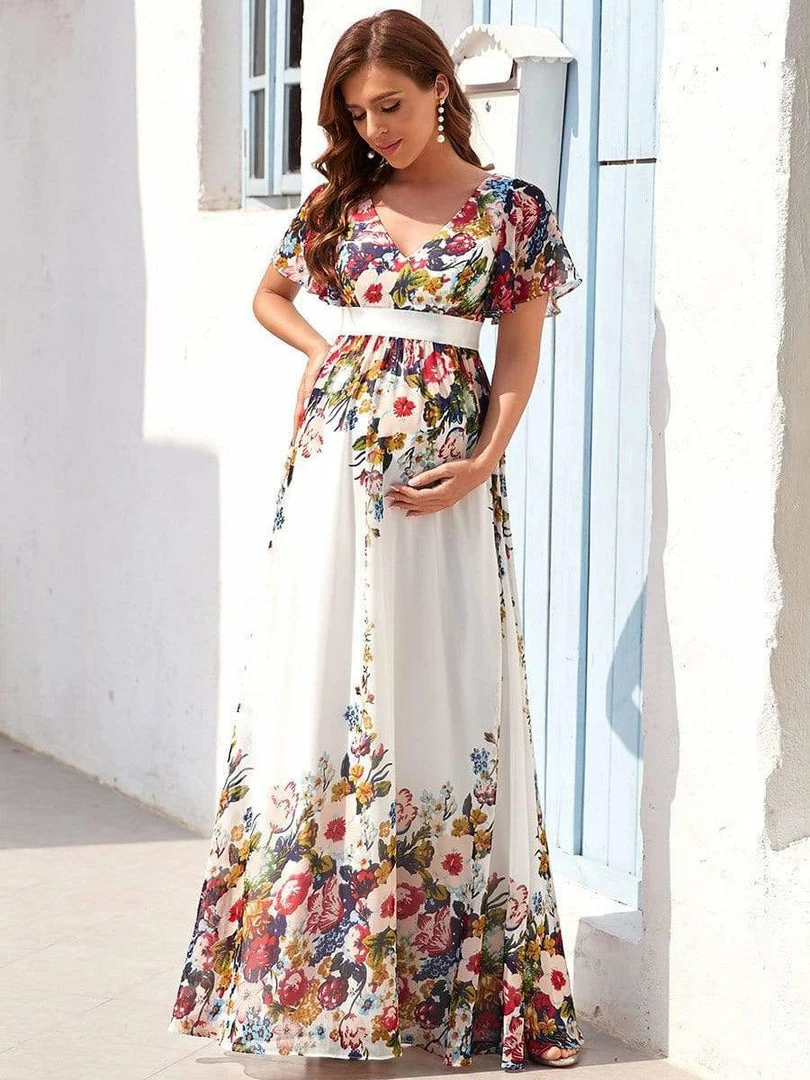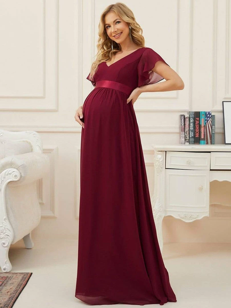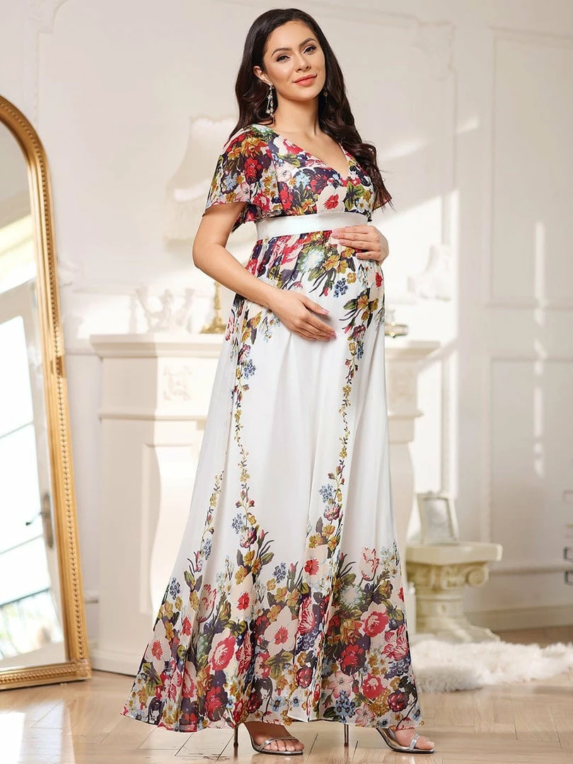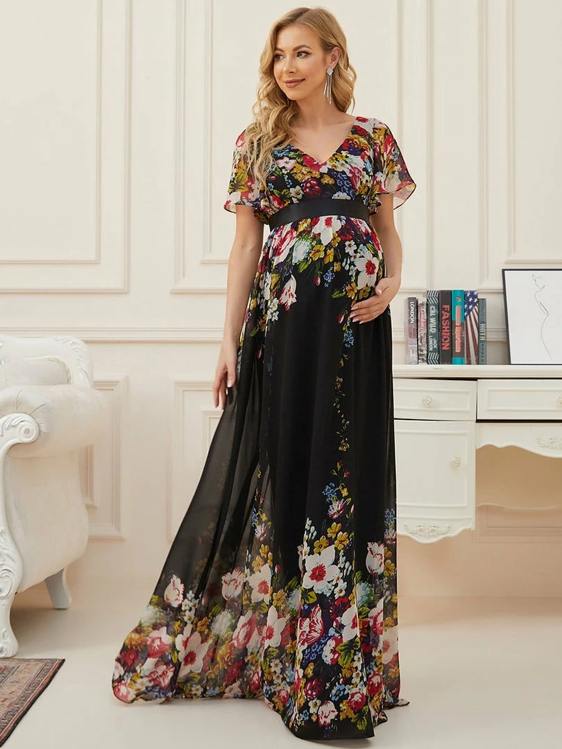 This gorgeous v-neck short sleeve maternity dress features a flattering and elegant A-line silhouette, along with a cinched ribbon waist, showing off your growing baby bump with understated sophistication. This unique floor-length bump friendly dress is the perfect selection for formal attire events. Mix and match this easy-to-wear bump friendly dress with different shoes.