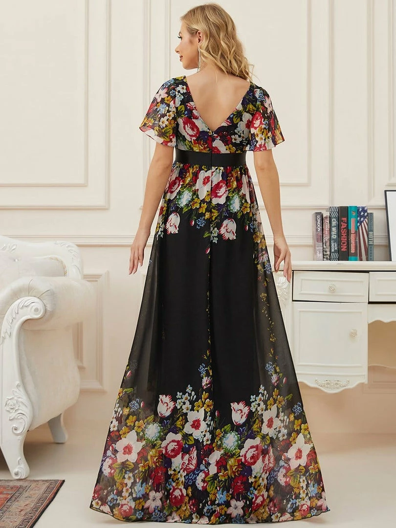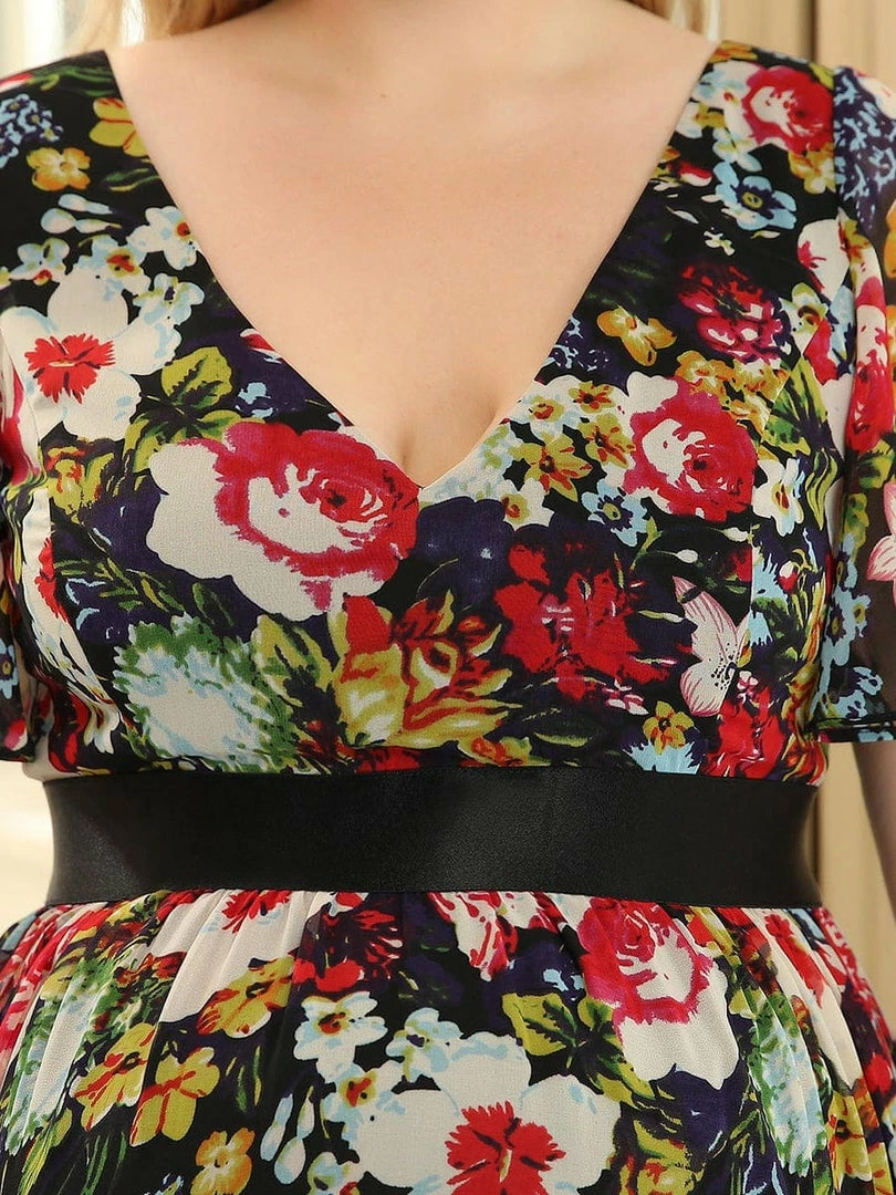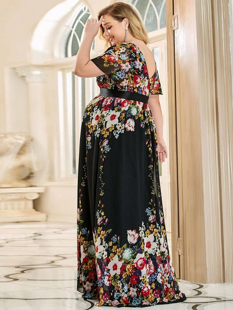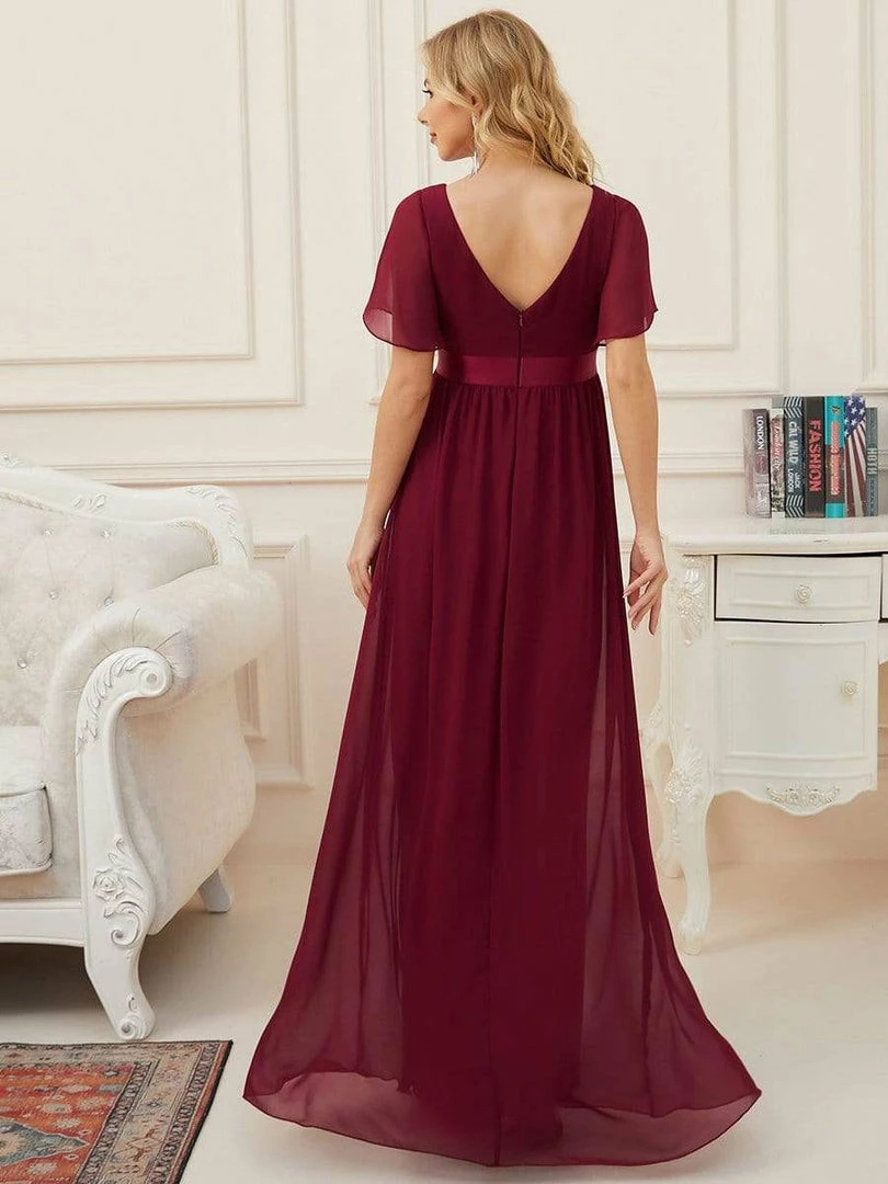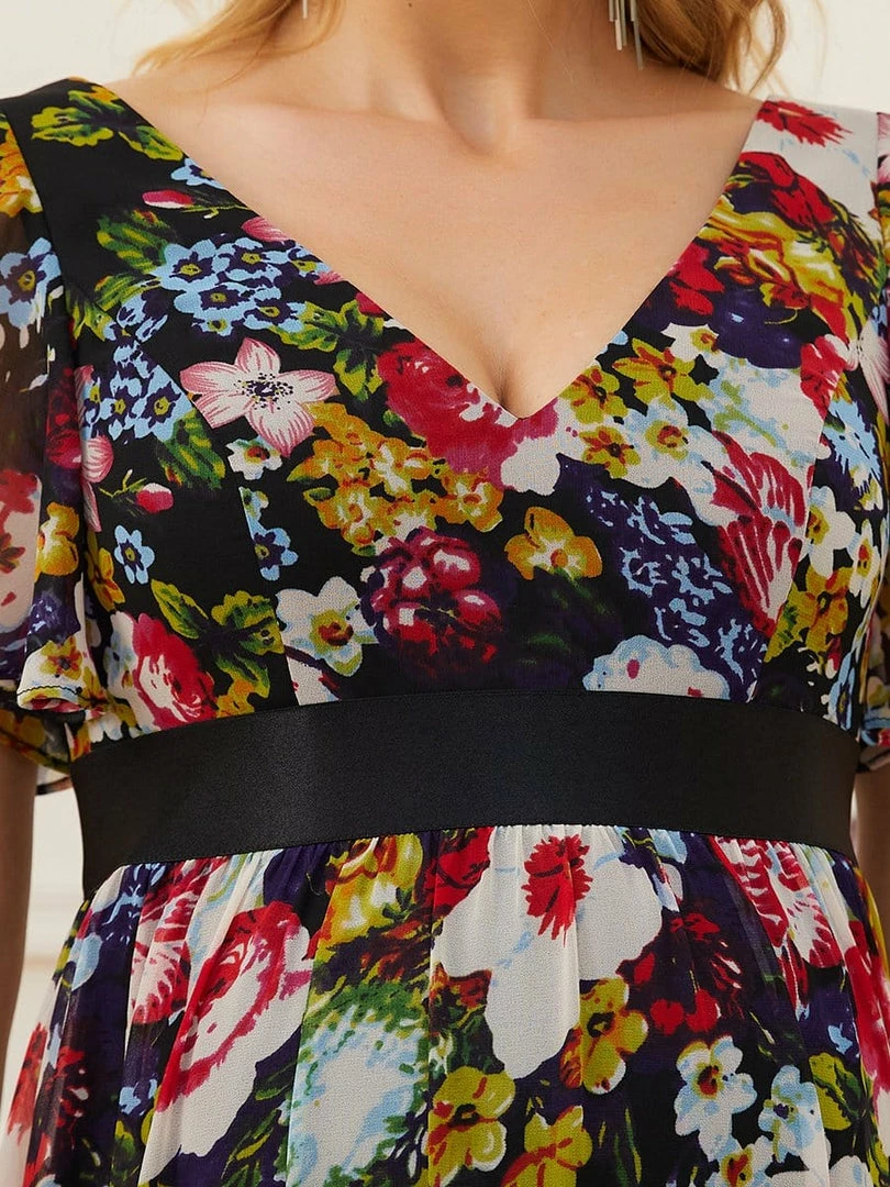 This gorgeous v-neck short sleeve maternity dress features a flattering and elegant A-line silhouette, along with a cinched ribbon waist, showing off your growing baby bump with understated sophistication. This unique floor-length bump friendly dress is the perfect selection for formal attire events. Mix and match this easy-to-wear bump friendly dress with different shoes.