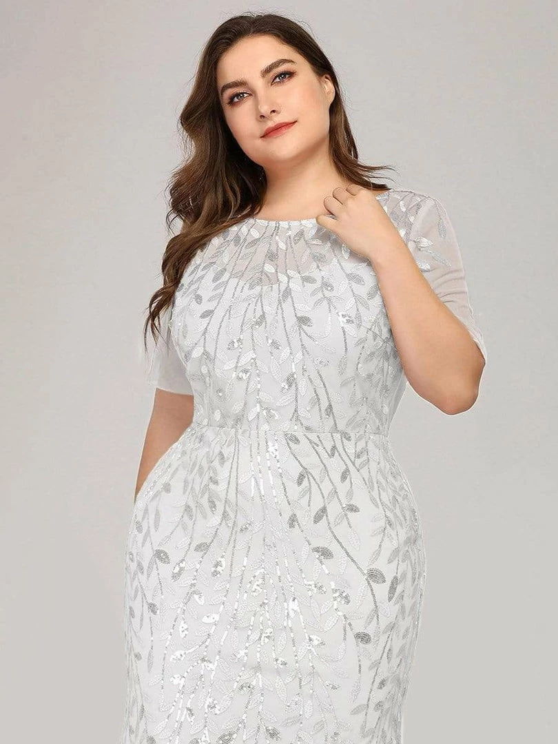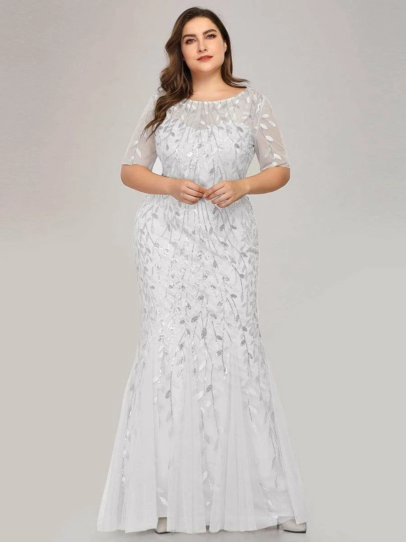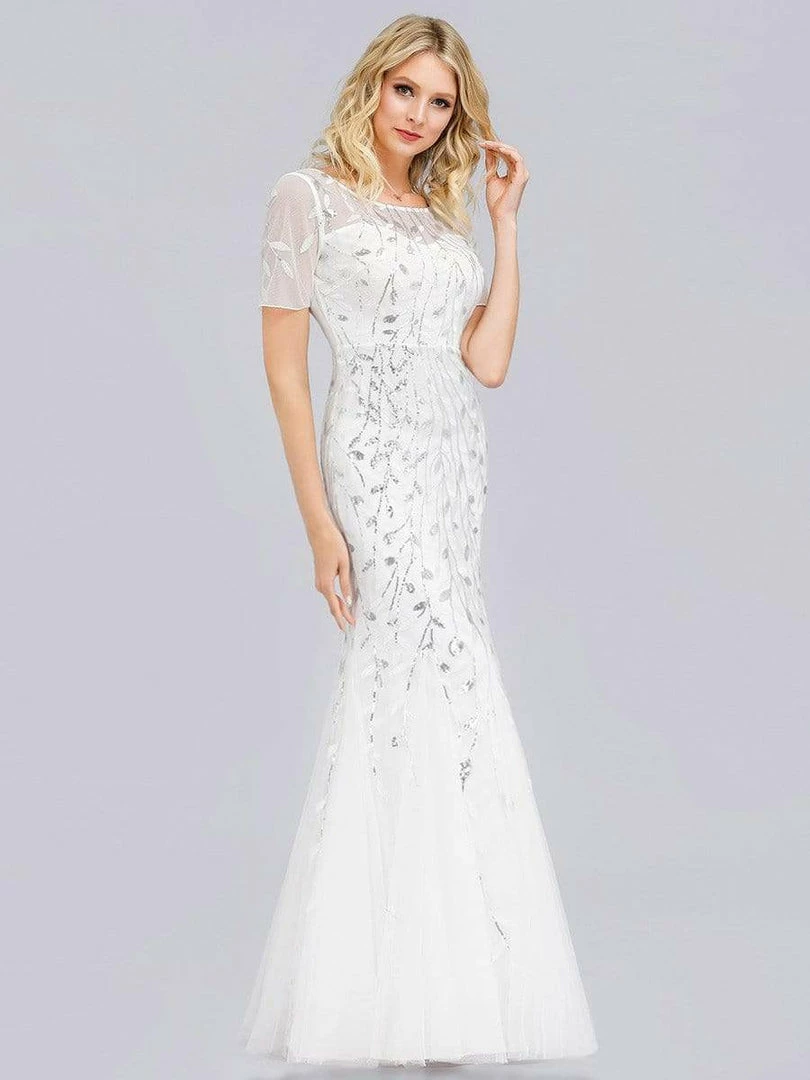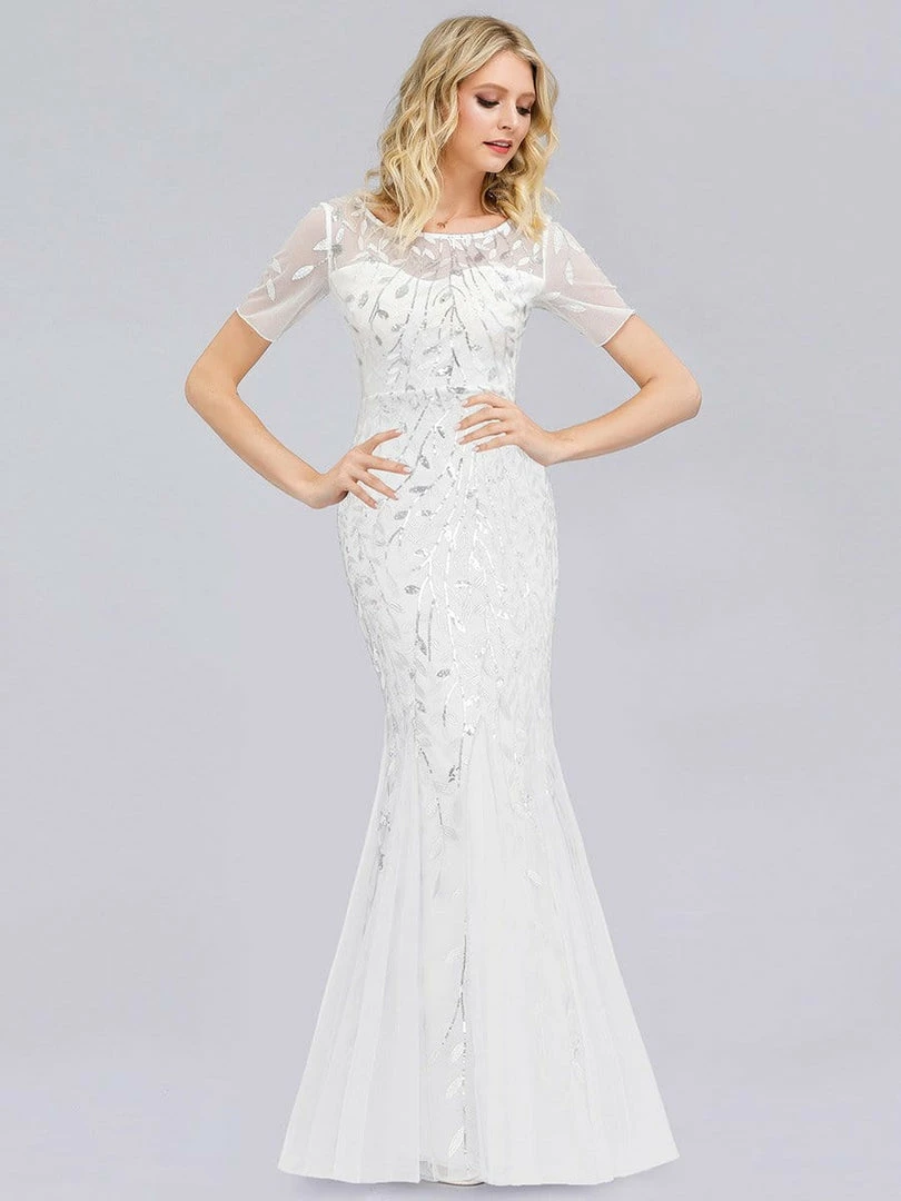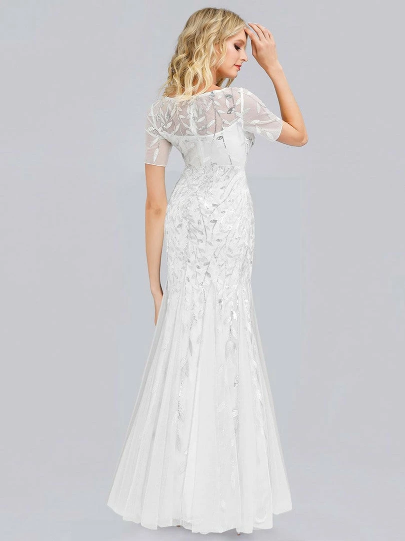 This gorgeous sequined tulle wedding dress oozes romance with its shimmery leave design and a sheer round neckline. It is a perfect choice for brides who are looking for an elegant look, but its delicate details add just enough flair to show your taste. Get for your big day and show off your perfect figure now!