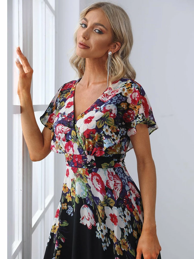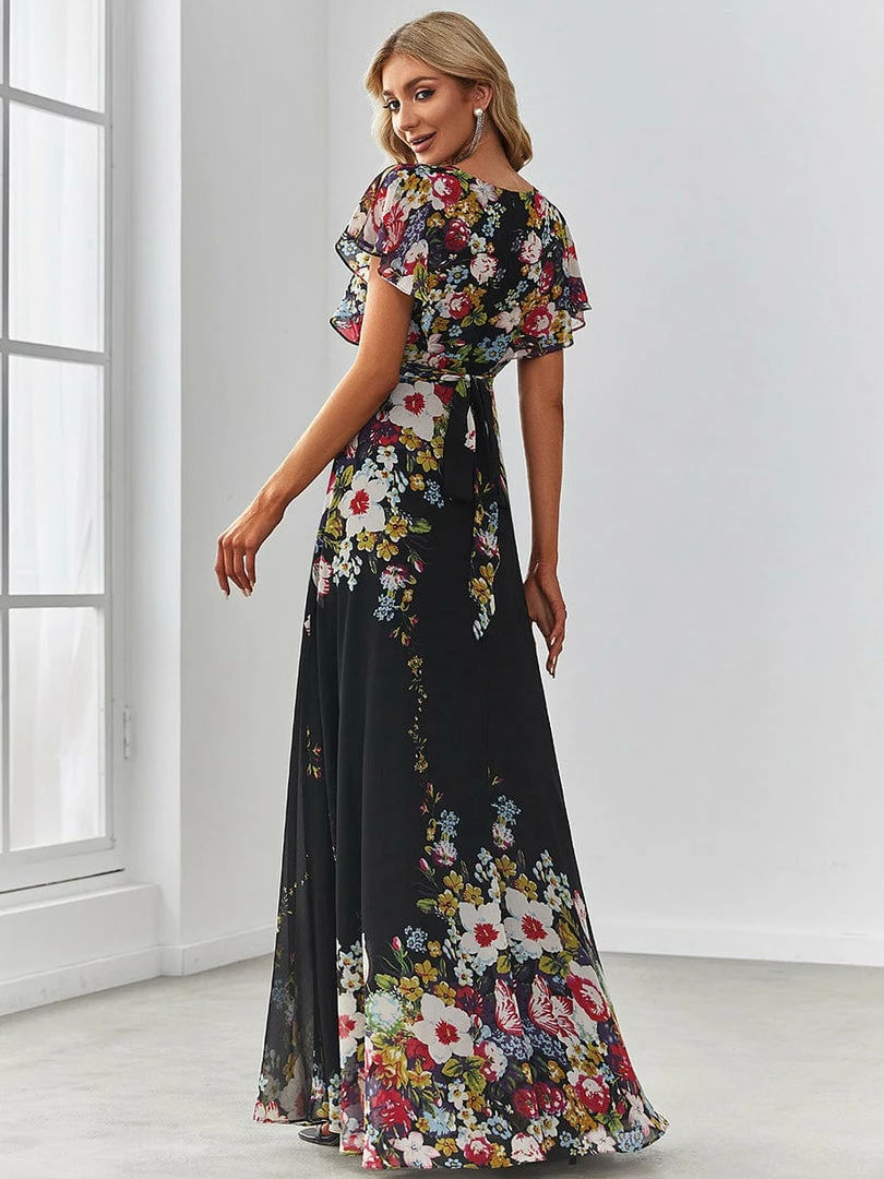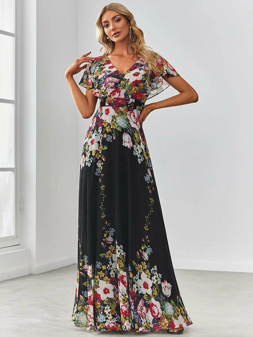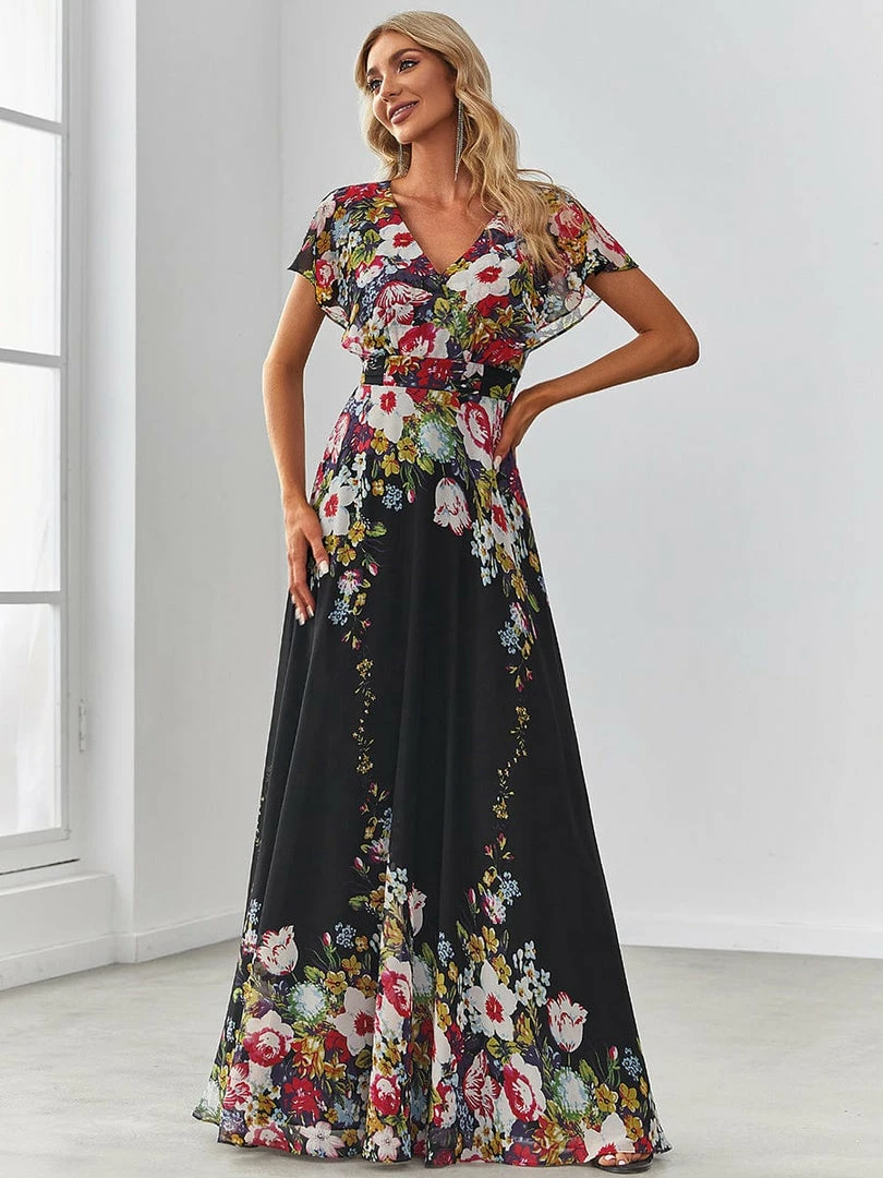 This stunning semi-formal or formal chiffon A-line dress features a cinched waist and fold-over v-neckline with short flutter sleeves. A flowing floor-length silhouette and beautiful printed colors give this pretty dress the perfect balance of details and classic style. Finish your look with heels or flats.