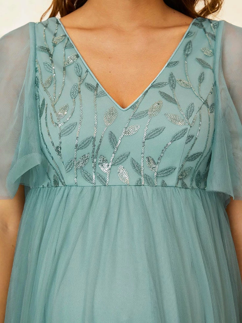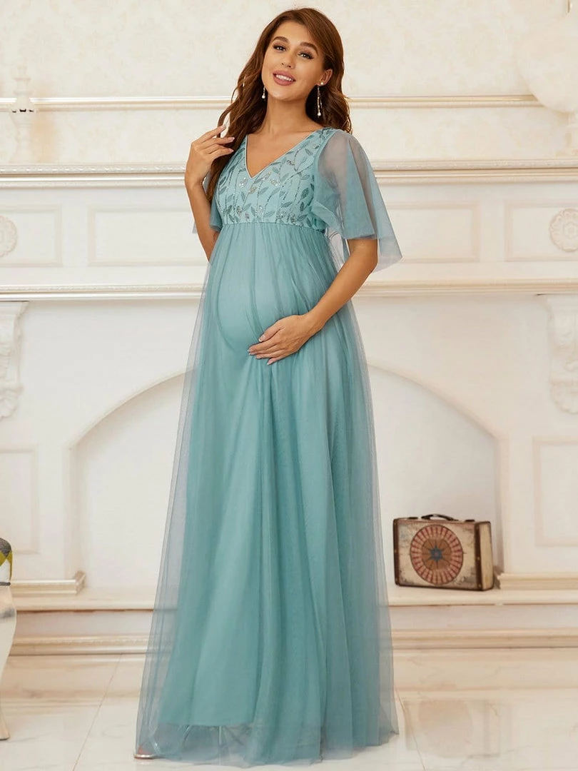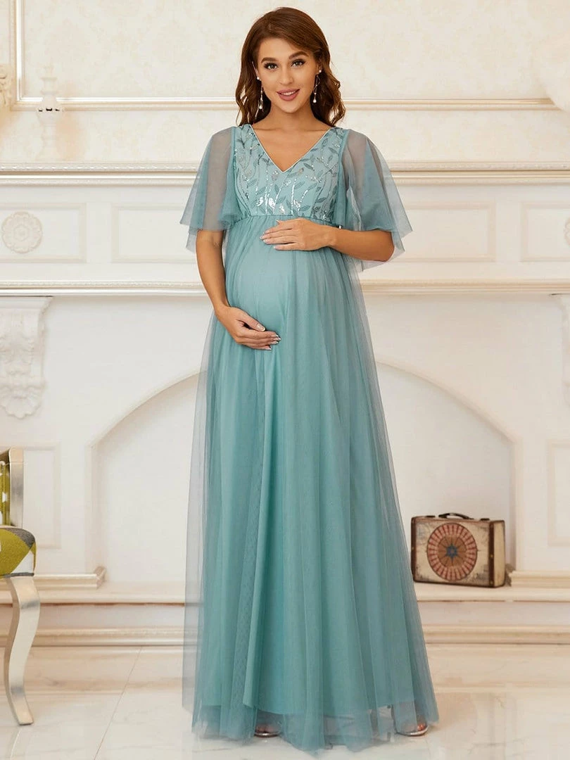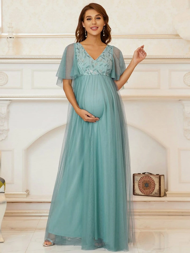 This feminine deep V-neck floor-length maternity dress features a gorgeous sequin top and cinched waist, giving this maternity dress an upscale look perfect for your next formal event. The cinched waist and A-line fit flatter any figure type, making it easy to pair with different shoes.