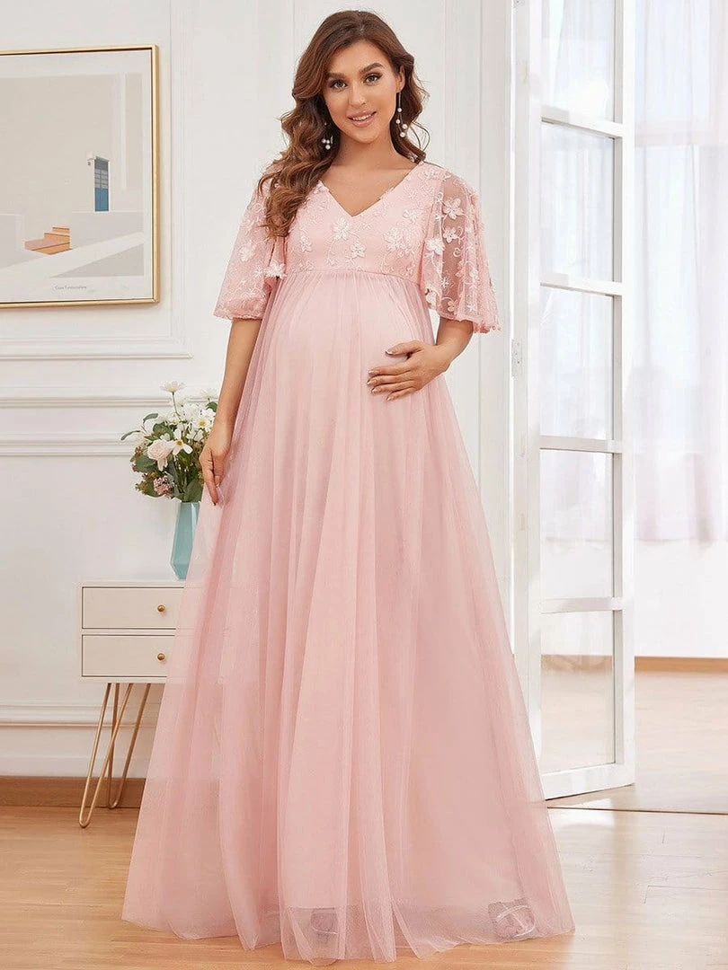 This A-line embroidered maternity dress can be worn to a bridal shower, a wedding, as a bridesmaid dress, and so much more with its classic look featuring a floral lace top and floor-length fit.