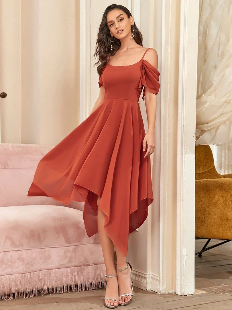 This midi-length cold shoulder bridesmaid dress will add a unique detail to your wedding day, ideally suited for warmer months or year-round. Slim spaghetti straps, graceful gathered off-shoulder capped sleeves, a bodycon fit, and uneven hem make each moment elegant and timeless. Pair it with simple jewelry and heels for a put-together look.
