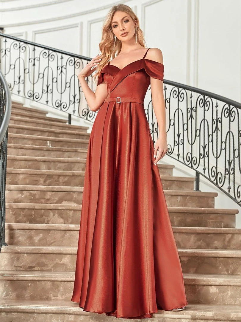This formal dress can be worn to the prom, a wedding, as a bridesmaid dress, and so much more with this stunning floor-length A-line silhouette and luxe jeweled sequin belt, accentuating the waist. A sweetheart cold shoulder neckline and cinched bodice give this evening gown princess vibes, ideal for any picture-taking moment.