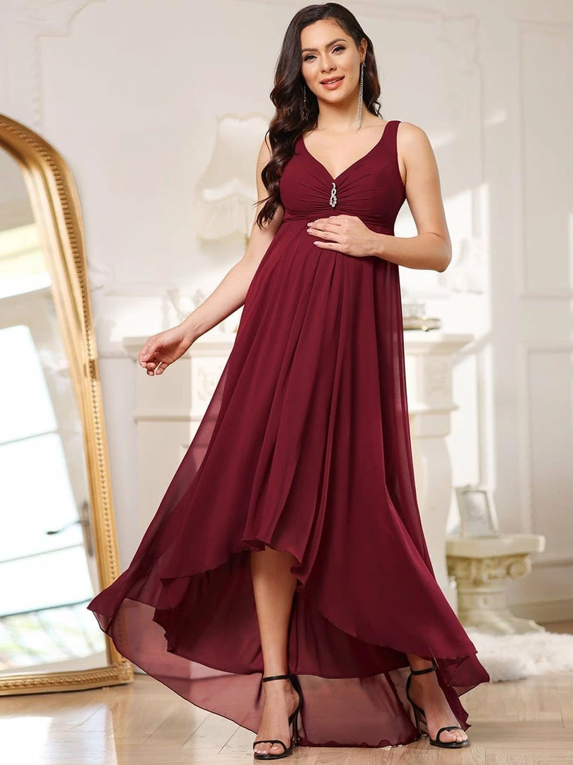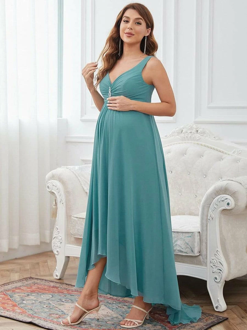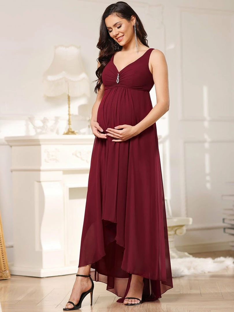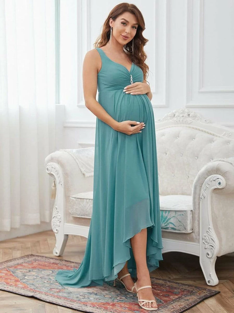 This elegant maternity dress features a decorative jeweled top on a plunging wrapped, supportive v-neckline. A cinched waist and fluttering asymmetrical hem give way to a floor-length maternity dress that exudes a glamorous, show-stopping appearance perfect for any formal occasion.