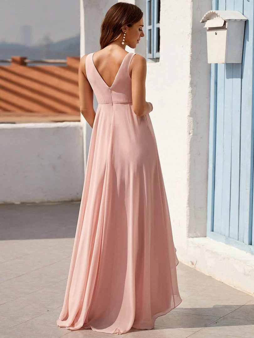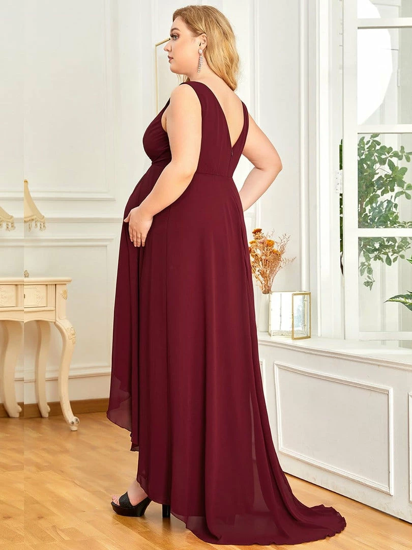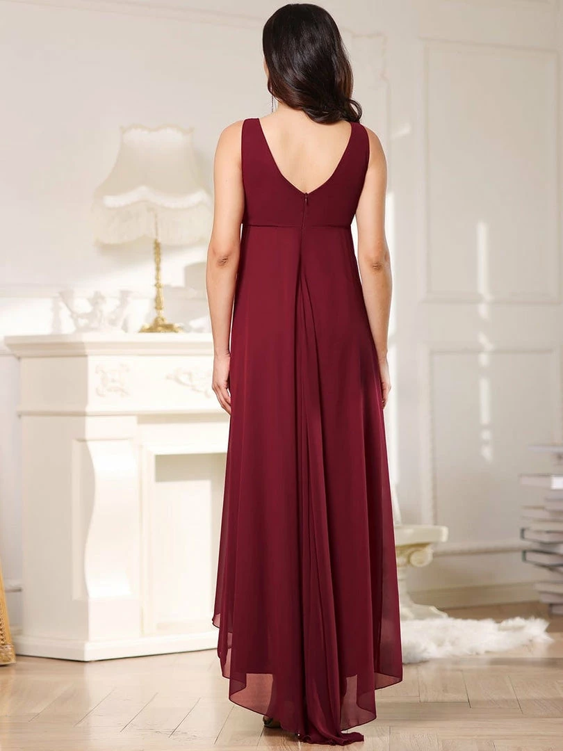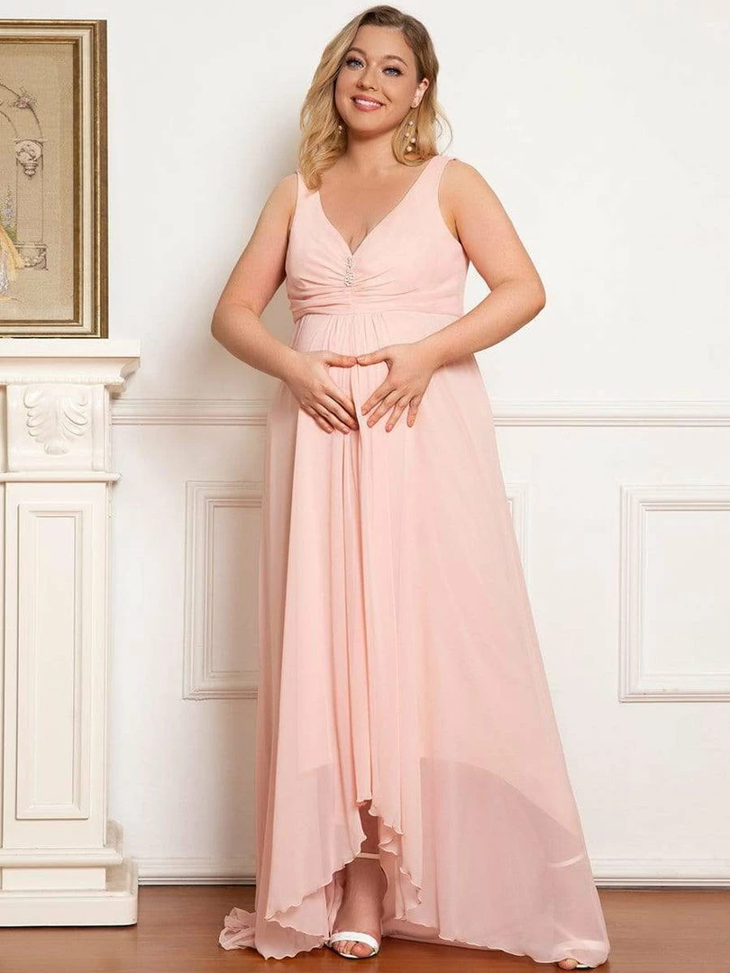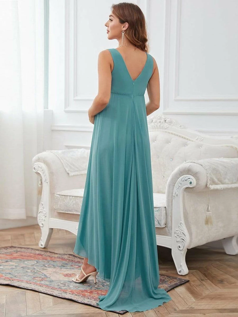 This elegant maternity dress features a decorative jeweled top on a plunging wrapped, supportive v-neckline. A cinched waist and fluttering asymmetrical hem give way to a floor-length maternity dress that exudes a glamorous, show-stopping appearance perfect for any formal occasion.