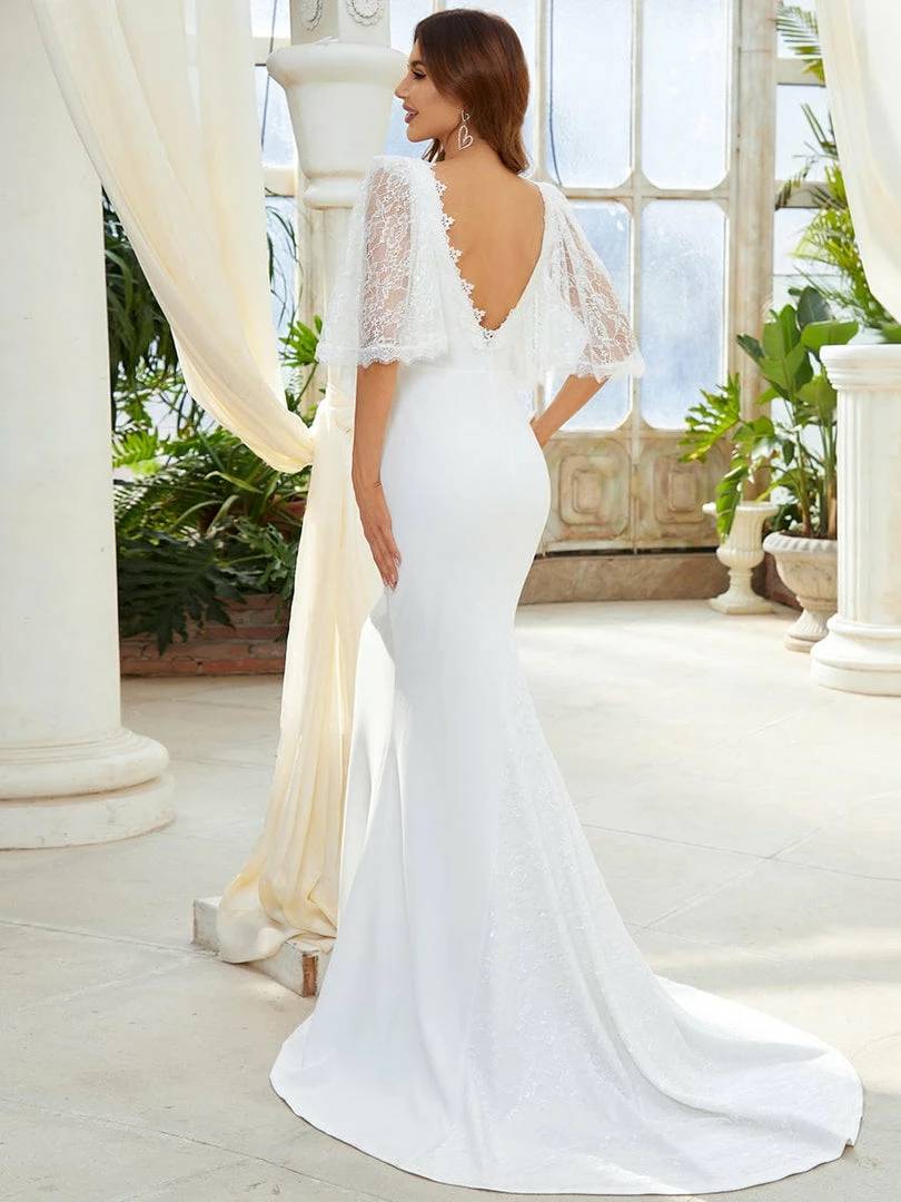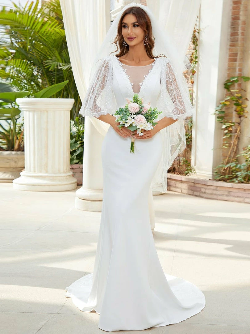 This unique and breathtaking vintage lace bridal gown features wide bell sleeves and a plunging illusion panel v-neckline. The cinched bodice gives way to a flowing mermaid silhouette, balancing out all the gorgeous style elements to perfection. Wear this fishtail wedding dress year-round and pair it with white heels or metallic heels.