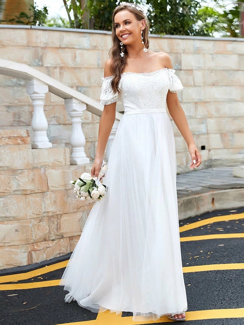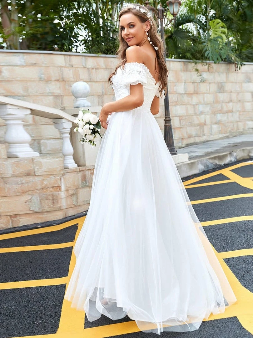 This stunning lace strapless cold shoulder wedding dress has a body-conscious bodice and cinched waist that gives way to a billow floor-length tulle skirt. Perfect for those who are seeking a vintage style, this effortless A-line wedding dress awaits your selection.
