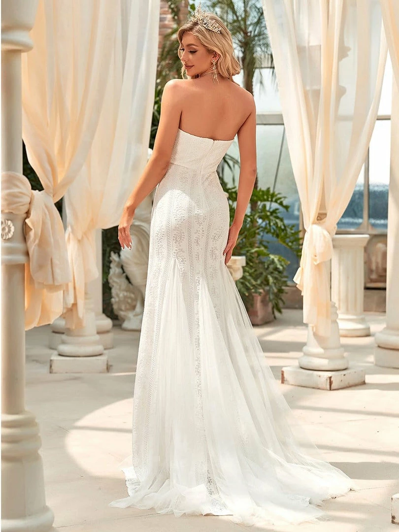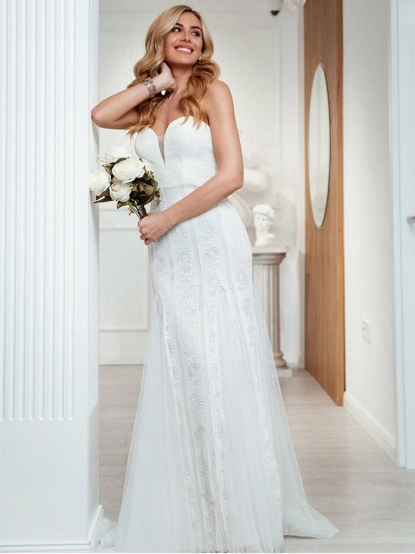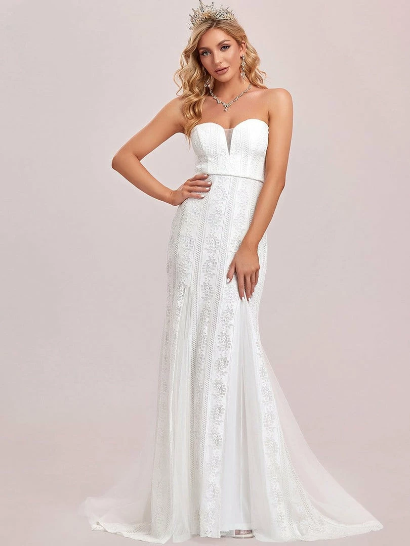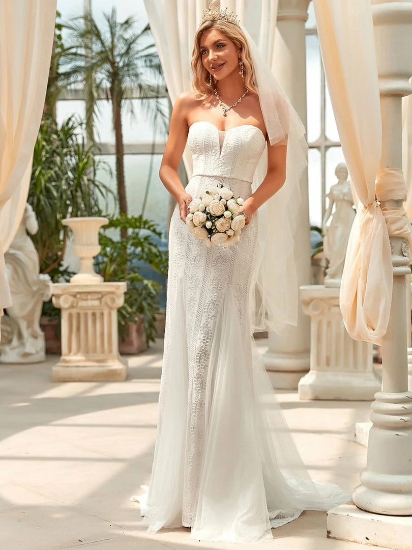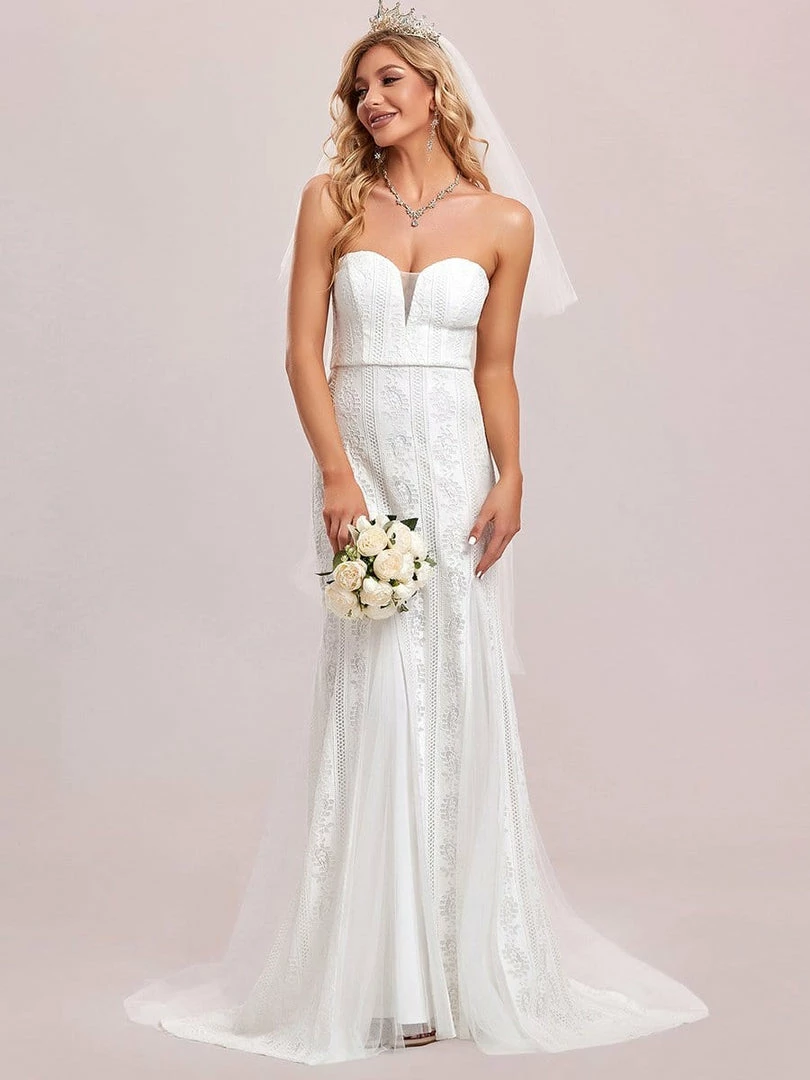 This tulle mermaid wedding dress has a gorgeous all-over floral and striped lace in fresh white. A strapless sweetheart neckline with an illusion panel, a cinched waist, and a mermaid silhouette give this bridal gown a unique style that is timeless, demure, and classic.