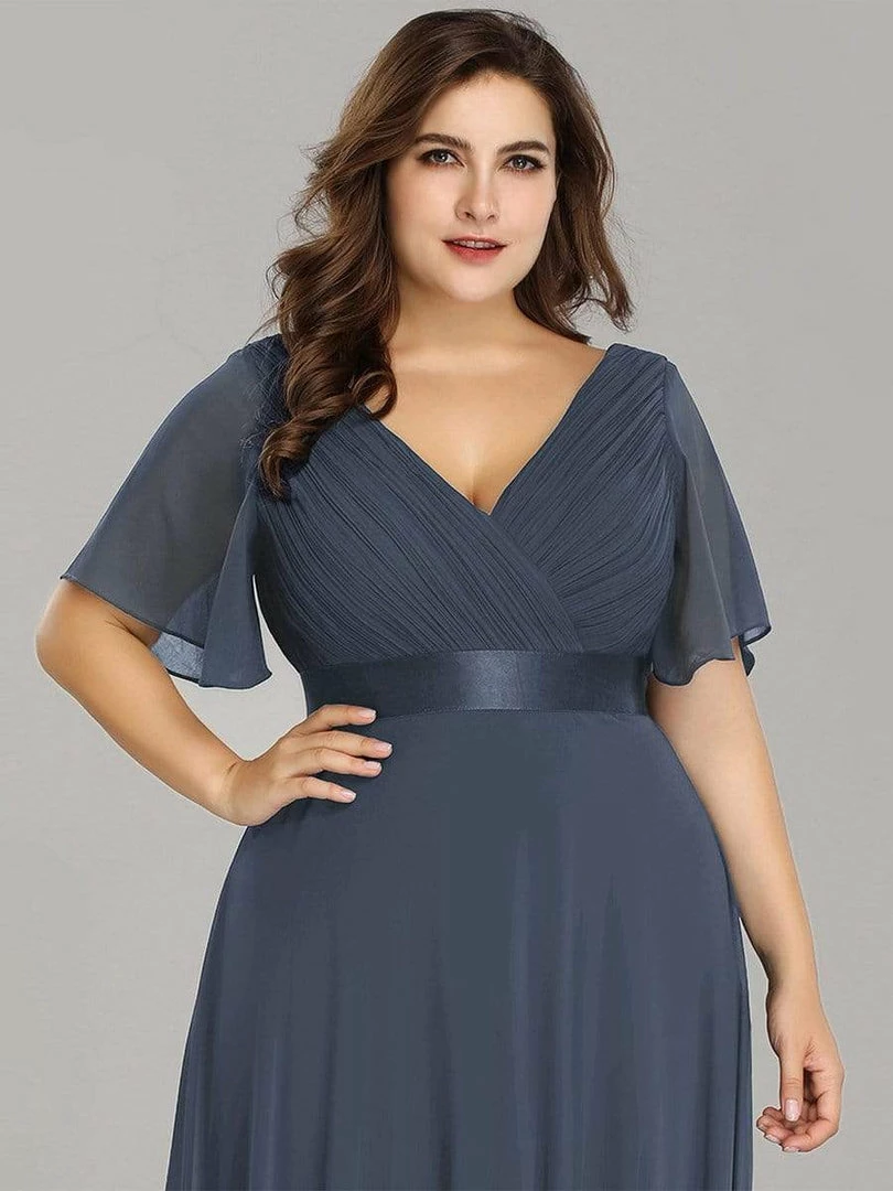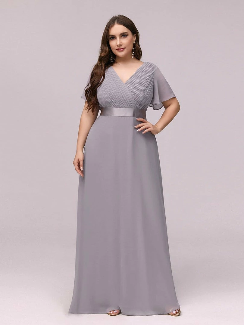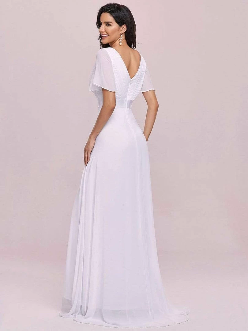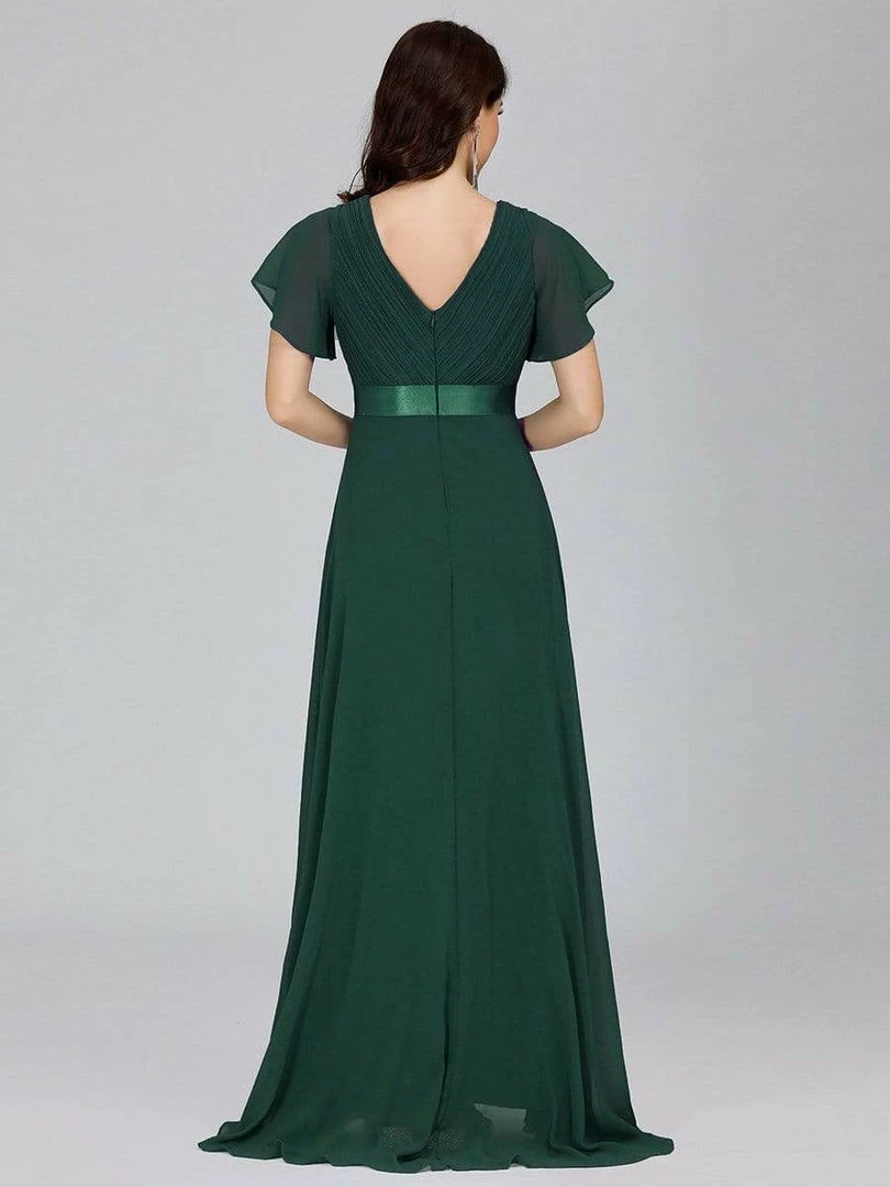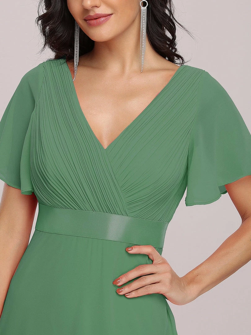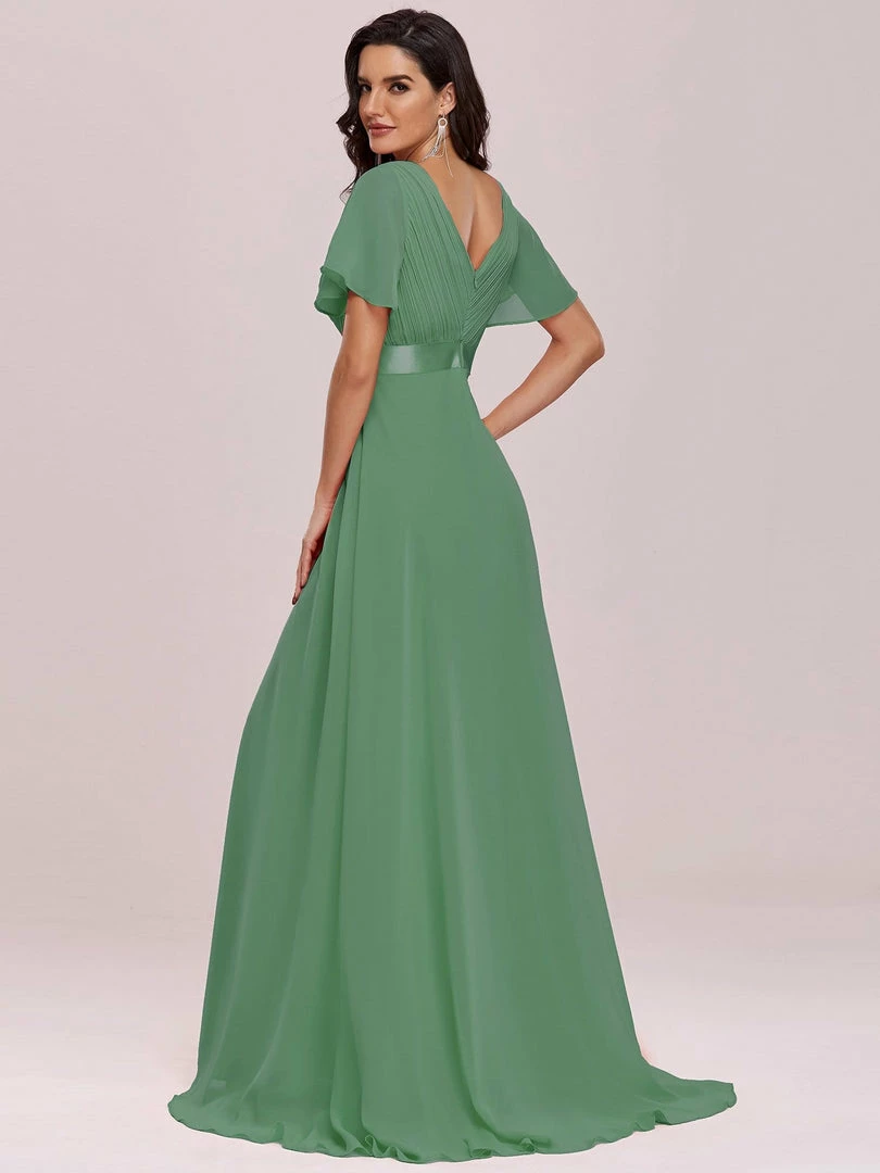 This beautiful flutter sleeves long chiffon bridesmaid dress features a v neckline, empire waist, flutter sleeves, and subtle high low hemline. If you are looking for a long empire waist chiffon dress for your bridesmaids, then this long flowy bridesmaid dress with short flutter sleeves will be your best choice. It’s perfect for evening party, cocktail, prom, homecoming, graduation, weddings, and any other formal affair!